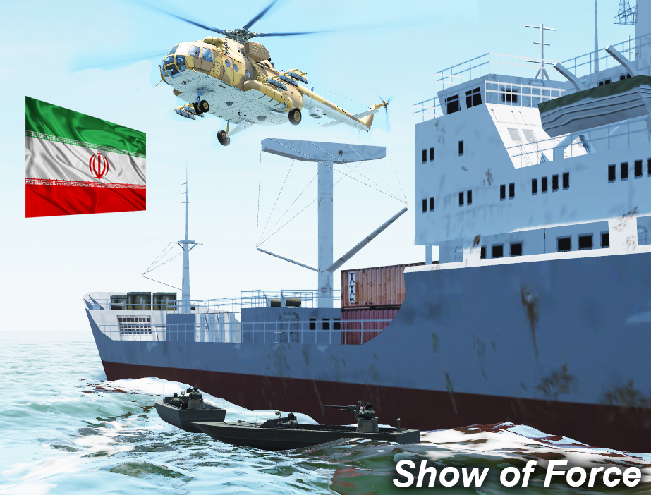 Display a show of force over the Iranian Republican Guard gun boats. Deter them from intercepting and capturing an oil tanker. The mission becomes extended.
