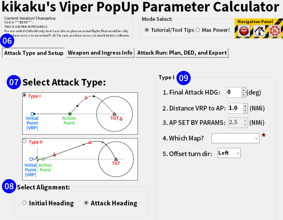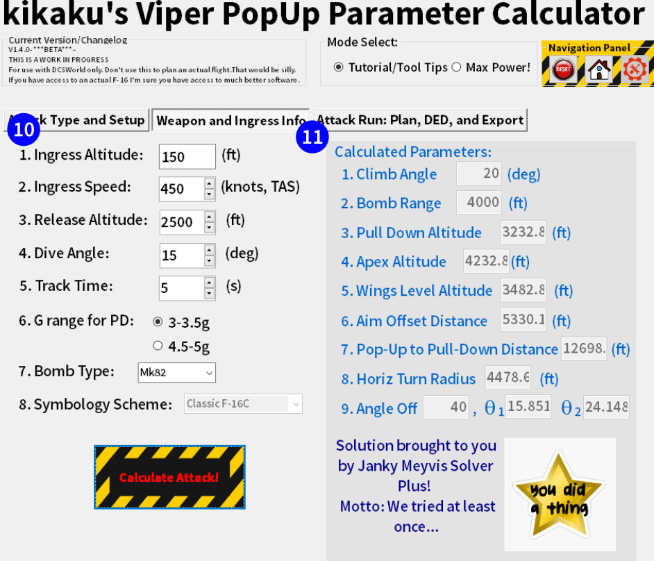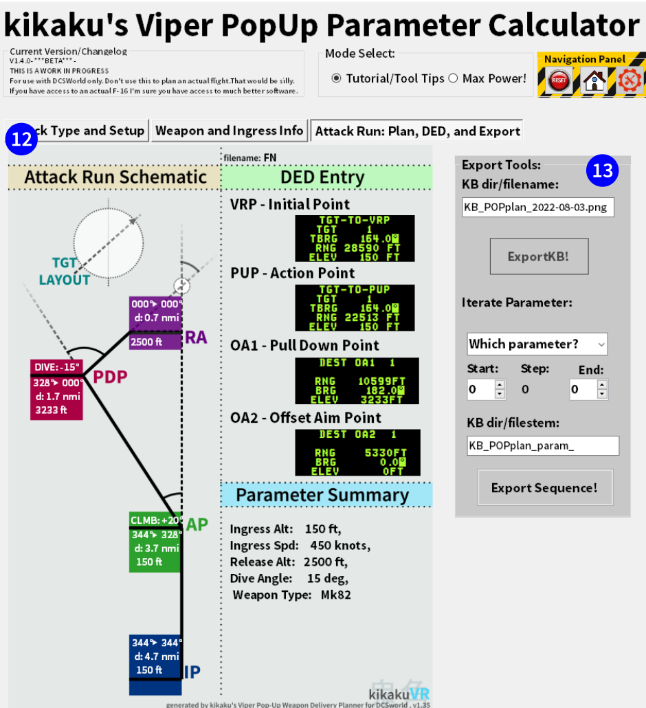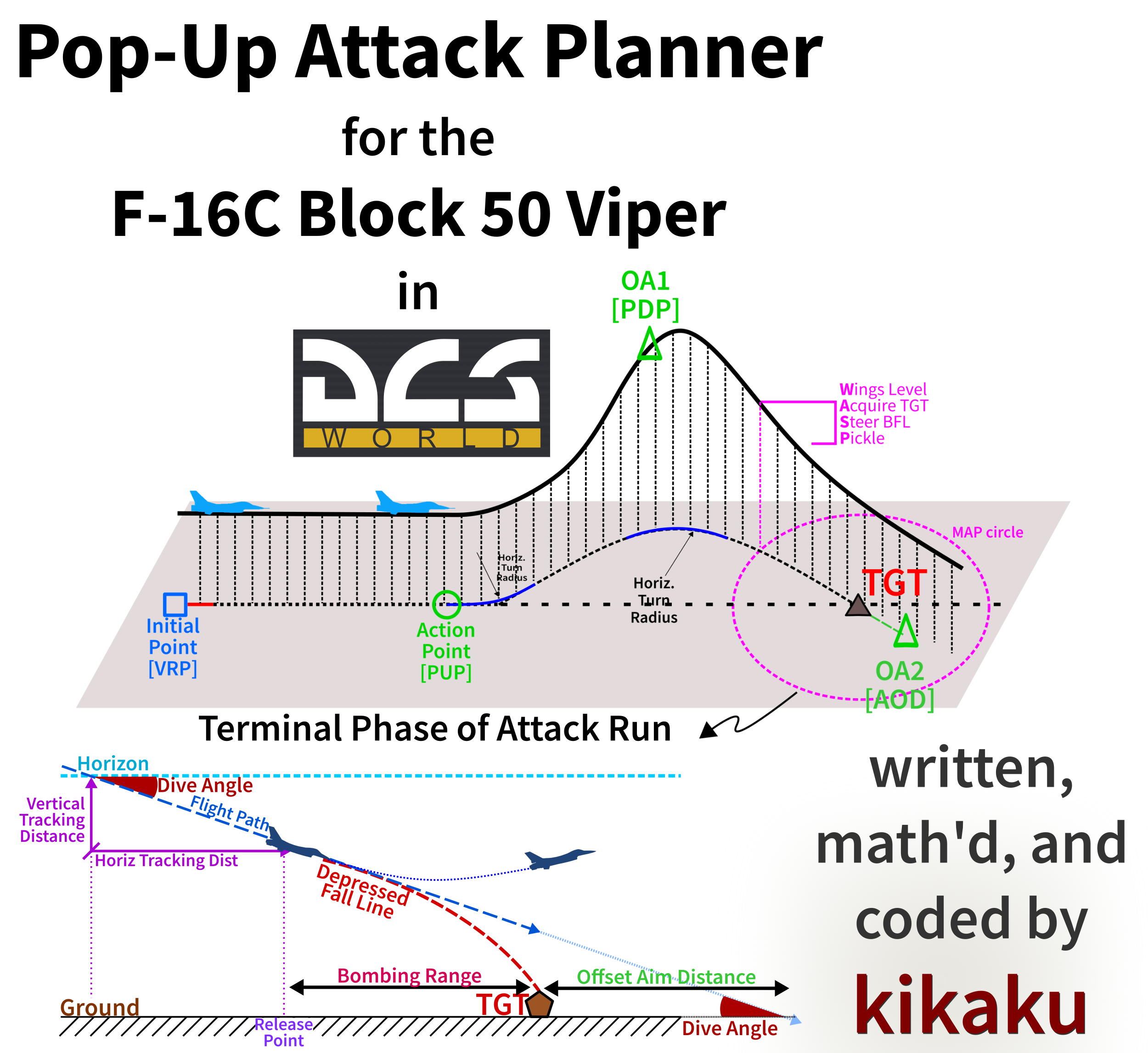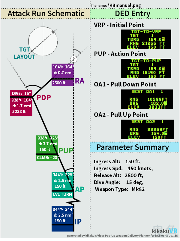 This is a software tool that helps to plan "Pop-Up" attacks in the F-16C that make use of the VRP/PUP/OA1/2 guiding symbology. User parameters are used to calculate the angles, distances, and so forth of the desired attack run and a Kneeboard is exported. The kneeboard has a schematic of the attack run and detailed DED programming parameters generate the HUD/HMD symbology to guide the planned attack run.