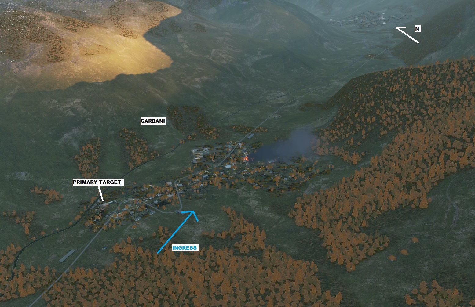 Garbani is located at the base of a ravine between two tall mountain ranges. The terrain will be challenging with only one solid ingress and one solid egress. Watch your speed and positioning. Don't fly straight on the attack! The terrain forces your attack runs to be predictable. Eyes open and never stop moving.