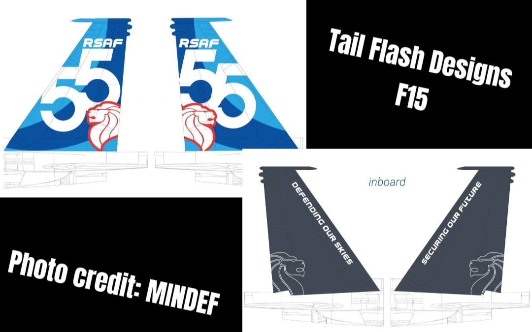 Aircraft tail flashes have long been used as symbols of pride, ownership, and unity among the AirForce. The RSAF55 F-15SG Tail Flash incorporates bold block letters to celebrate a crucial milestone and pride. The blue plane trail, of the RSAF55 Logo, represents our determination to reach greater heights soaring excellence. The Lion Head is also featured in the design that symbolizes the RSAF's dedication to defending Singapore and its people.