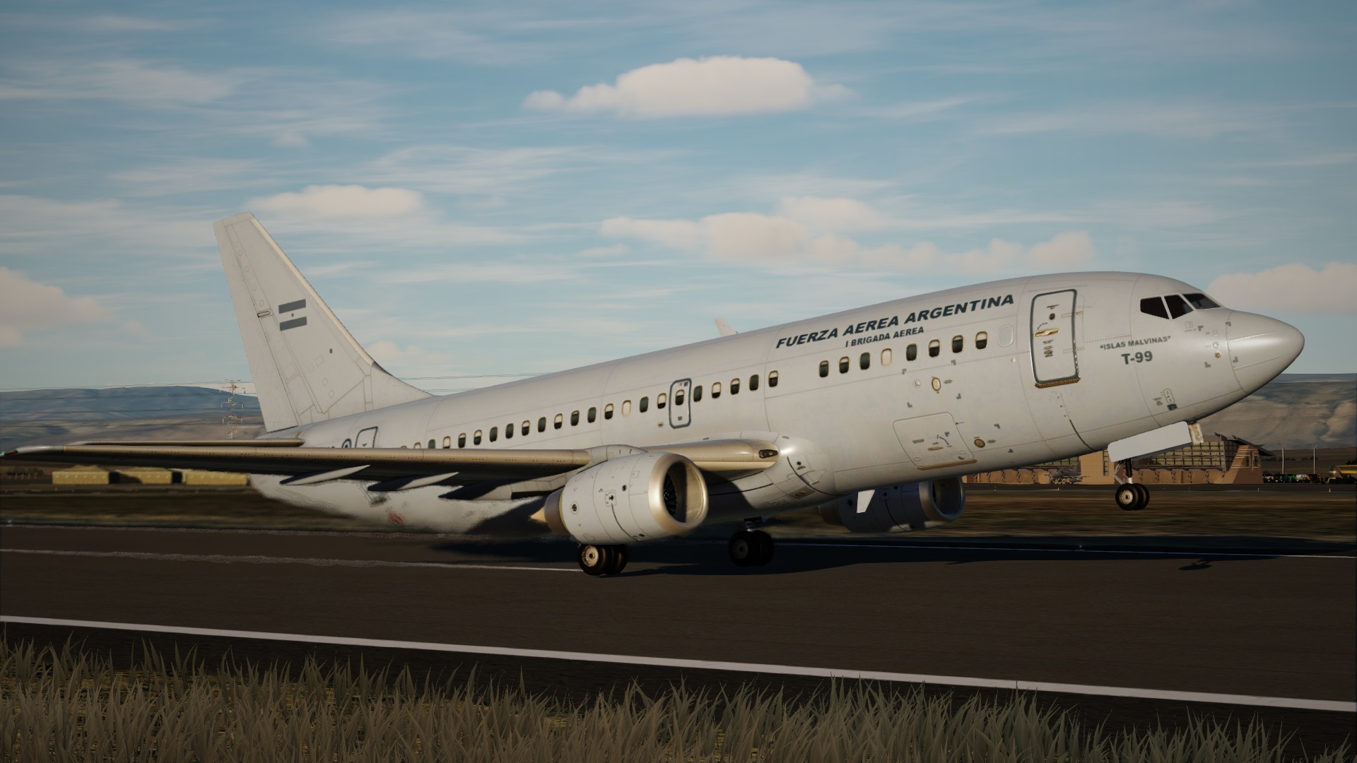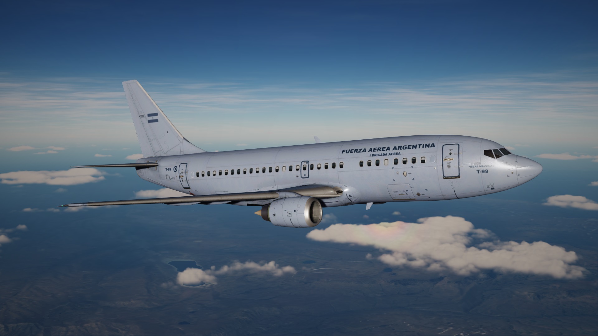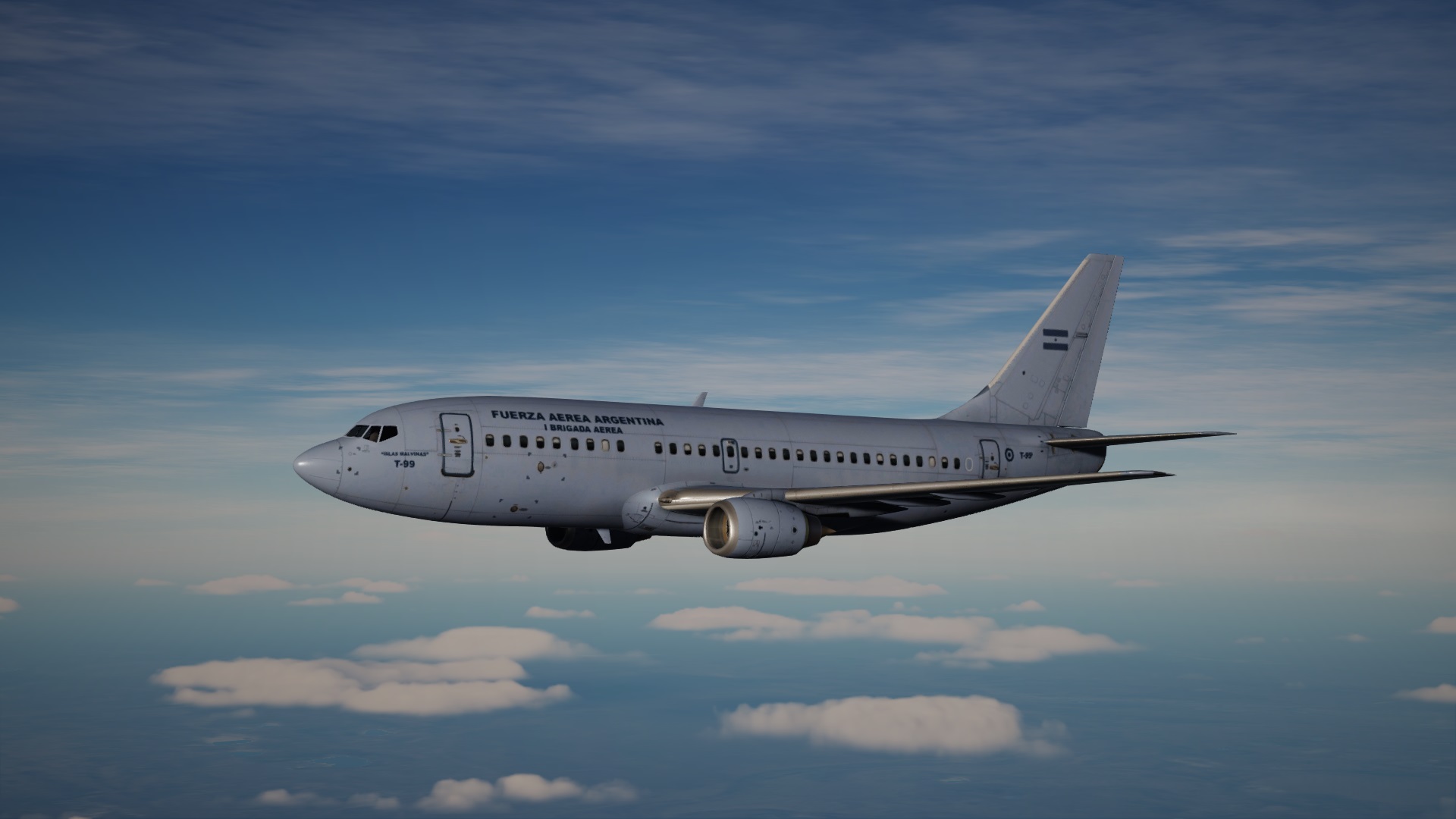 This livery is based on the Boeing 737 currently in service in the Argentine Air Force. The T-99 "Islas Malvinas" is a recently acquired 737 used for military personnel transport. The paint scheme is a low visibility grey with the name of the unit on it's fuselage, the first air brigade.