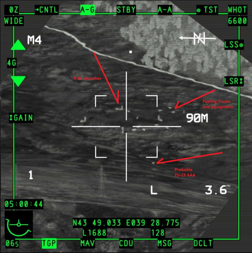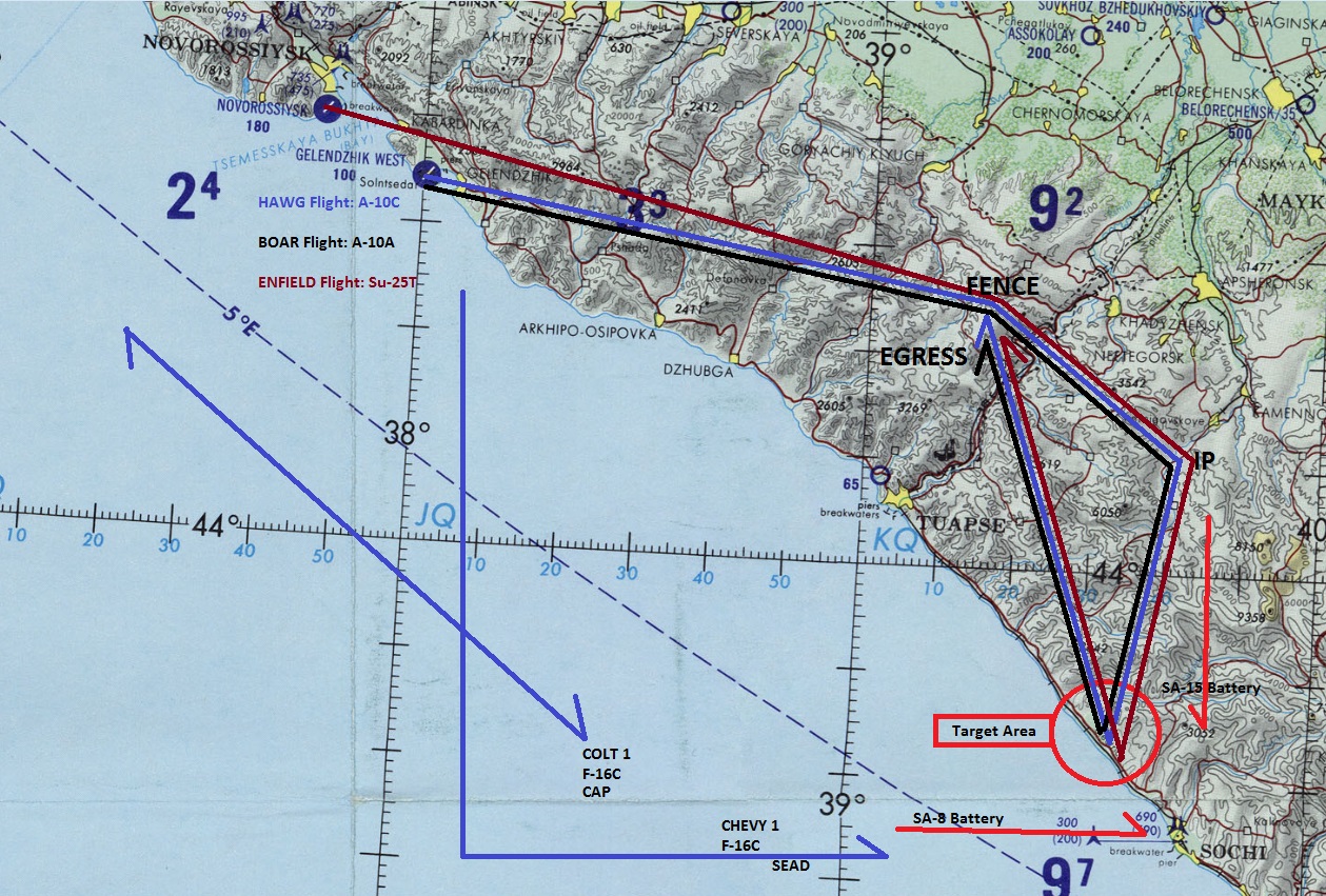 The Abkhaz forces do have extensive numbers of SA-8 and SA-15 mobile SAM platforms and have erected a net around the town of Sochi and the Sochi-Adler Airbase. Intel suggests that at least some of these platforms may cover the SCUD sites. Pay attention to your RWR and be sure to egress WEST off target.