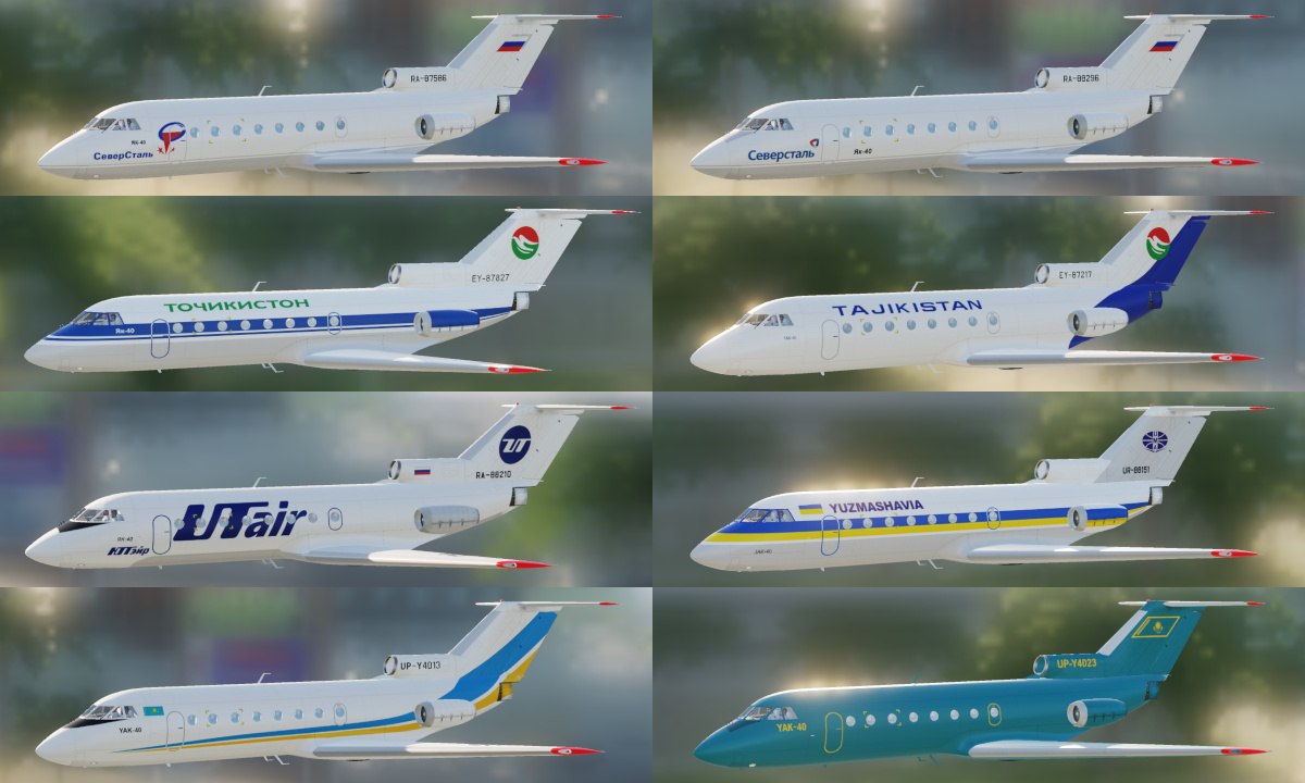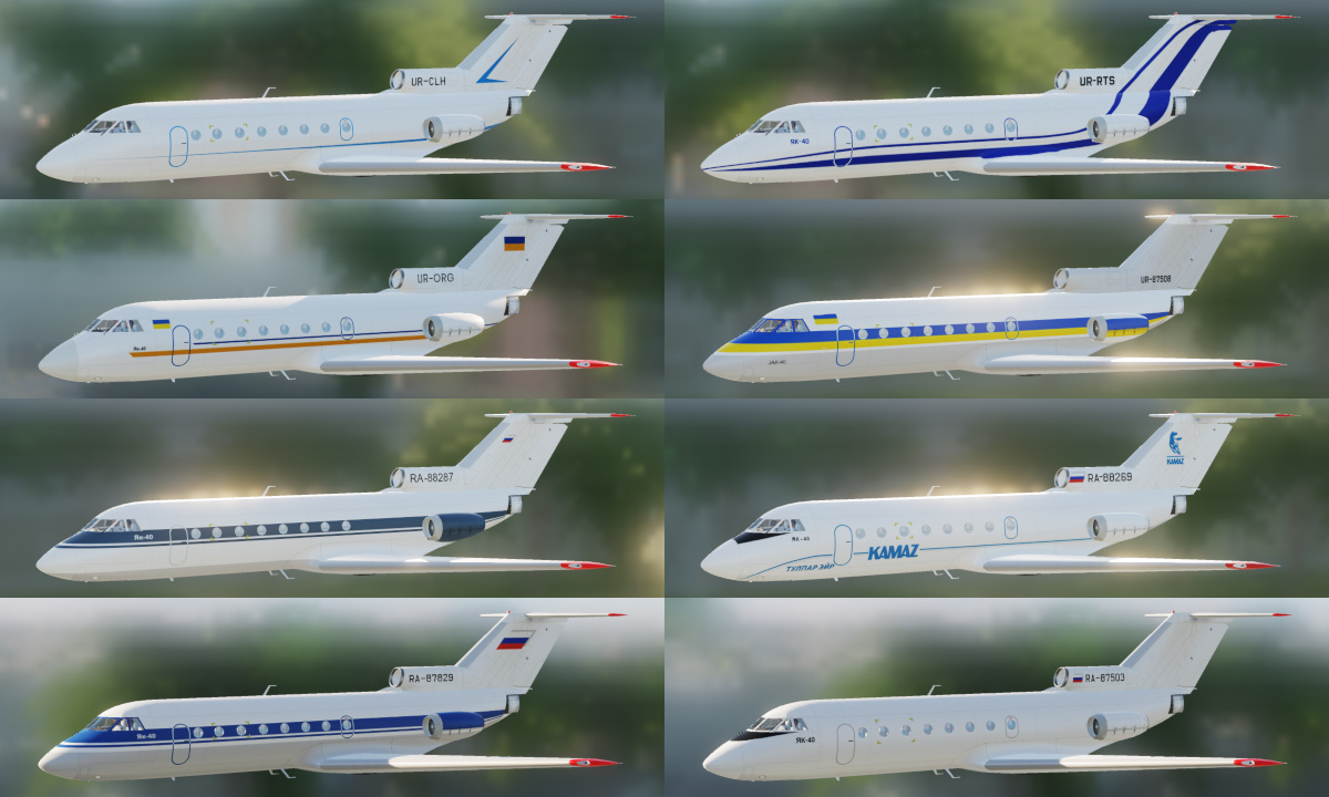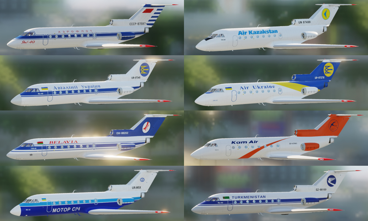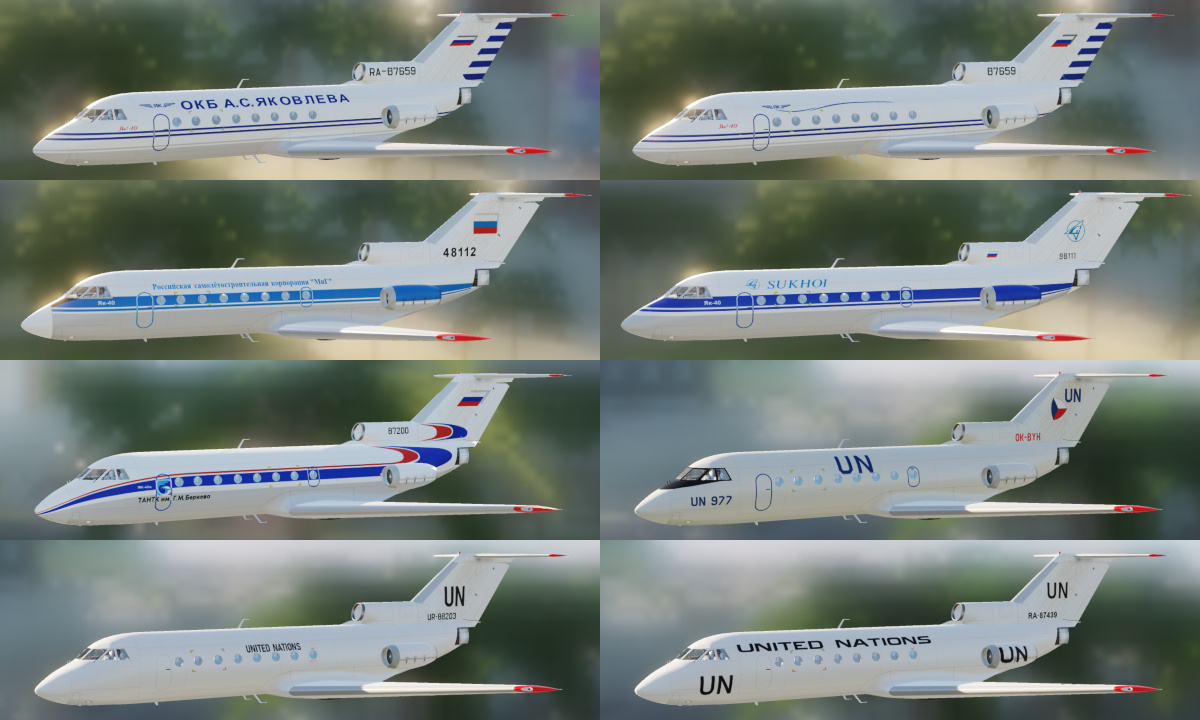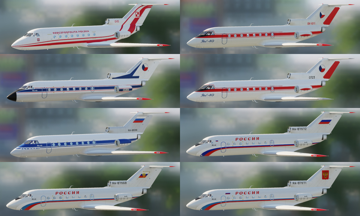 Historical skinpack of 21x commercial / charter airlines + 12x Air Force / Government / UN + 7x company private = total 40 liveries for Yak-40 of Eagle Dynamics.