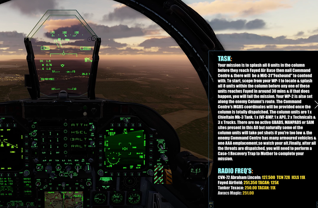 SITUATION: Dawn 05:50 hrs Sinai Peninsula. Dodge 1-1 Angels 10 heading South along the Suez Canal to the Gulf of Suez for your Case-1 Recovery to Mother CVN-72 Abraham Lincoln. Your plans are interrupted as reported 60 nm ahead is a 8 Unit enemy column rolling towards Fayed Air Base & must be stopped before ANY ONE of them deploy there in approx 30 min.