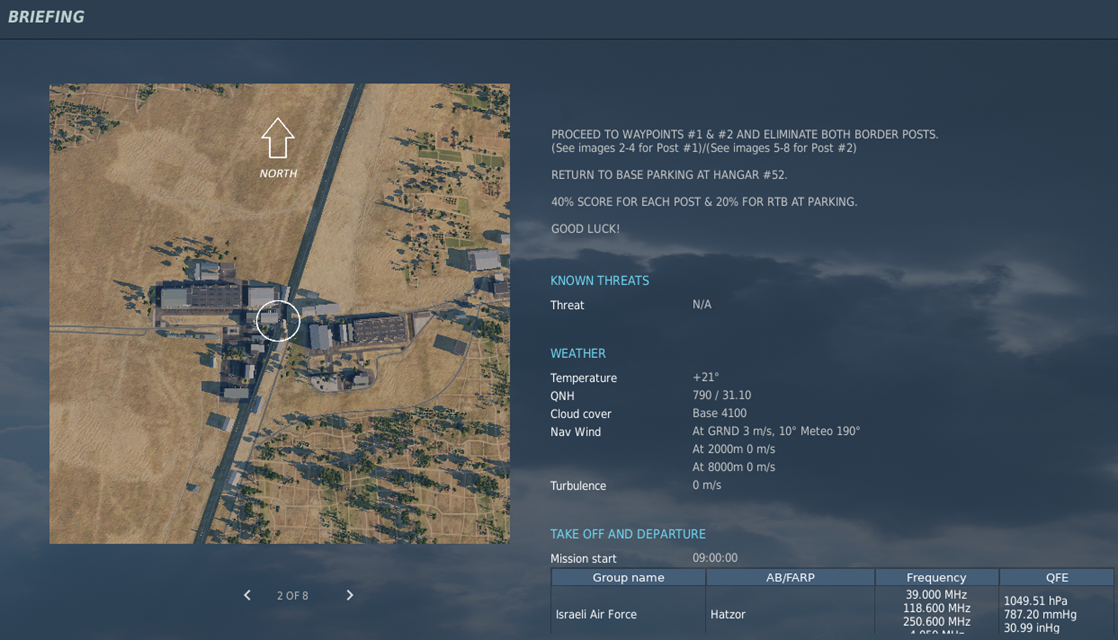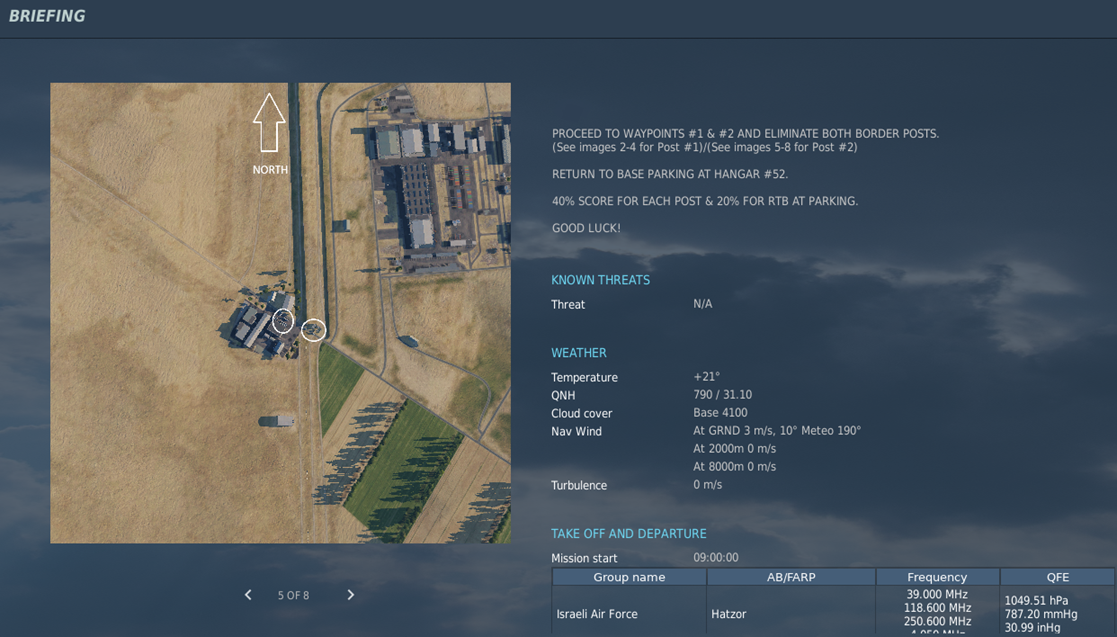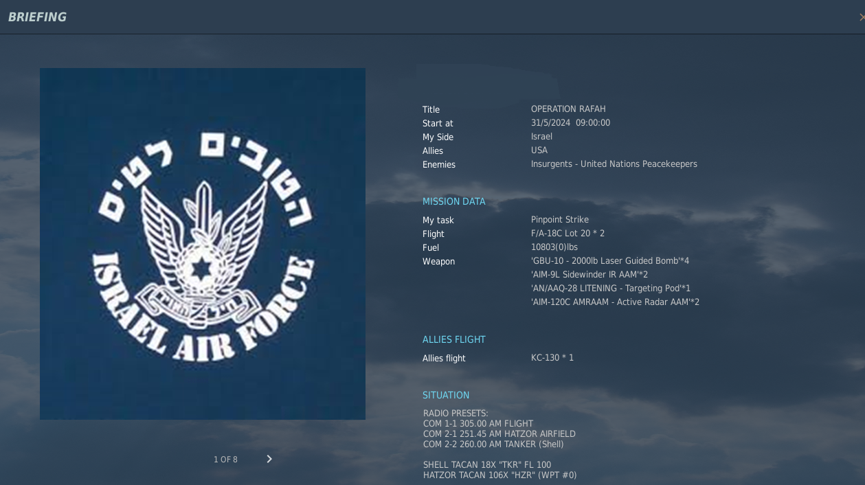It is the first full day of the Yom Kippur war, 07 OCT 1973. IAF aircraft are taking off in support of troops on the ground in Sinai shortly. They will be faced by units that have had all night to dig in are are under cover of SA-2, SA-3, SA-6, SA-7 and AAA guns. All your skill will be tested in the missions today.