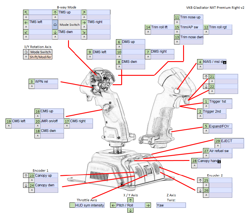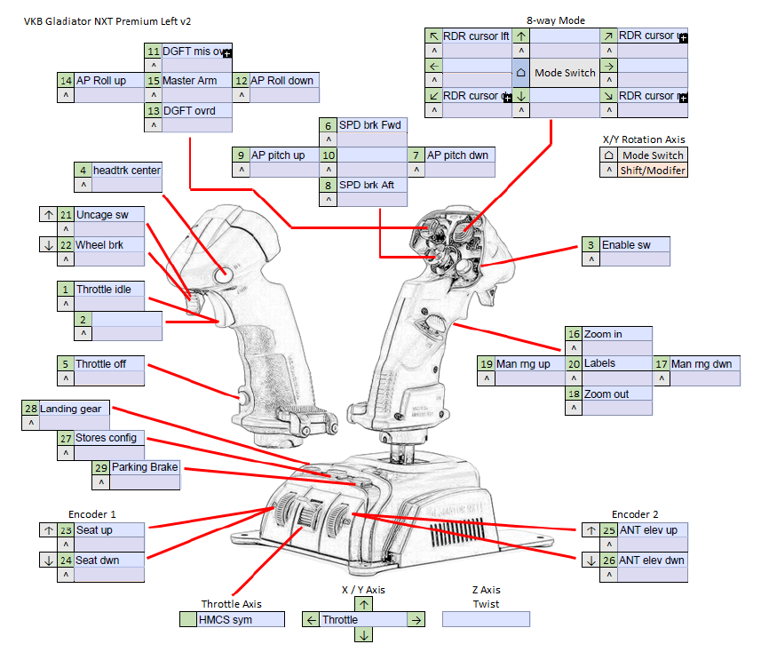 This is my F-16 profile for the T16000M HOTAS, it has been created with rudder pedals and TrackIR/VR in mind so rudder, brakes and POV movement are not bound into the HOTAS. But can be modified as required. The F/A-18C is my main aircraft, so this profile was created around my Hornet profile, if you have the hornet I recommend that profile as well! The throttle pinky button must be created as a modifier by you in game for this to work properly.