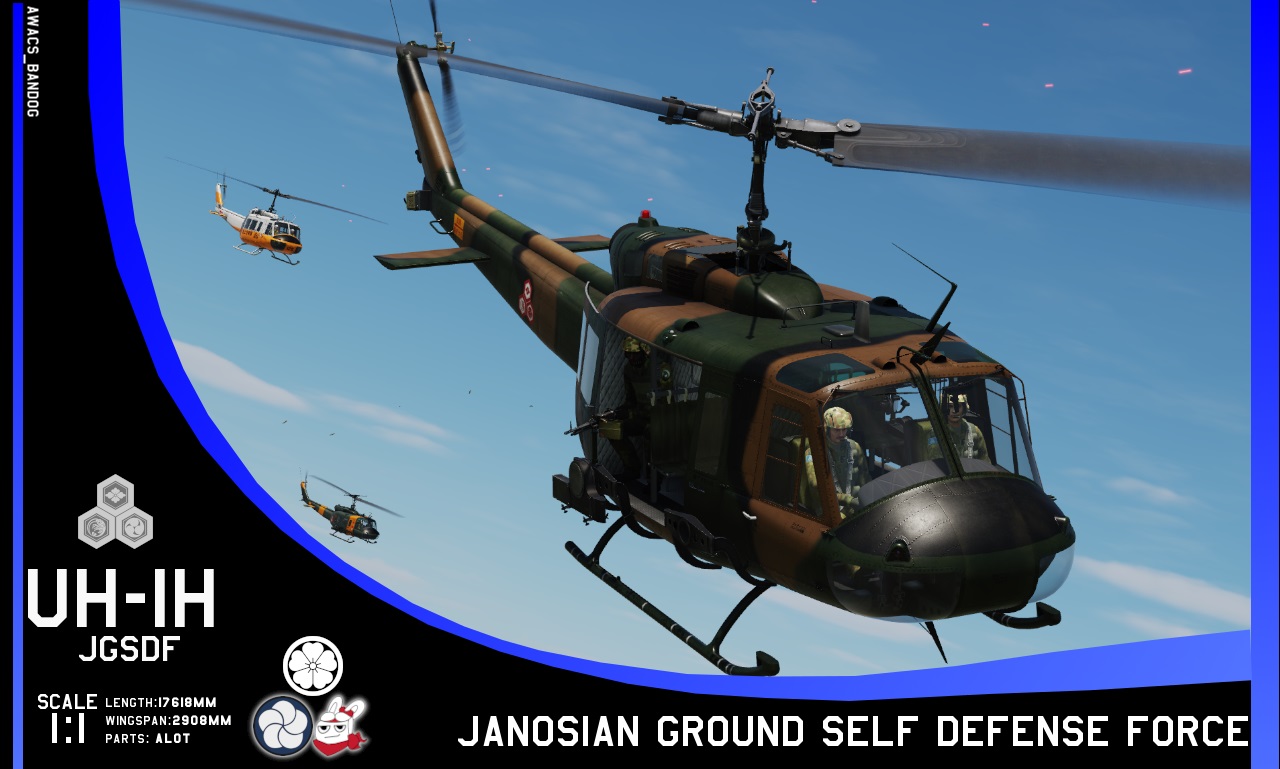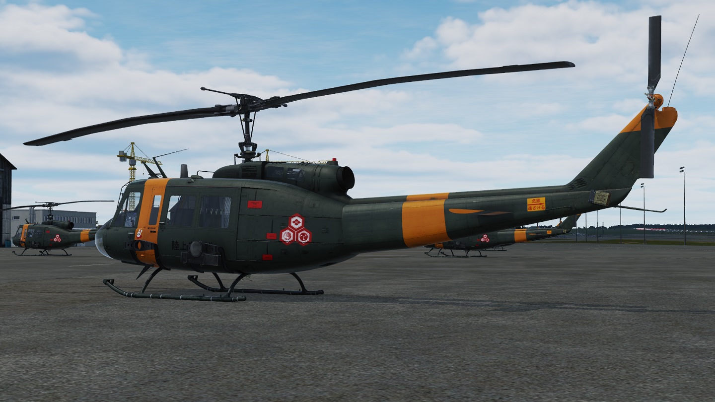 The UH-1H is a versatile utility helicopter widely used by both the Air and Ground components of the Janosian Self Defense Forces. Introduced in the 1960s, it is employed in a variety of missions including transport, disaster relief, and reconnaissance. Its reliability and versatility has made it a mainstay in Janosian disaster response efforts and has been almost synonymous with the JGSDF as a whole with their use of the iconic airframe.
