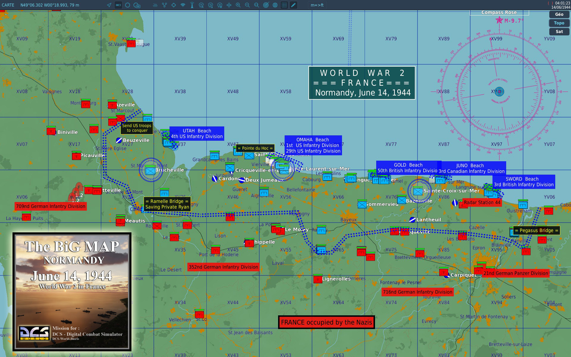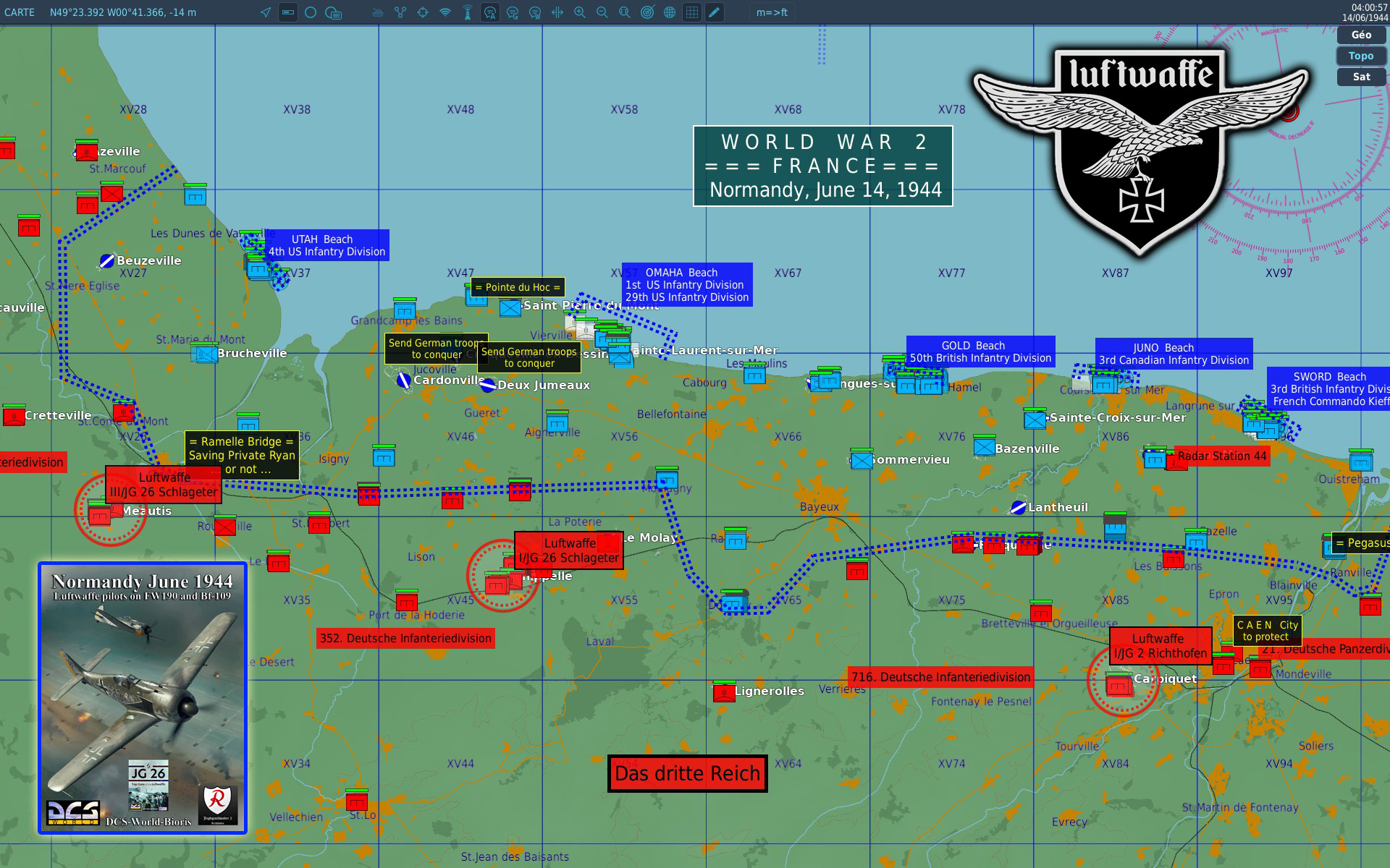 The entire Normandy landing area (the beaches of Utah, Omaha, Gold, Juno and Sword) is covered with Allied and German units, just like on June 14, 1944, the start of the liberation of France -  Toute la zone du débarquement en Normandie recouverte d'unités alliées et allemandes comme le jour du 14 Juin 1944, commencement de la libération de la France.