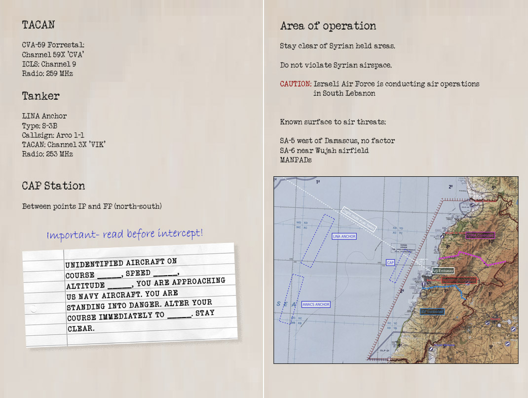 The player will fly CAP in his F-14A Tomcat off the coast of Lebanon and ensure that the evacuation helicopters get in and out of Lebanon safely.