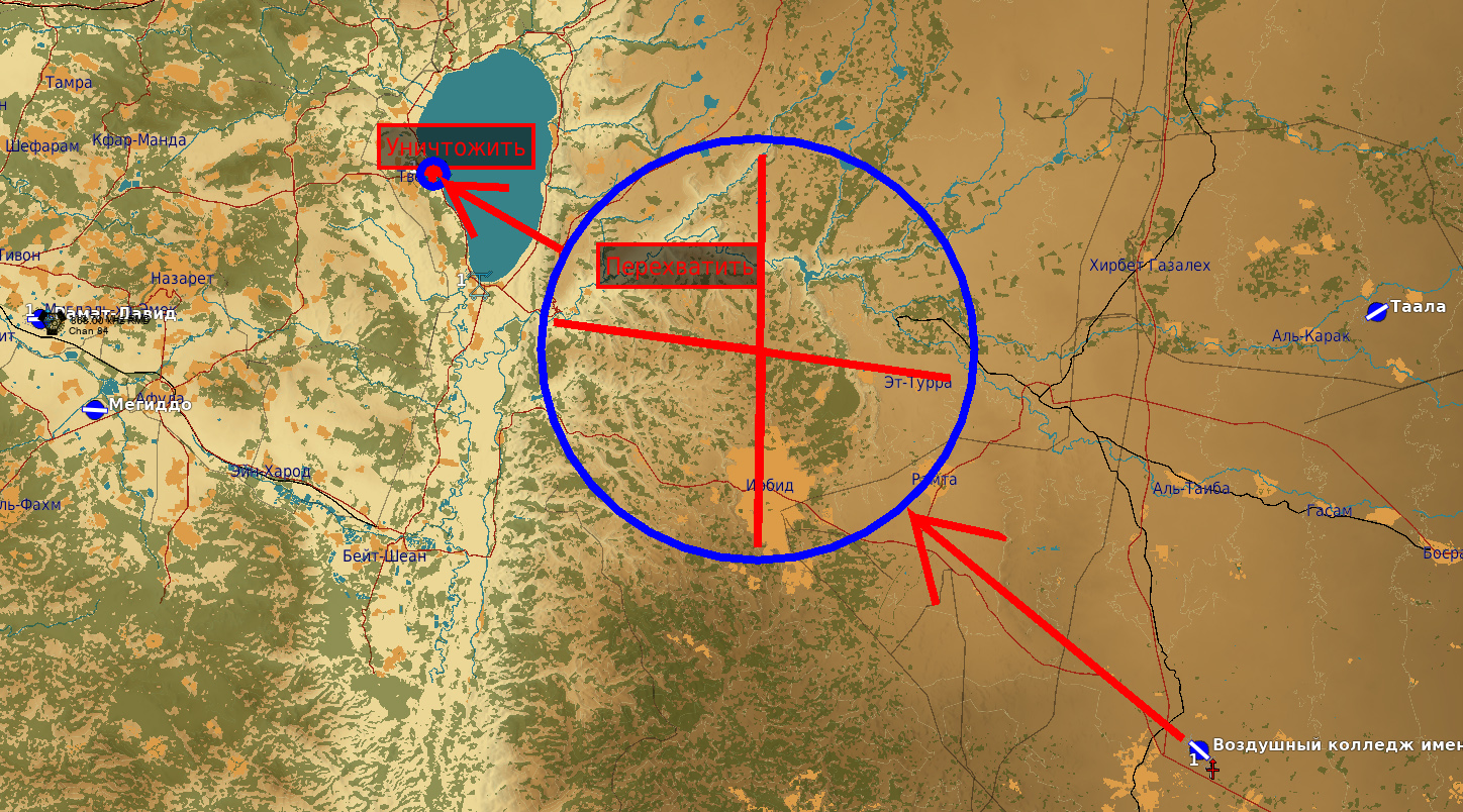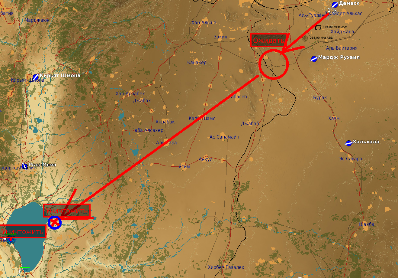 По данным наших диверсионно разведывательных групп террористические группировки противника вместе со снабжением закрепились в одном из раенов города Тверия.Подобраться к ним мешают  недоброжелательные силы которые нам мешают.Так на другом берегу озера Кенерет расположен расчет ЗРК Patriot.Над водой при этом будут патрулировать вражеские истребители F-16 ваша первоочередная задача заняться ими и очистить небо в раене ППМ1 для нашего союзного истребителя.Далее нанести удар по оккупированной террористами территории города Тверия по выданным вам целеуказаниям.Будте осторожны там большое скопление ПЗРК и зенитных установок противника вместе с другим вооружением и припасами.Наши диверсанты перед ударом пометят вам это место красным дымом.После можно вызвать по радио огромный ракетный удар по этой точке нашими РСЗО БМ-27 Ураган, удар наносить по оценке...В конце приземлится на аэродром Дамаск.