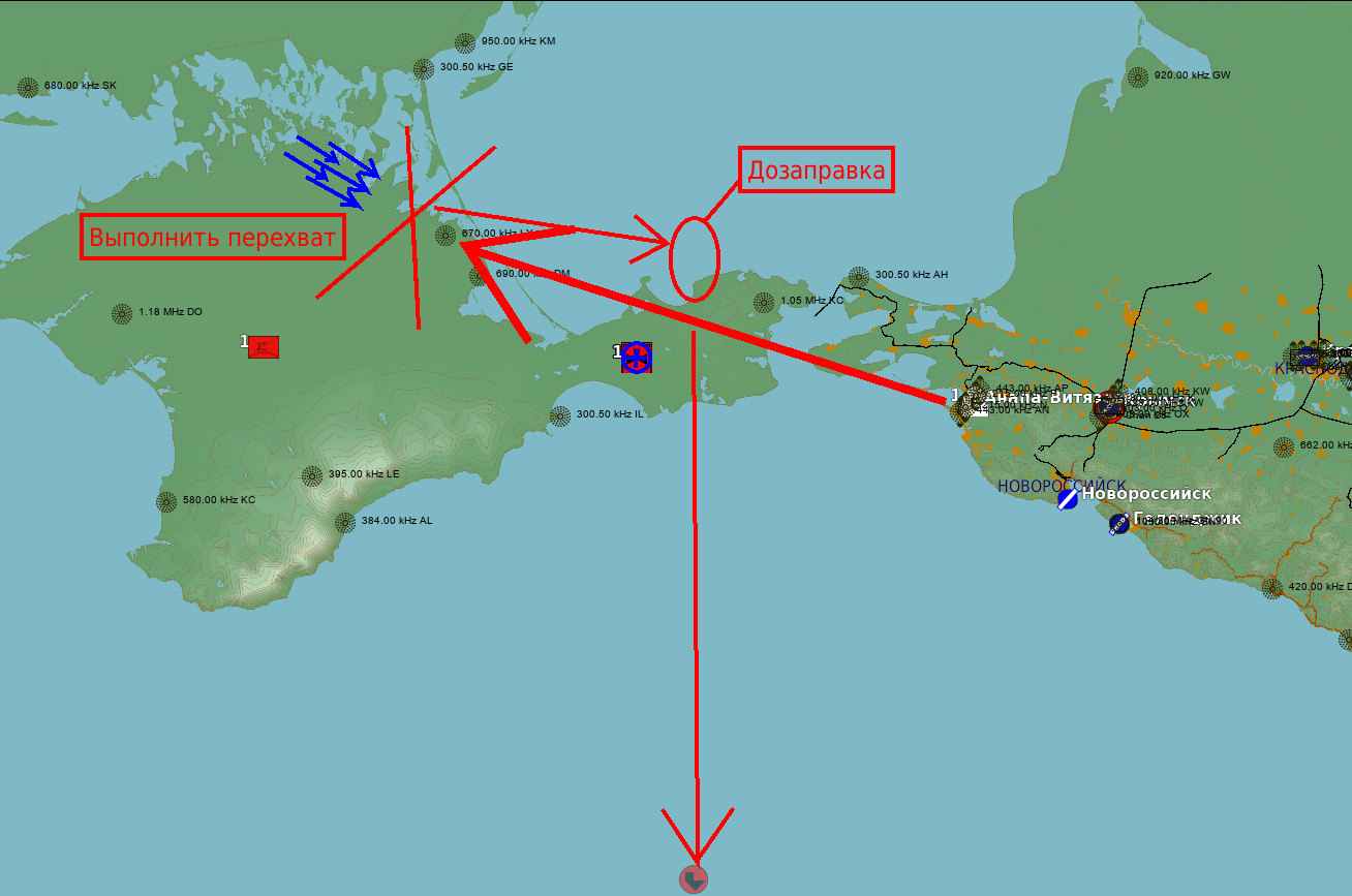 По данным станций раннего обнаружения о пусках в сторону нашей границы произведен пуск крылатыми ракетами,на нашем аэродроме находится только ваш самолет готовый к передислокации на ТАКР Адмирал Кузнецов.И у нас нету достаточно мощных и нужных систем ЗРК для перехвата ракет в данный момент по данной траектории полета.На вас возлагается крайне серьезная, ответственная и сложная задача осуществить перехват множественных целей,крылатых ракет противника.Взлетаем в 12:00 c аэродрома Анапа-Витязево и боевой загрузкой в 6 нестандартных Р-77 и 2 Р-33 летим в сторону ППМ1 начинаем контролировать полет крылатых ракет по ИПВ,производим захват целей и перехват потом через радио меню вызываем в точку ППМ3 топливозаправщик, заправляемся и возвращаемся на ТАКР Адмирал Кузнецов.