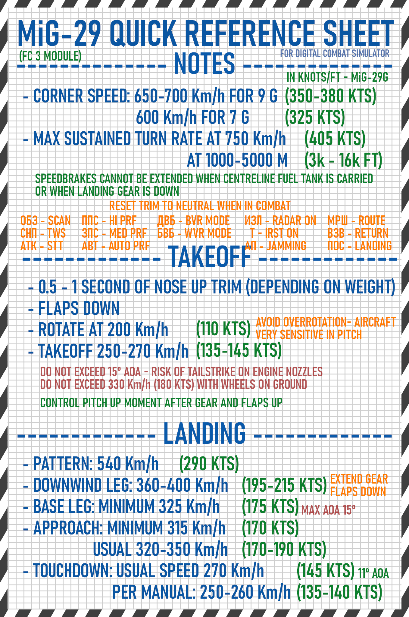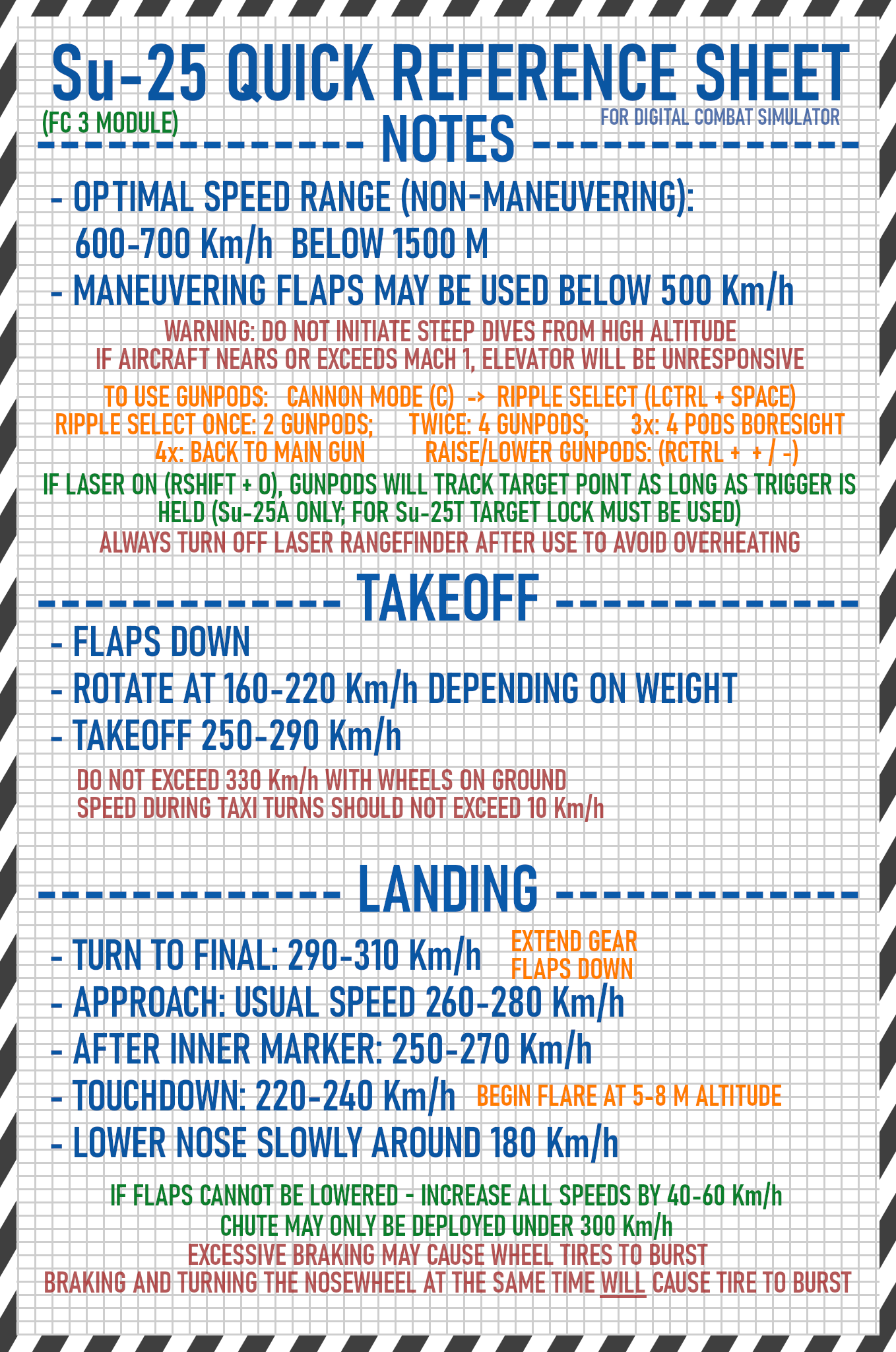 A collection of single-page "cheat sheets" focused on takeoff and landing speeds/procedures for the following aircraft in DCS World: All FC3 modules (A-10A, F-15C, MiG-29A, MiG-29S, MiG-29G, Su-27, J-11, Su-33, Su-25), Su-25T, F-5E, Mirage 2000C, F-16C and F/A-18C. Large font size to accommodate users with smaller screens. Comes both in day and night versions.