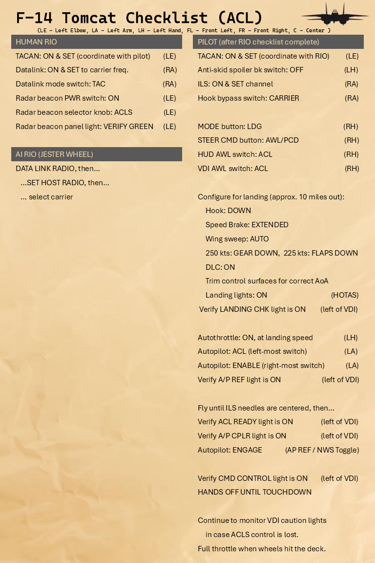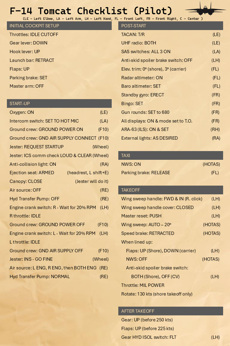 Pilot and RIO kneeboards for cold start through after takeoff.  Sticks to what you need in DCS, not every real-world procedure.  Also includes 1-page ACL checklist, and 1-page RWR legend.  5 pages total.  PDF included as well.