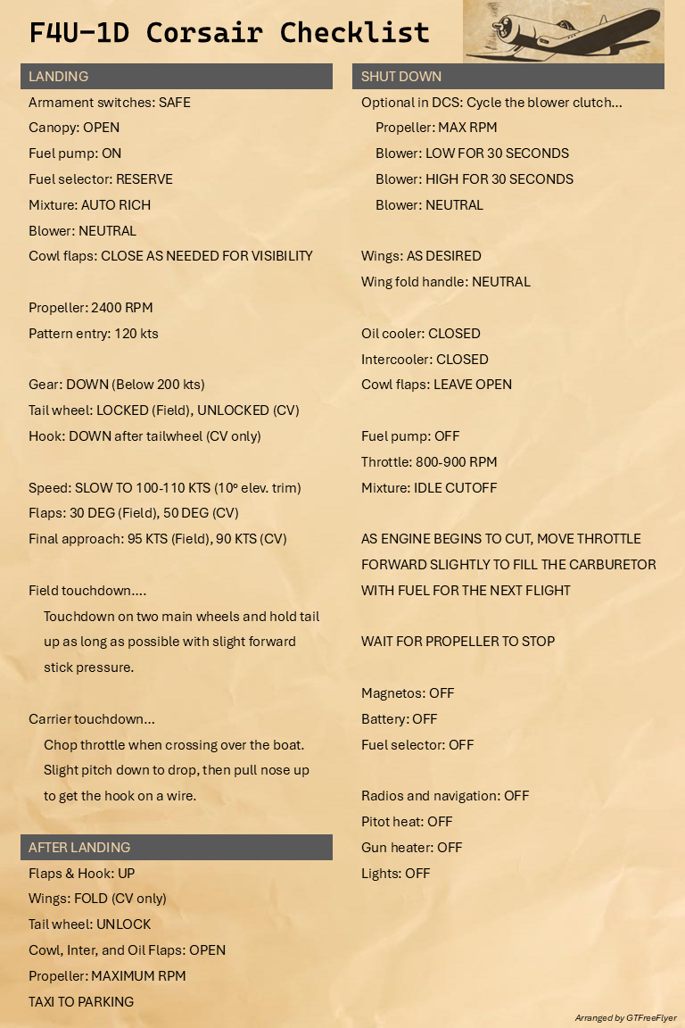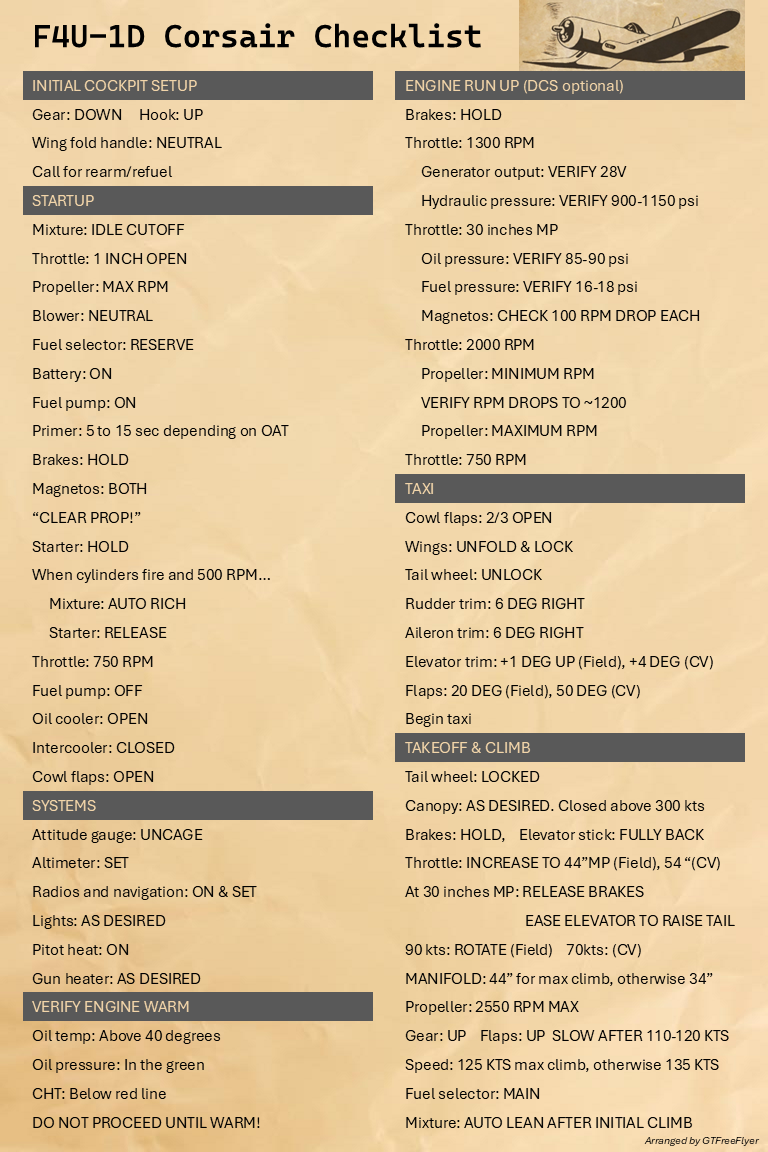 After flying the Corsair a bunch, watching all the videos, reading through the DCS manual and the real-world Pilot Operating Handbook (POH) multiple times, I have compiled these kneeboards that give the perfect balance between DCS and real-world procedures, with more focus on realism.