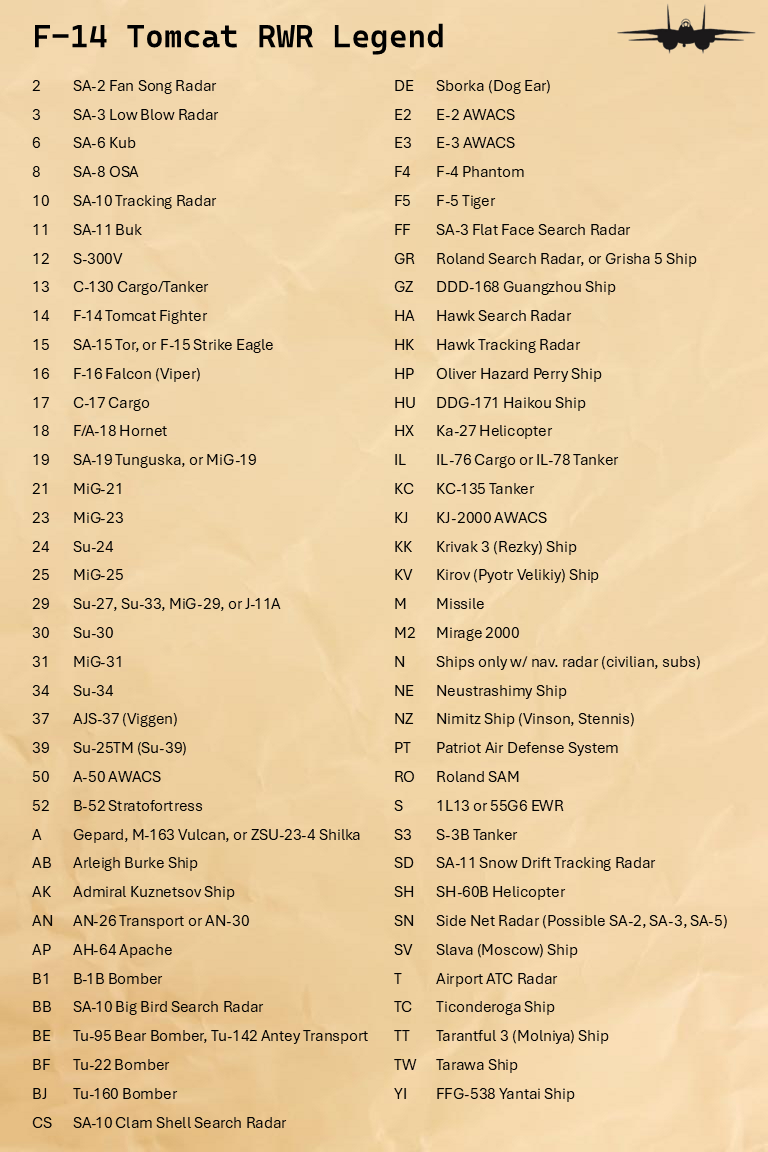 F-14 Tomcat Kneeboards - Pilot, RIO, ACL, and RWR Legend