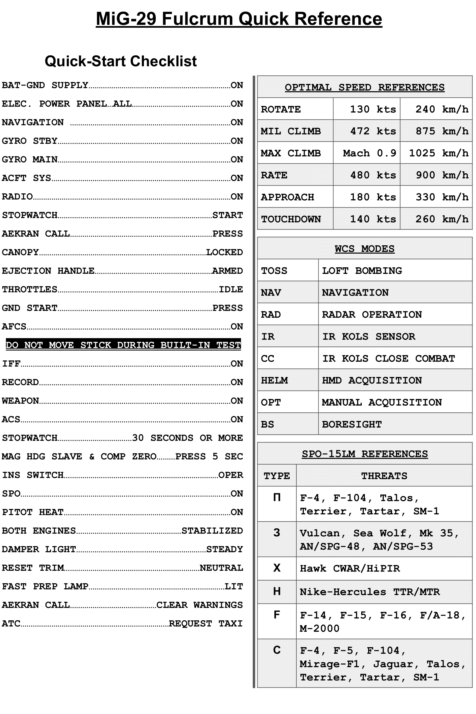 Includes a light & dark kneeboard detailing quick references and a quick startup checklist for the full fidelity MiG-29 Fulcrum.