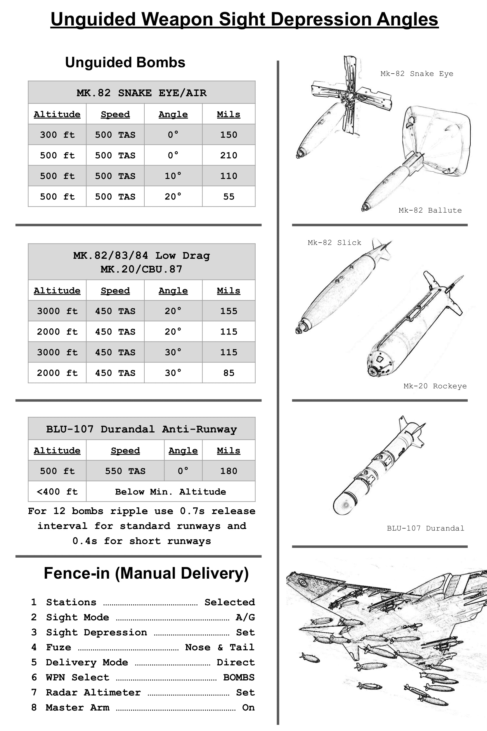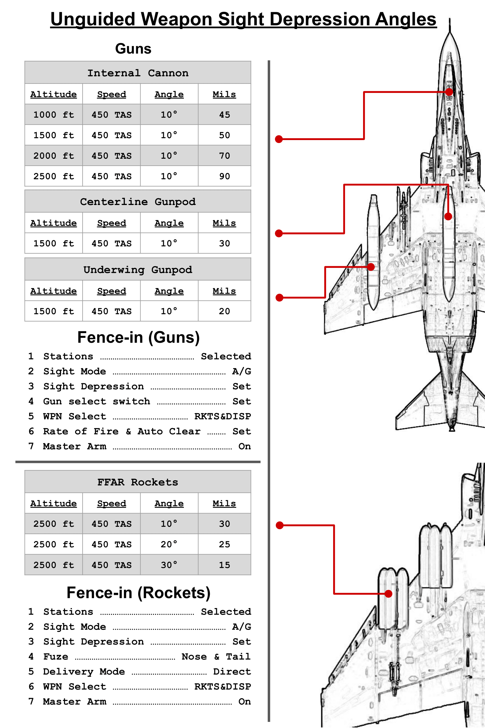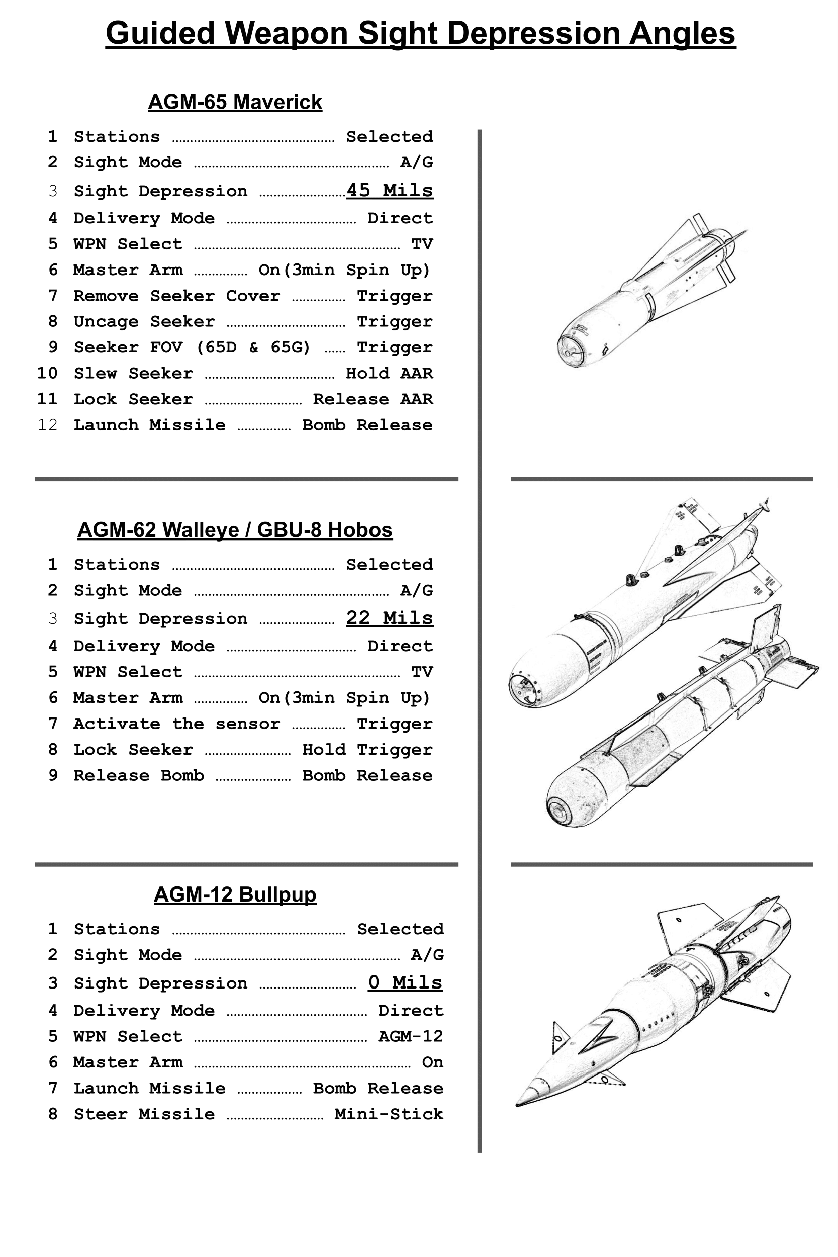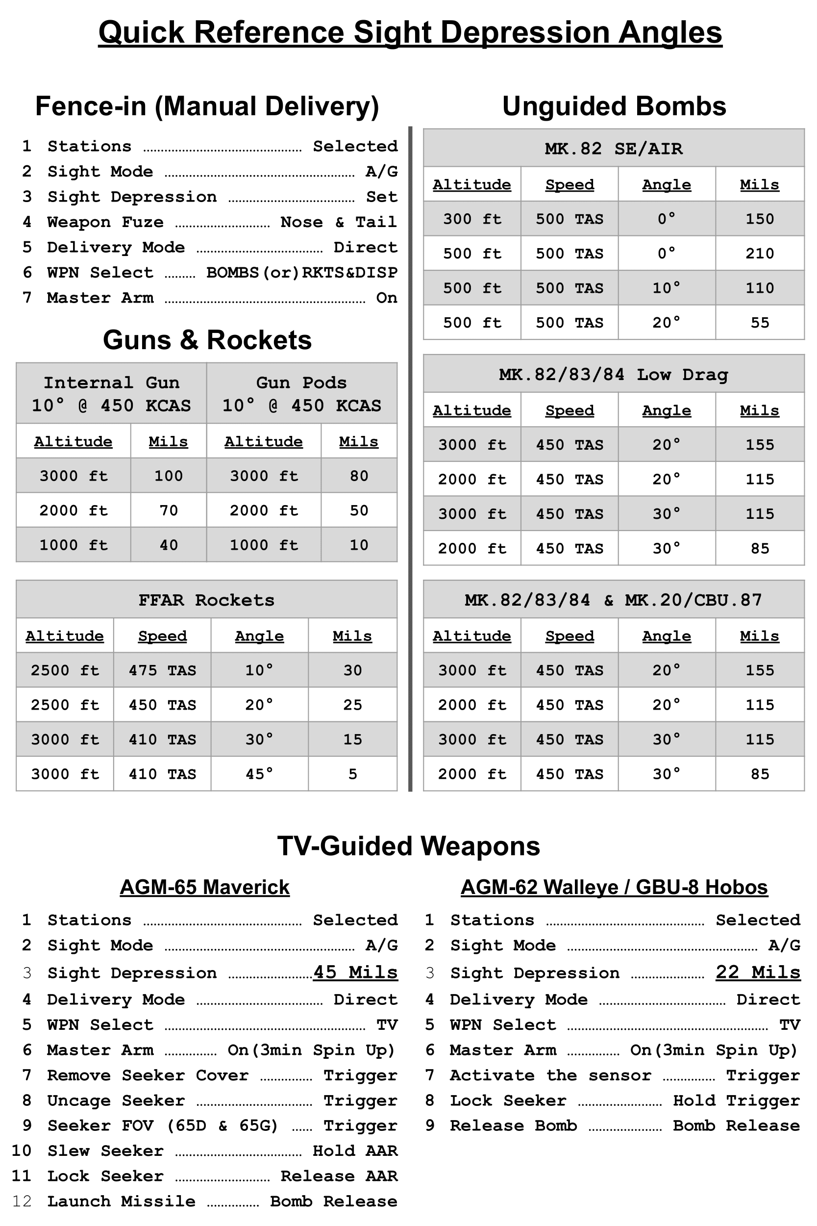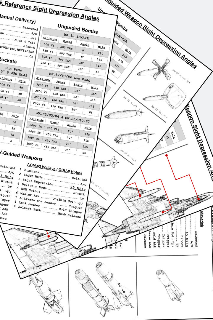 Includes a kneeboard detailing quick reference reticle depression tables for various guided and unguided ordnance as well as guns/gun pods. Also outlines step-by-step procedures for employing various guided weapons in the Phantom. Collaboration between myself and u/dallatorretdu from reddit. We both realized how valuable a quick reference kneeboard of this nature would be.