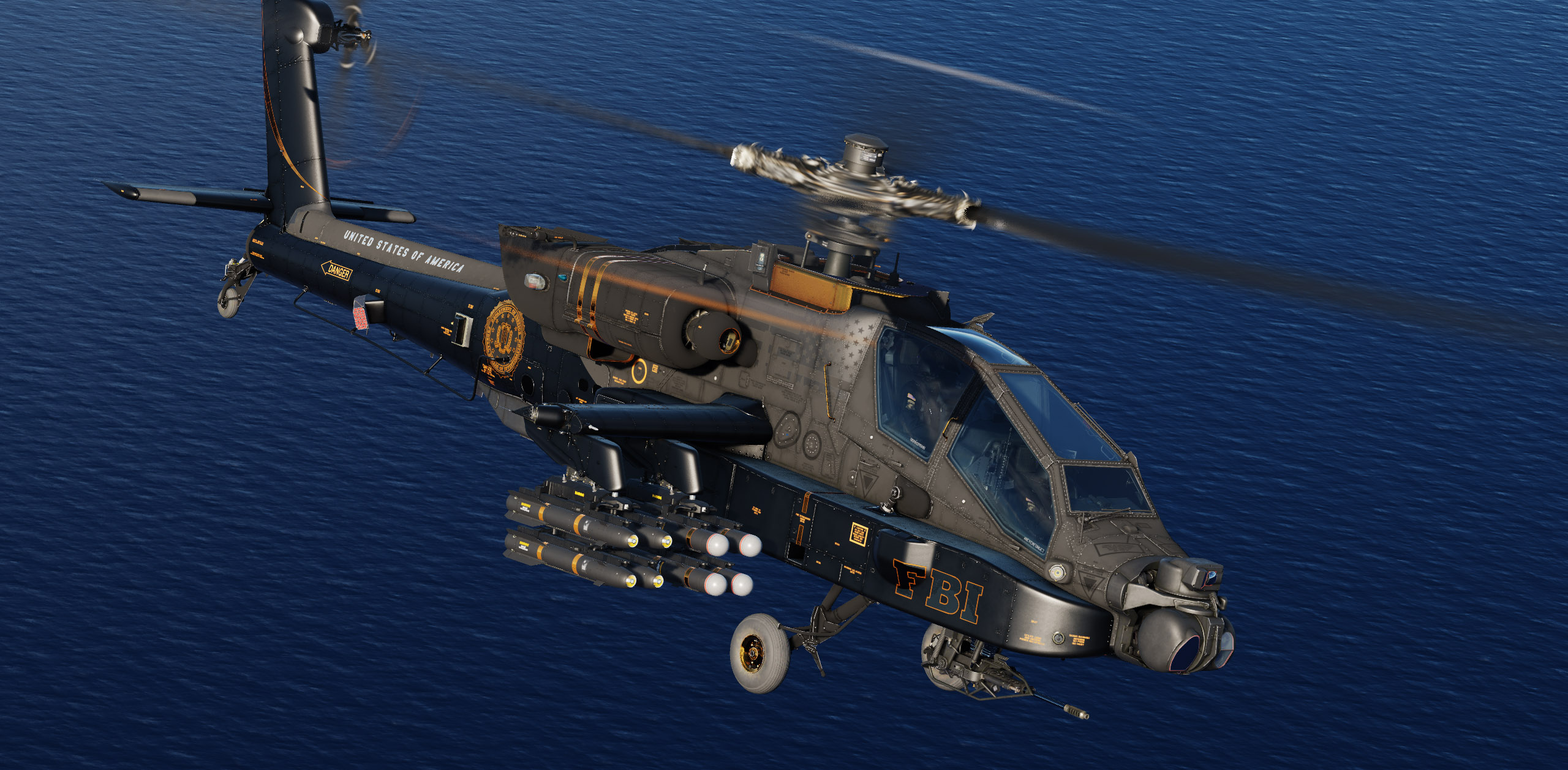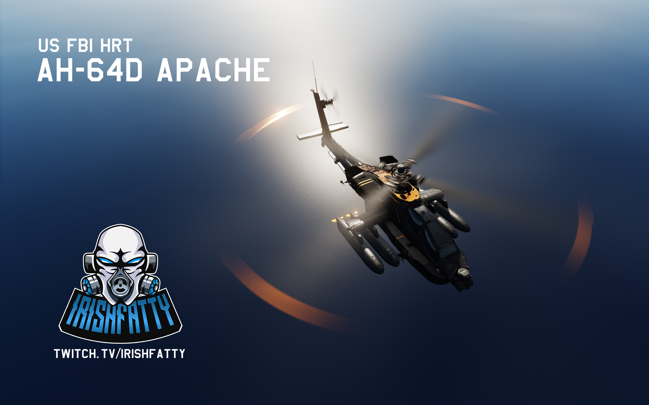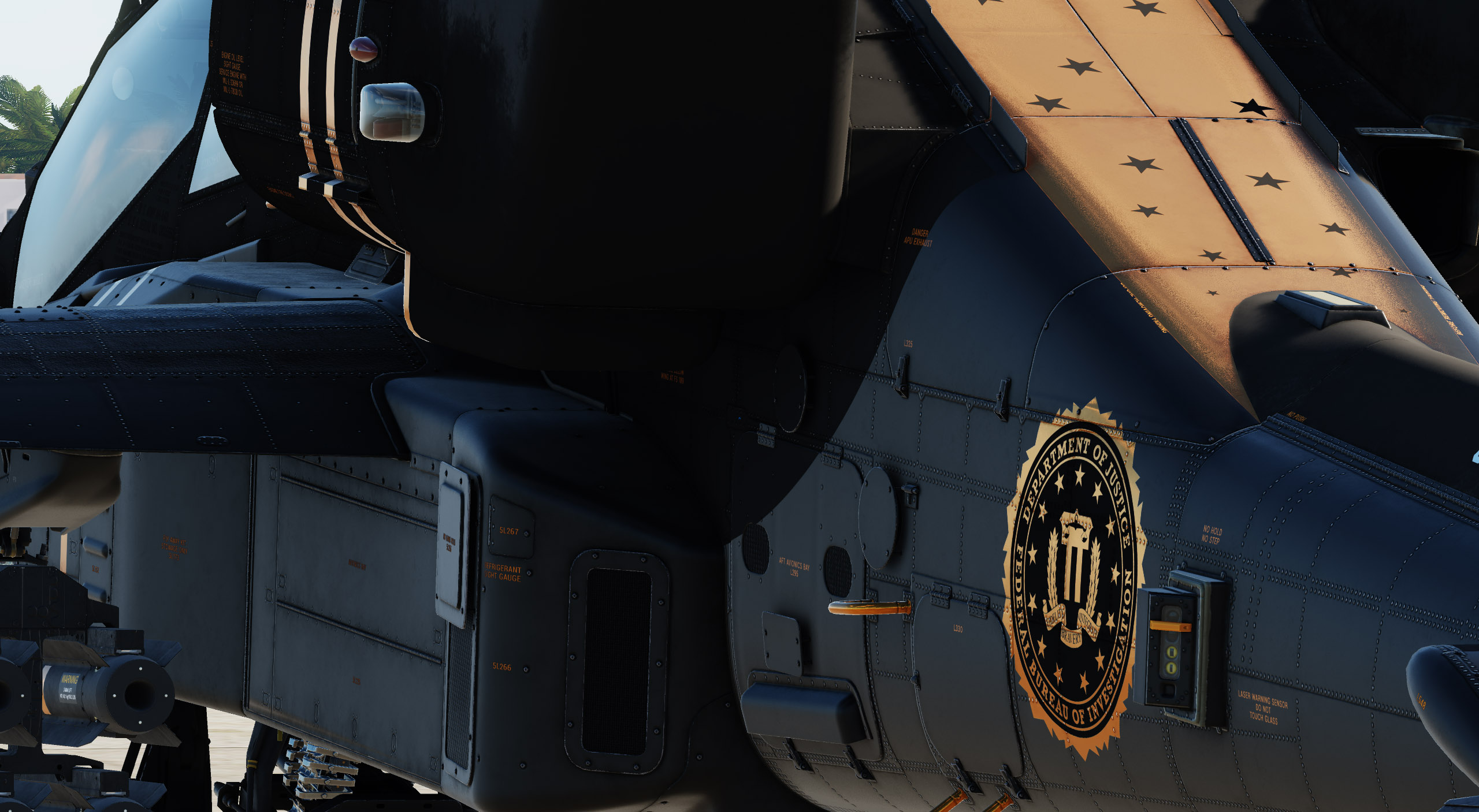 The very mean looking AH-64D by IrishFatty. This is a fictional skin and features dark tinted external glass (view unaffected from inside cockpit). Chrome 30cal barrel and belt feeder. Also some bling on the external handles. The Hellfire Rails and Rocket pod are colored to match the skin. Texas, Arizona flags along with the 25th ID Tropic Lightning emblem.