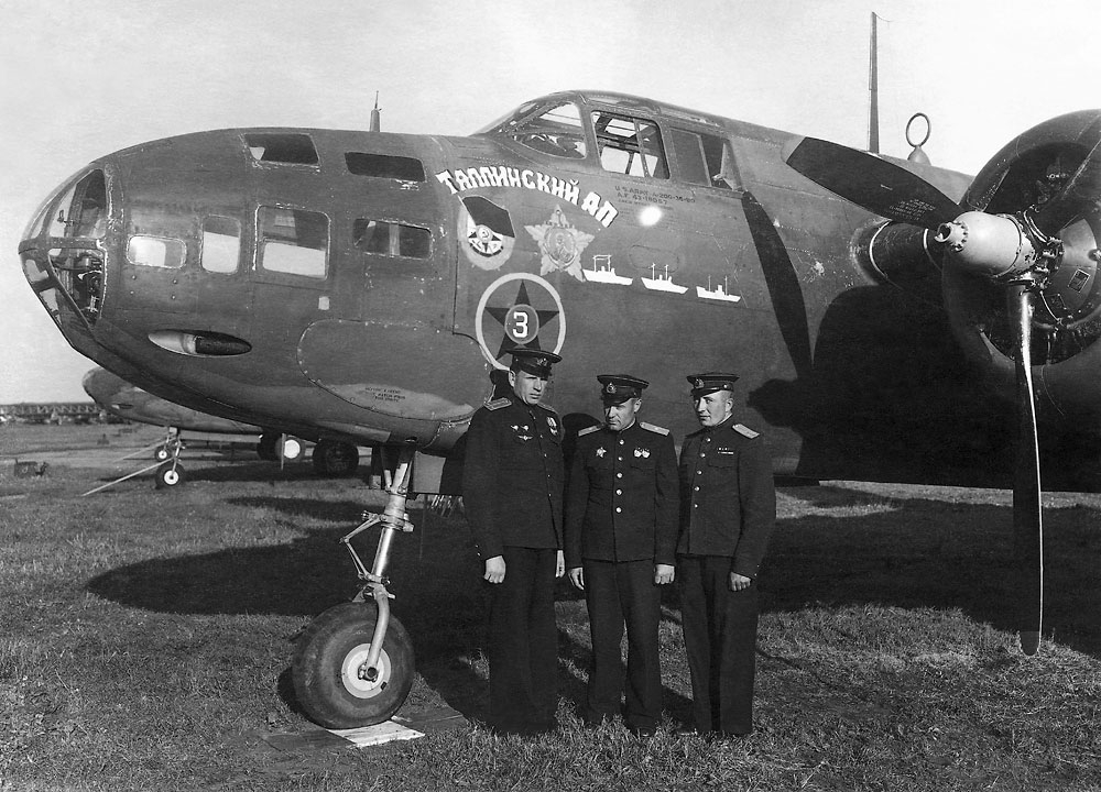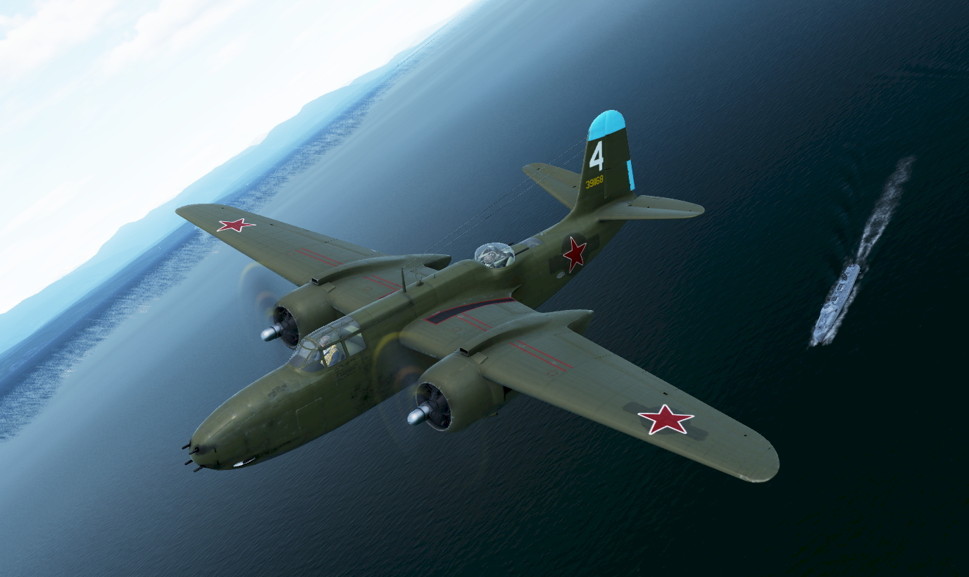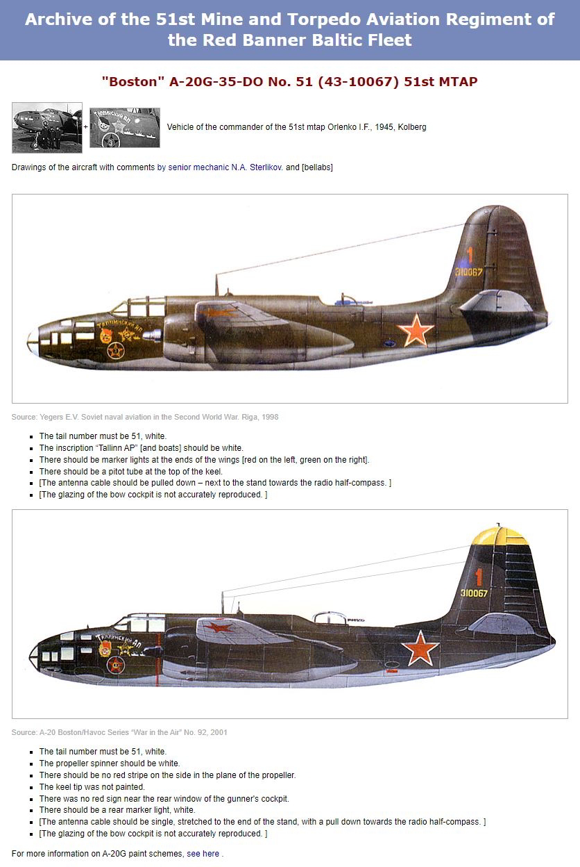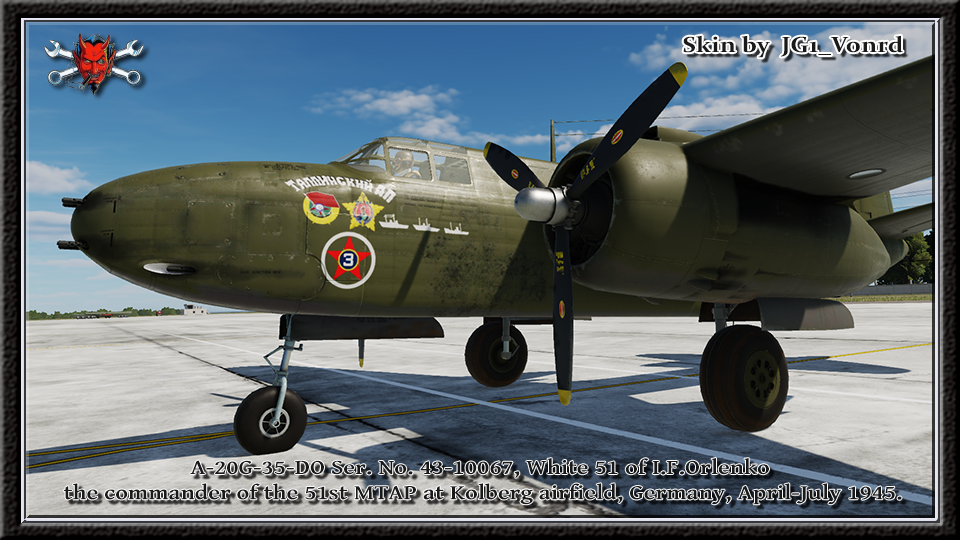 An A-20G-35-DO Ser. No. 43-10067, White 51 of the commander of the 51st Mine and Torpedo Aviation Regiment of the Red Banner Baltic Fleet, Ivan Feofanovich Orlenko, at Kolberg airfield, Germany, April-July 1945. It appears that the upper four 50 caliber guns were removed and windows added to allow for a bombardier for more accuracy in torpedo delivery. Of course, that's not an option in game so it's left without the nose glazing.