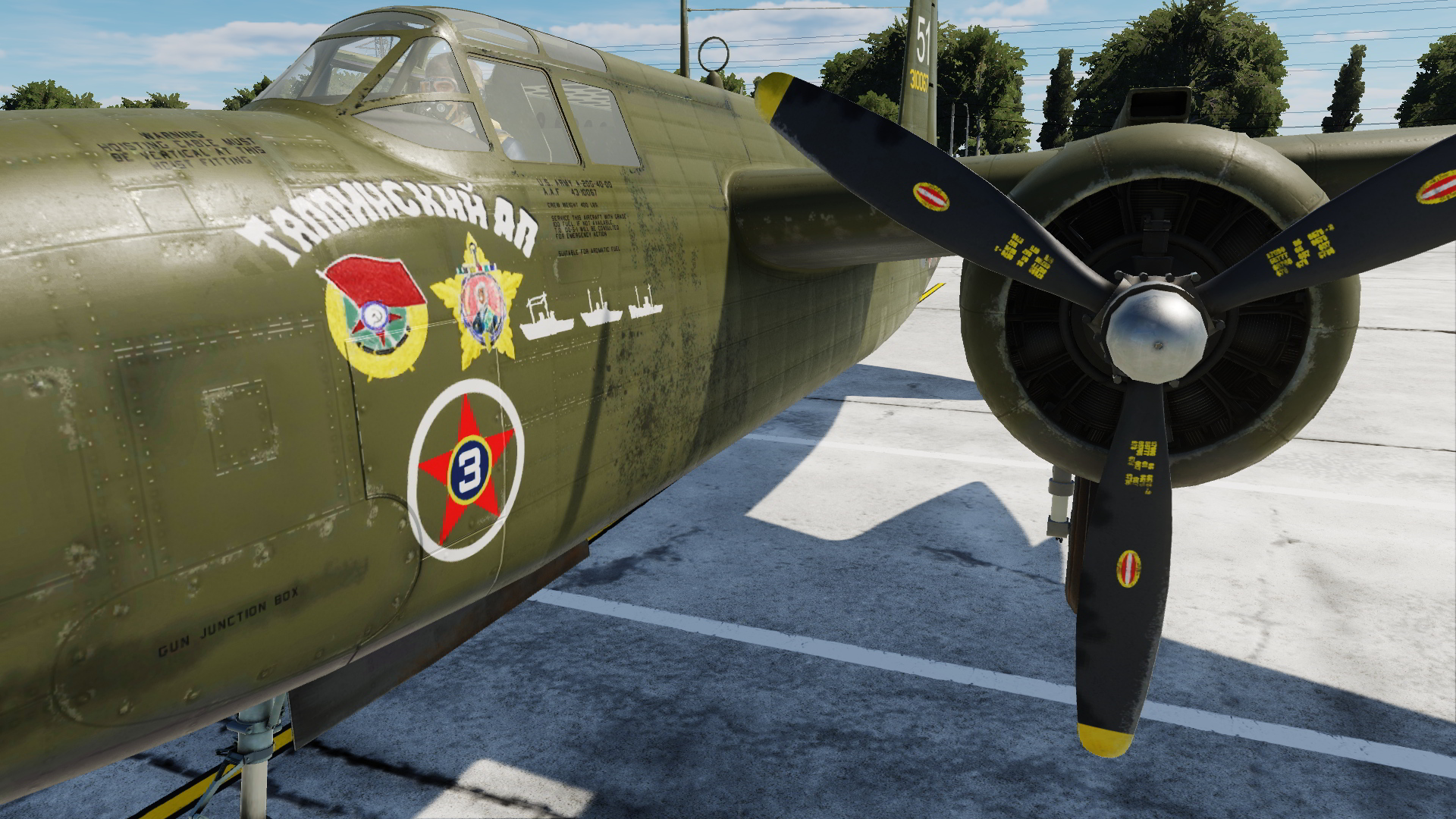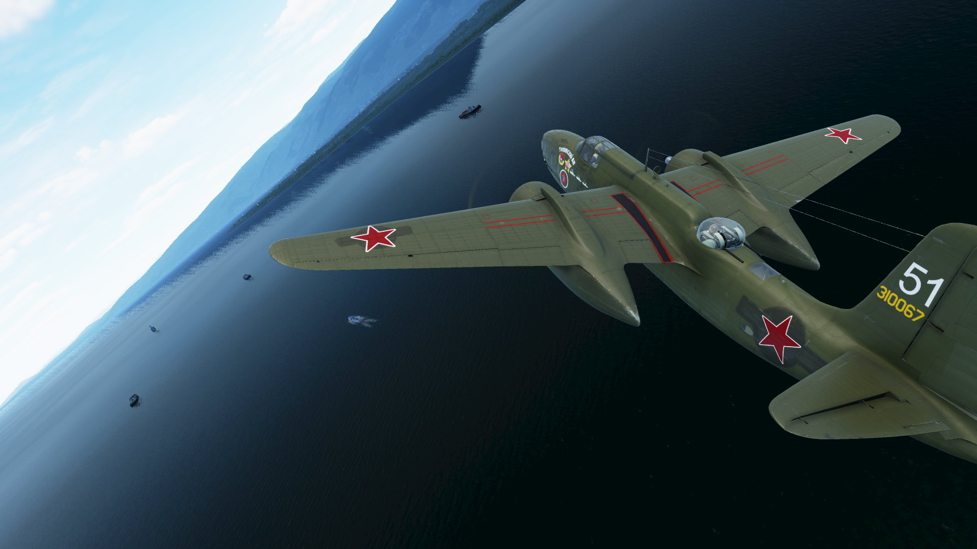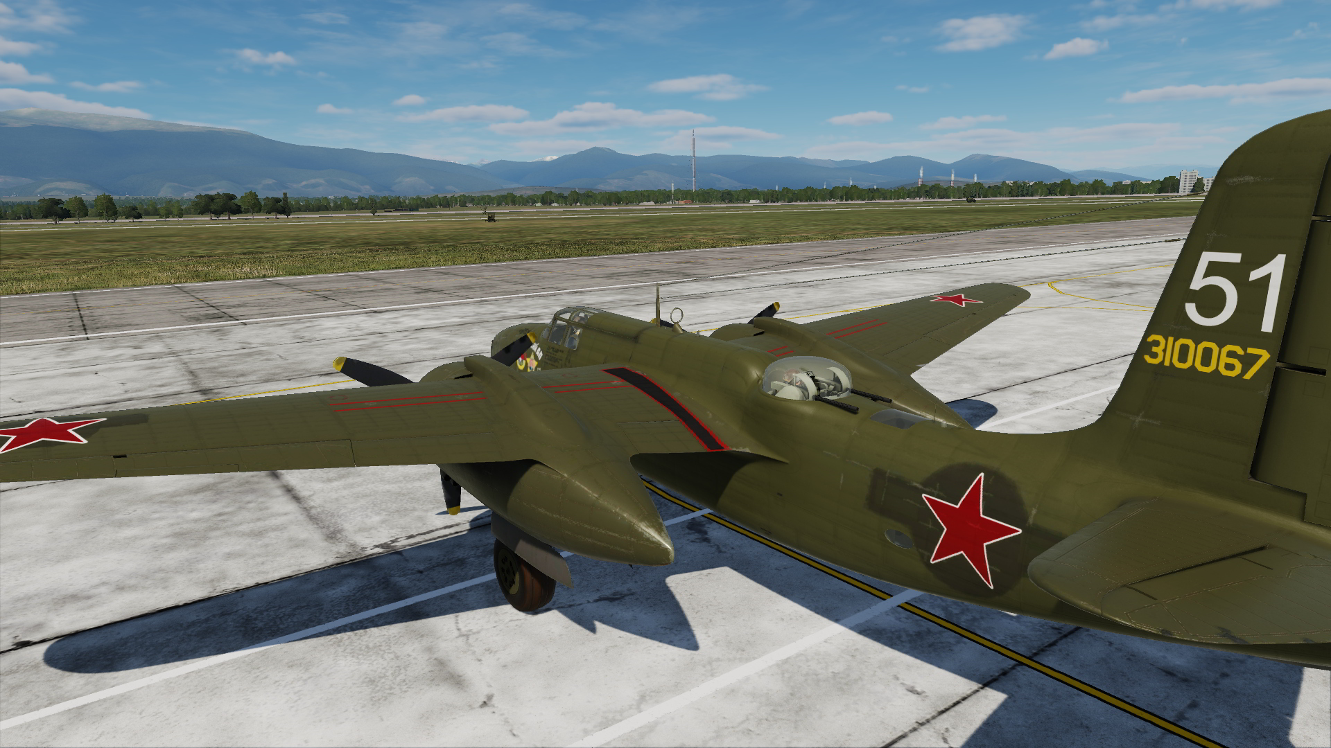 An A-20G-35-DO Ser. No. 43-10067, White 51 of the commander of the 51st Mine and Torpedo Aviation Regiment of the Red Banner Baltic Fleet, Ivan Feofanovich Orlenko, at Kolberg airfield, Germany, April-July 1945. It appears that the upper four 50 caliber guns were removed and windows added to allow for a bombardier for more accuracy in torpedo delivery. Of course, that's not an option in game so it's left without the nose glazing.