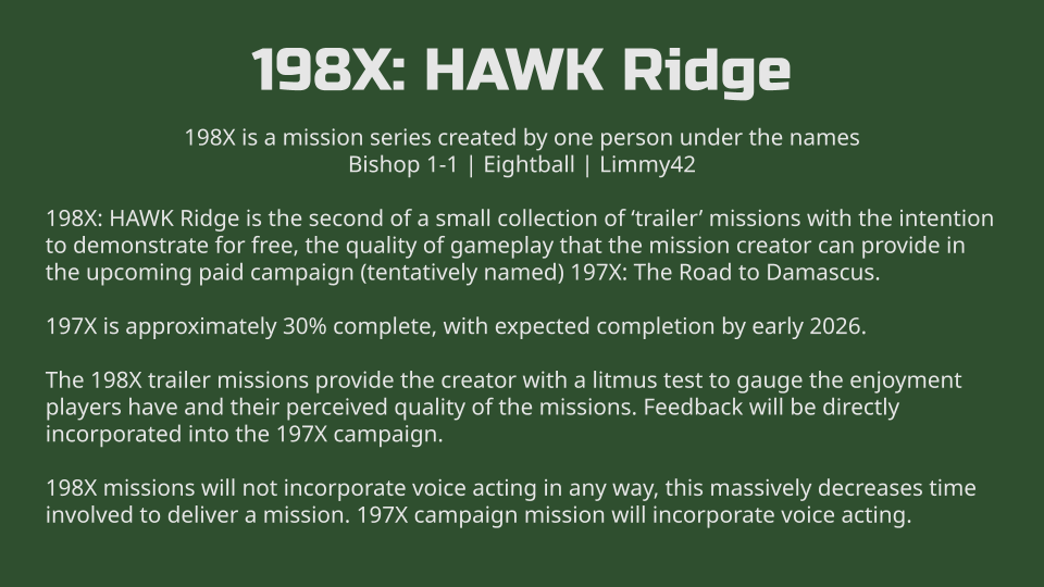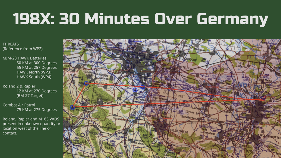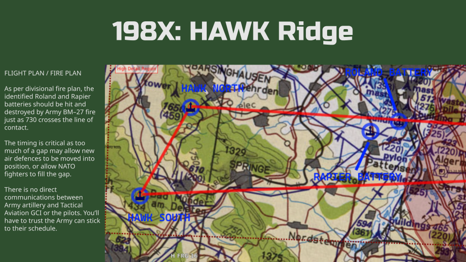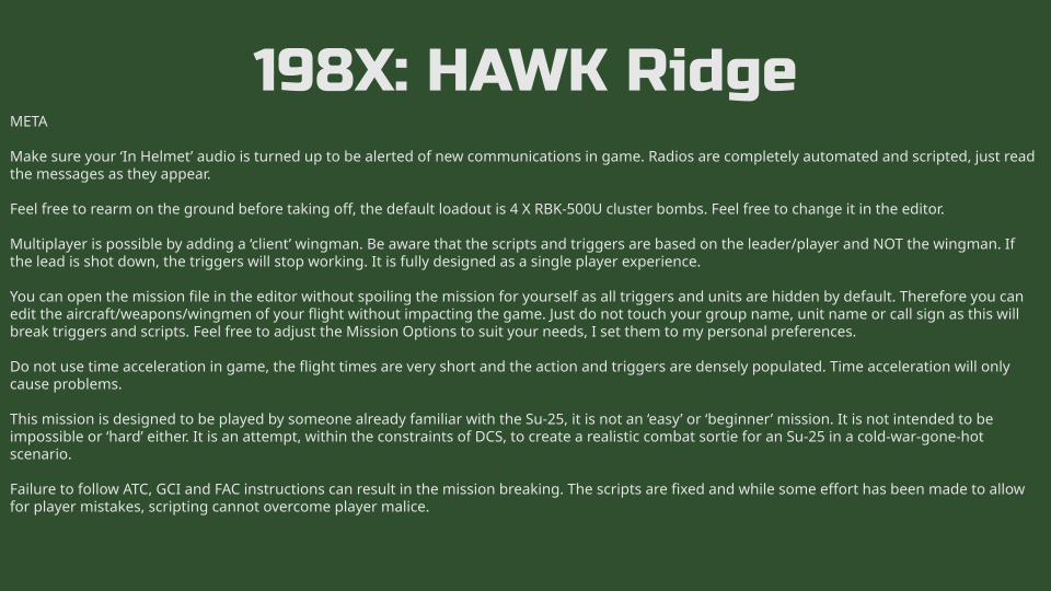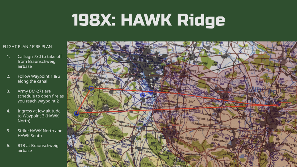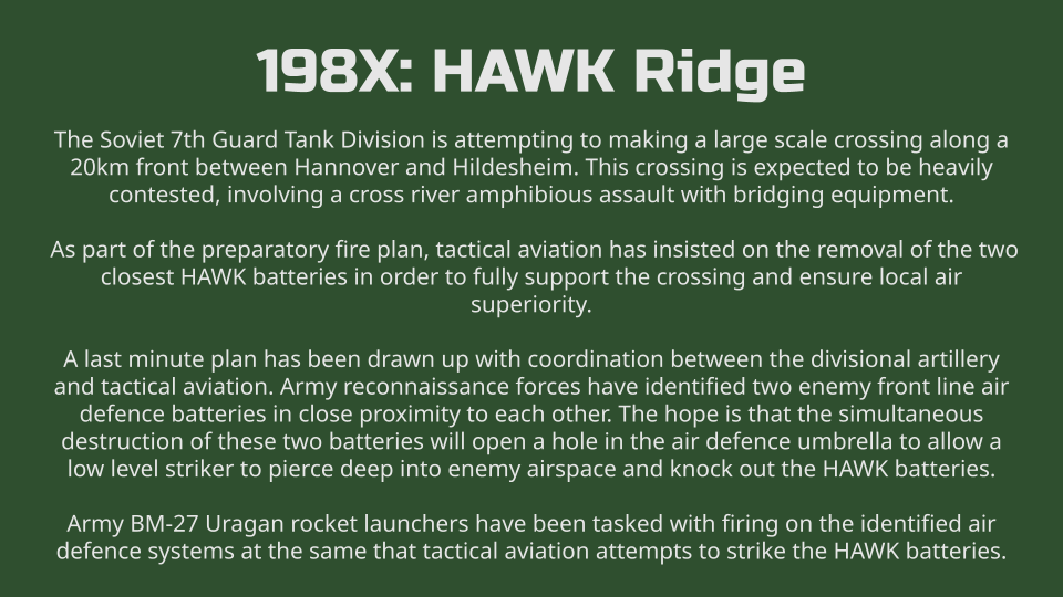 Pilot an Su-25A in the year 198X, conducting a desperate attack against two HAWK batteries in coordination with the Soviet 7th Guard Tank Division. This is a challenging mission as you go up against NATO air defences to open the skies for Soviet air power. This mission has over 20 triggers and over 300 units giving you a little slice of the Cold War Gone Hot.