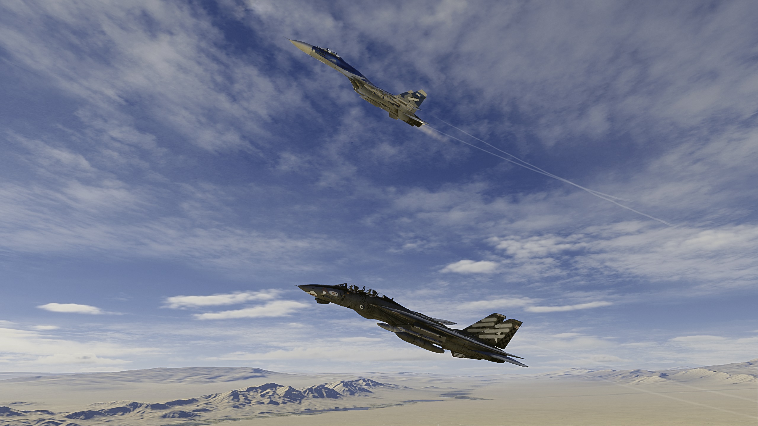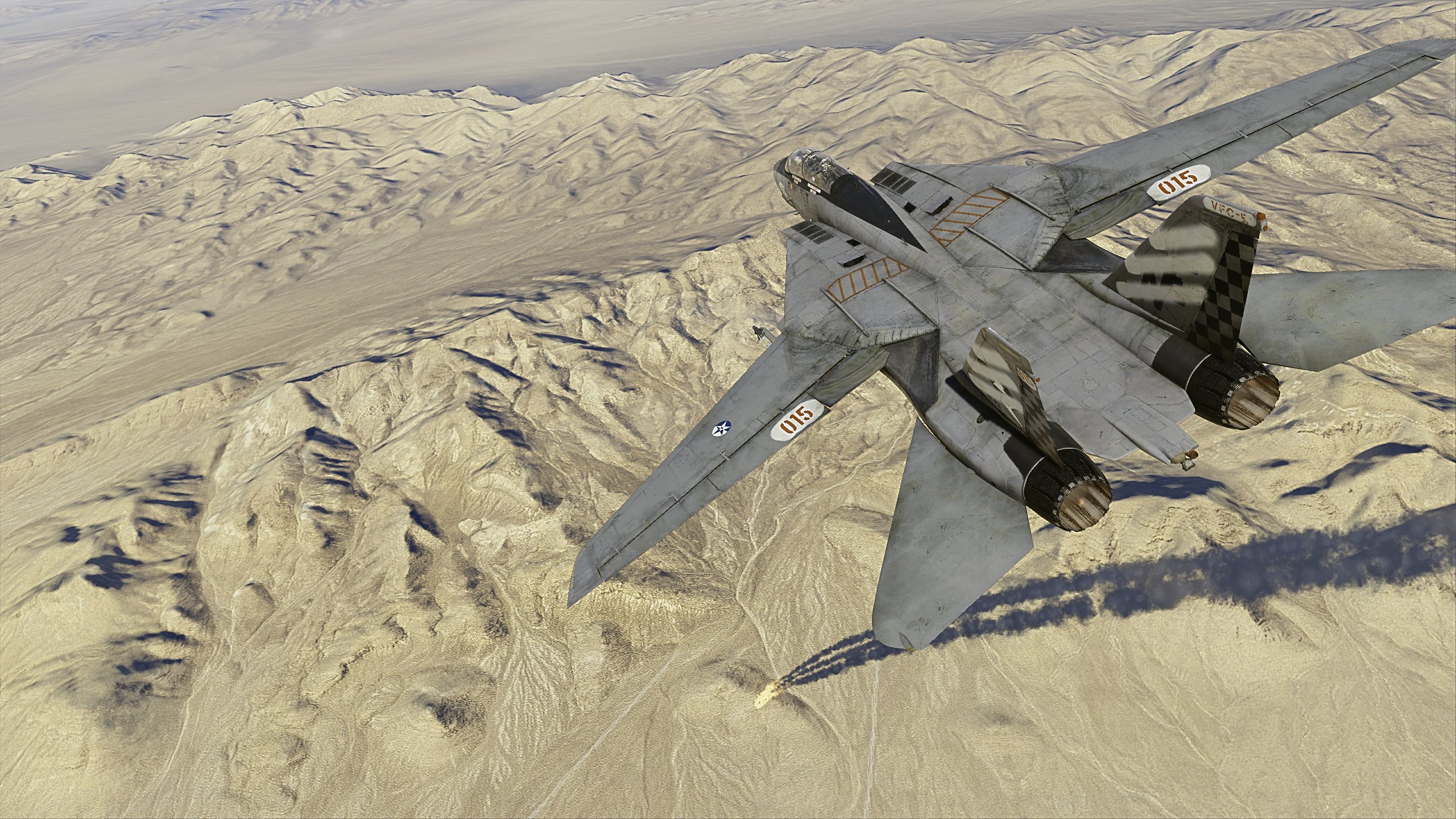 Established in 1922 as Fighting Squadron Three the Fighting Seawolves of VF-20 have led an exciting and tumultuous life as a squadron even before the 1990s. from their stint in the F4U-6 Super Corsair during the Second Osean War to their use of the F-4 Phantom in support of the Aurelian Air Force during the early parts of the 1967-1973 South Osean War. In 1971 they became the fifth squadron (excluding new establishments like VF-77 and VF-130) to transition to the brand new F-14A Tomcat and brought it into combat during their final cruise of the war. In early 1976 they were once again upgraded, this time to the F-14A+. The squadron made the first kills for the new variant on their 1980-1981 WESTPAC cruise, engaging and destroying two MiG-23 "Floggers" and an Su-24 "Fencer" of the Estovak Air Force during a few skirmishes. This aircraft, BLACKFISH 205 (BuNo. 163051), was responsible for the Sukhoi kill with LCDR Ethan "Thorn" Rose up front and LTJG Luke "Chip" Walsh in the back seat