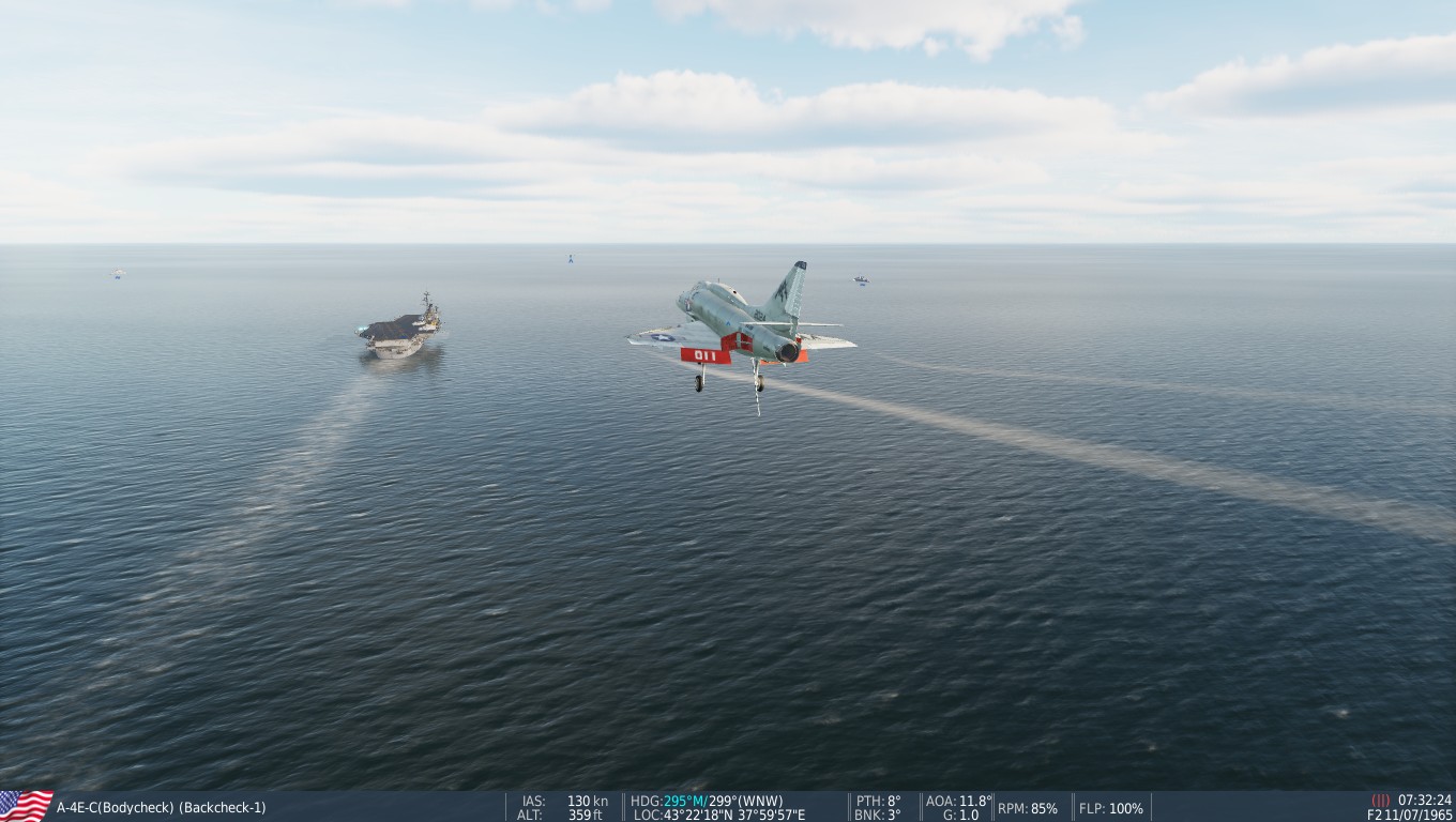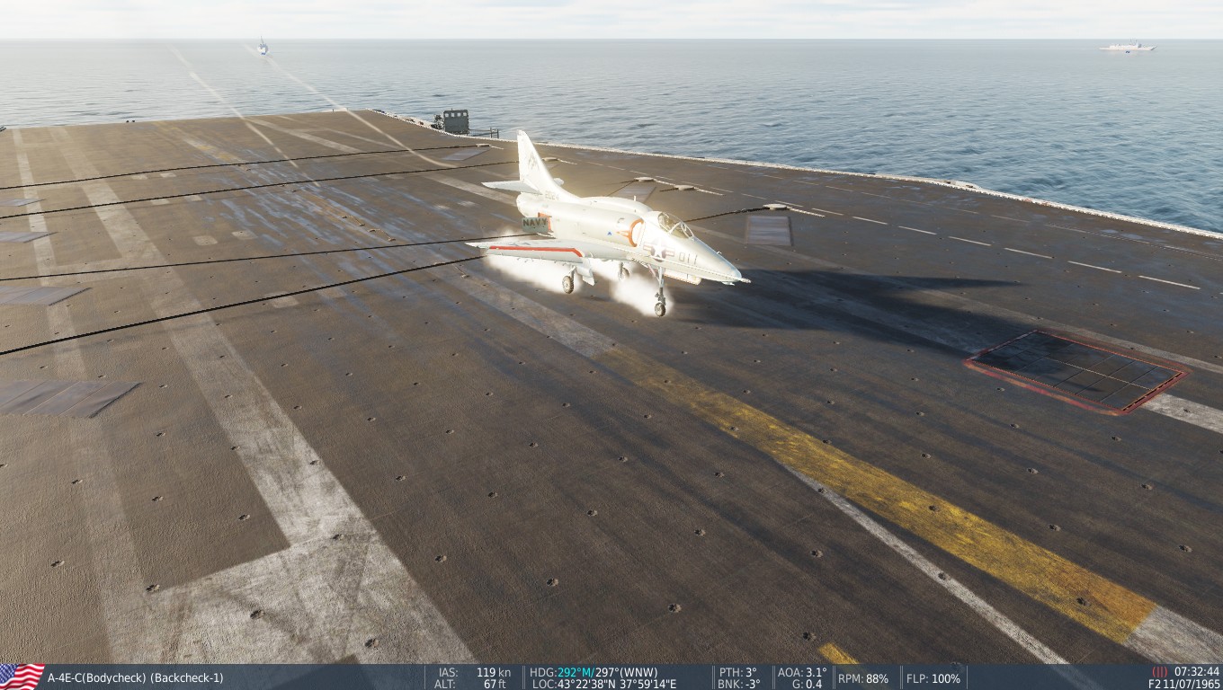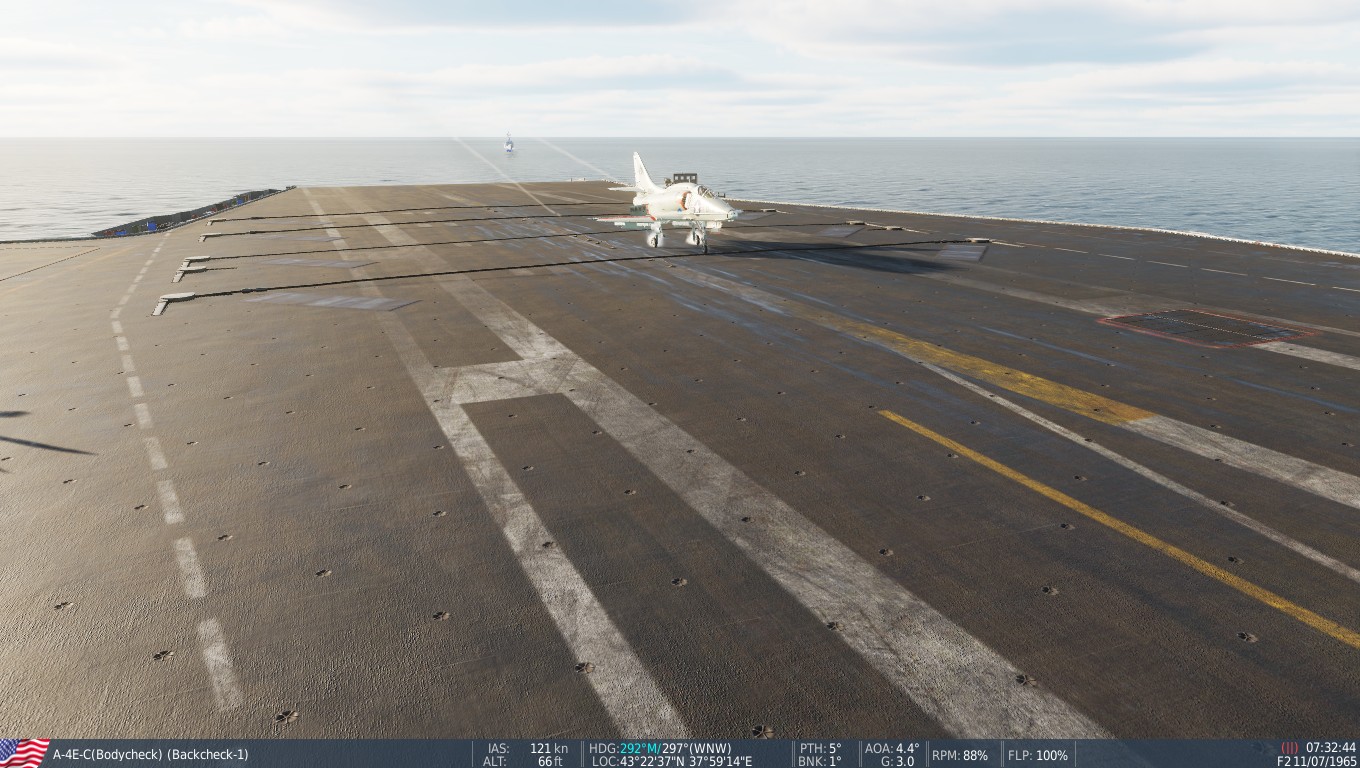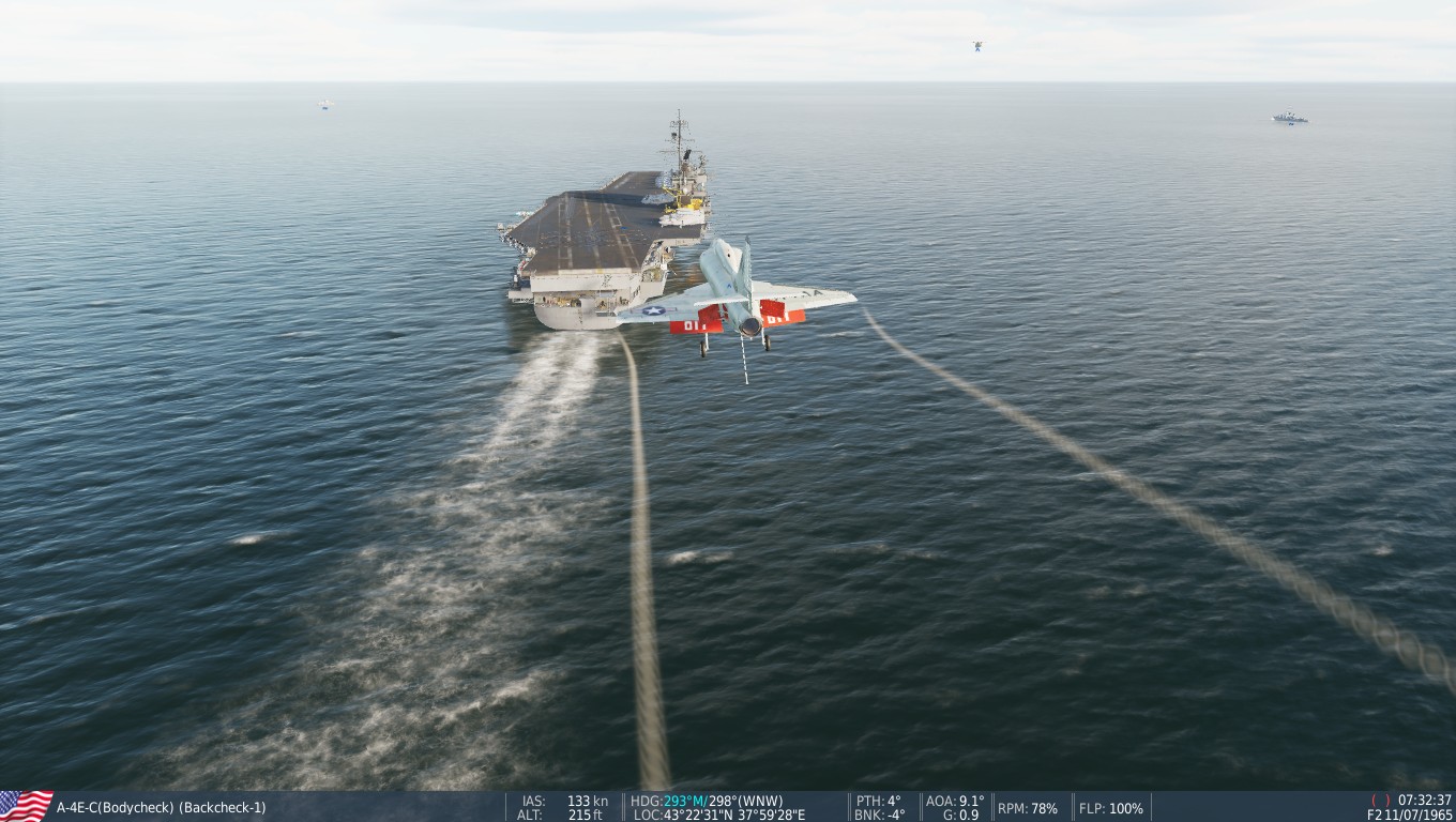 The Bon Homme Richard seems pretty small compared to the Supercarriers in DCS, but the only part you need is the landing area--the same four wires you're trying to hit on the bigger ships. Call the ball and trap aboard, and earn your Wings of Gold.