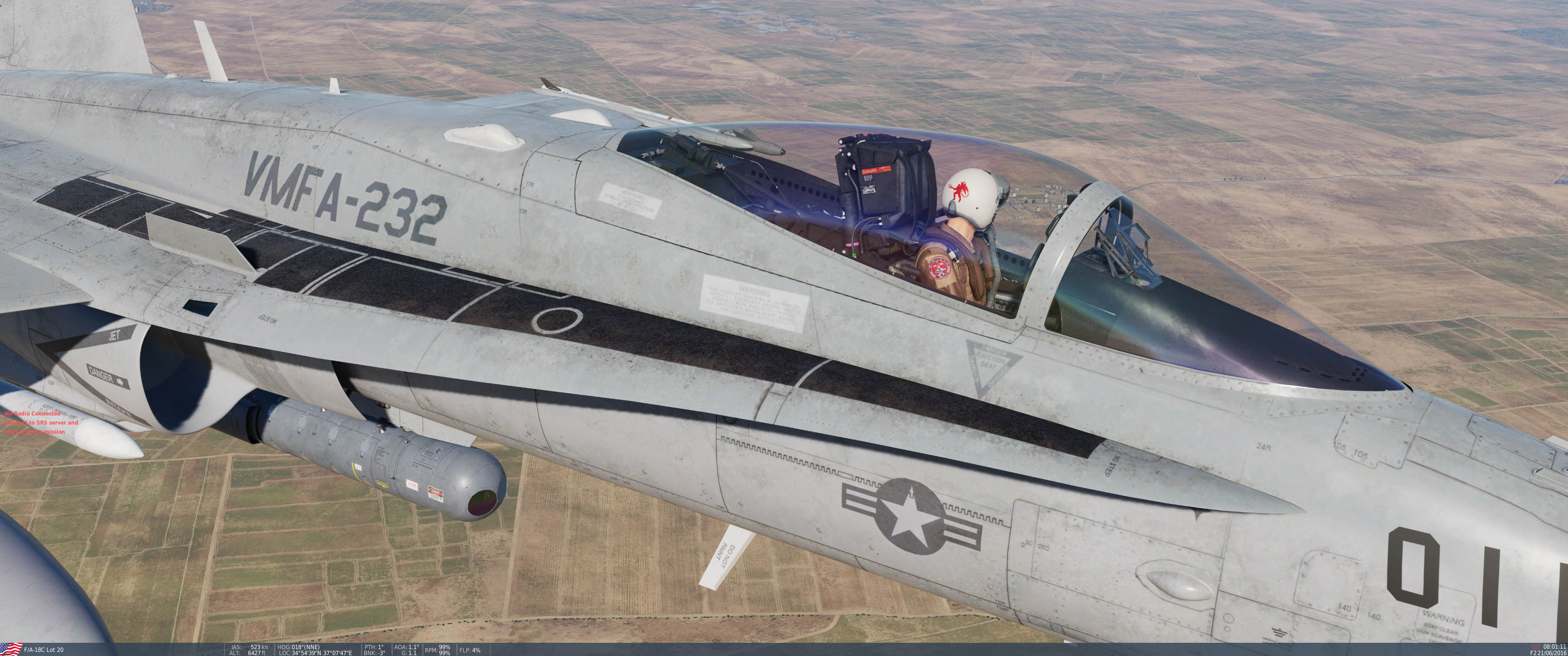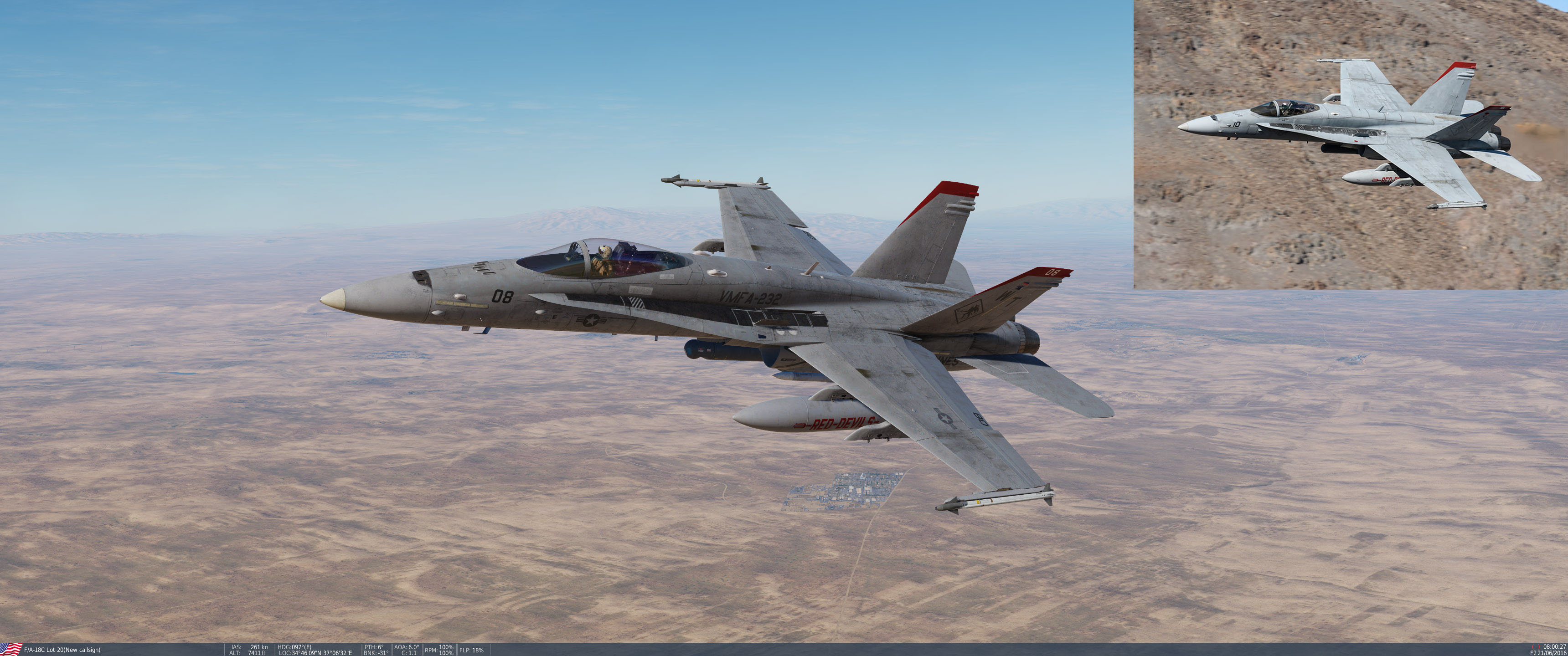 This is a modified Eagle Dynamics VMFA-232 "Red Devils" re-skin to represent 2008-2014 era squadron paint scheme with red vertical stabilizer tips that was seen during OIR. The aircraft now has a warmer gray tone with more prominent weathering.