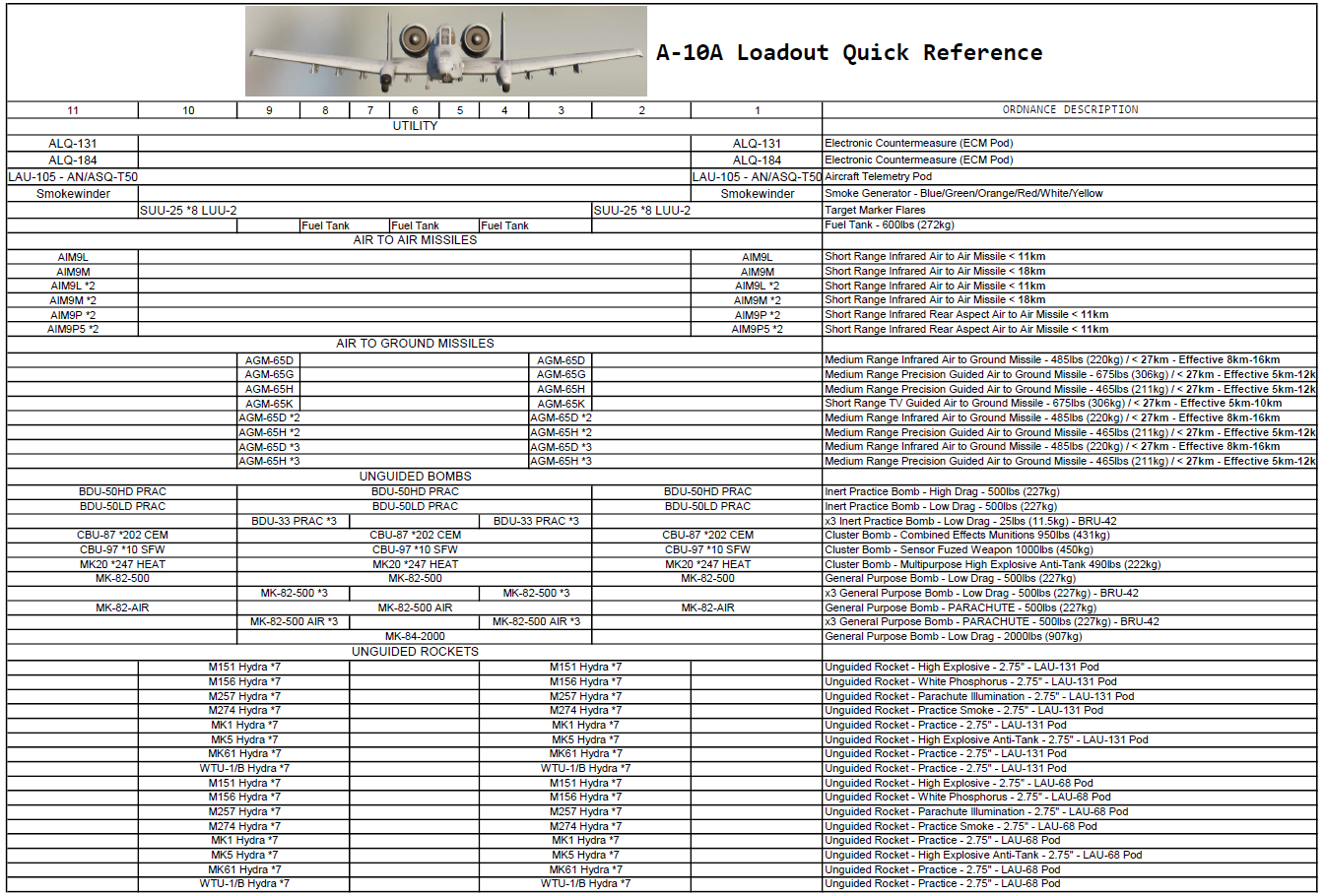 A-10A Loadout Quick Reference