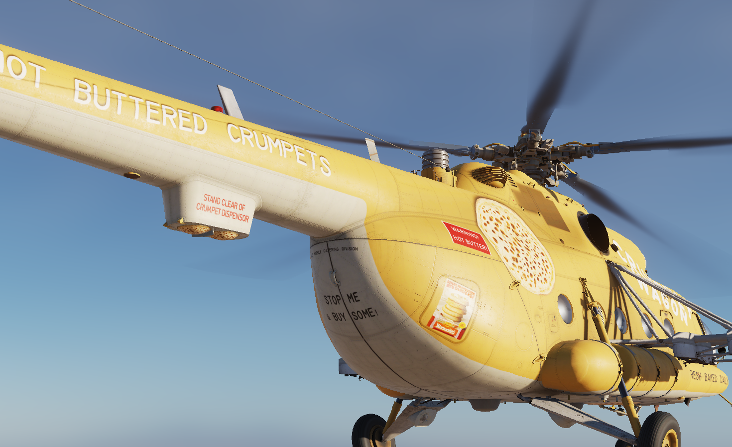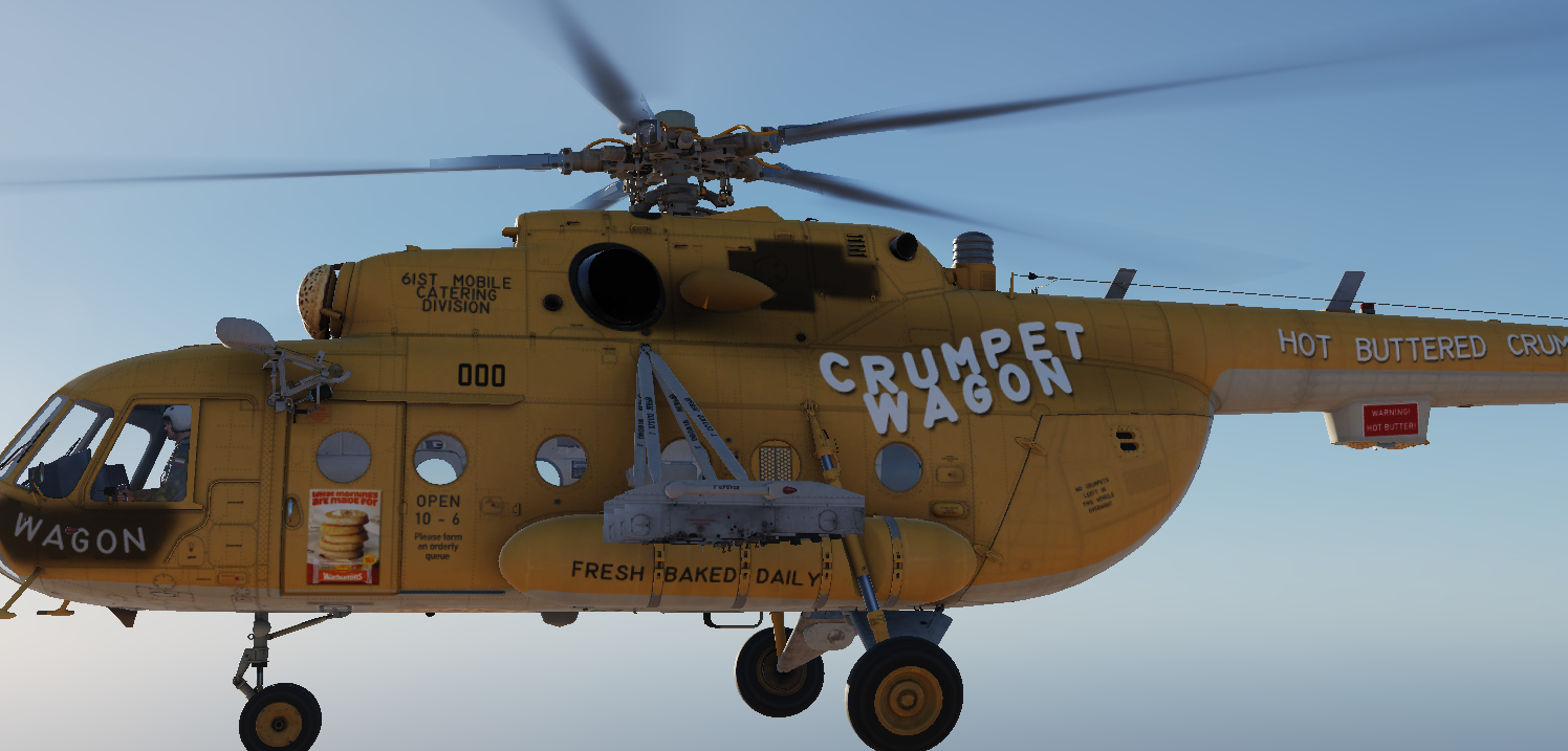 The now legendary Crumpet Wagon Mi-8 has become an invaluable resource for the 61st Squadron, delivering freshly baked hot baked goods to front line troops in all weathers and battle conditions. It is currently attached to the 61st Squadron Mobile Catering Division based out of Kobuleti.