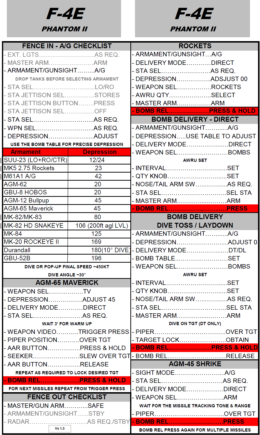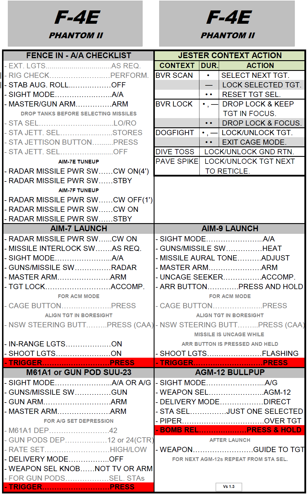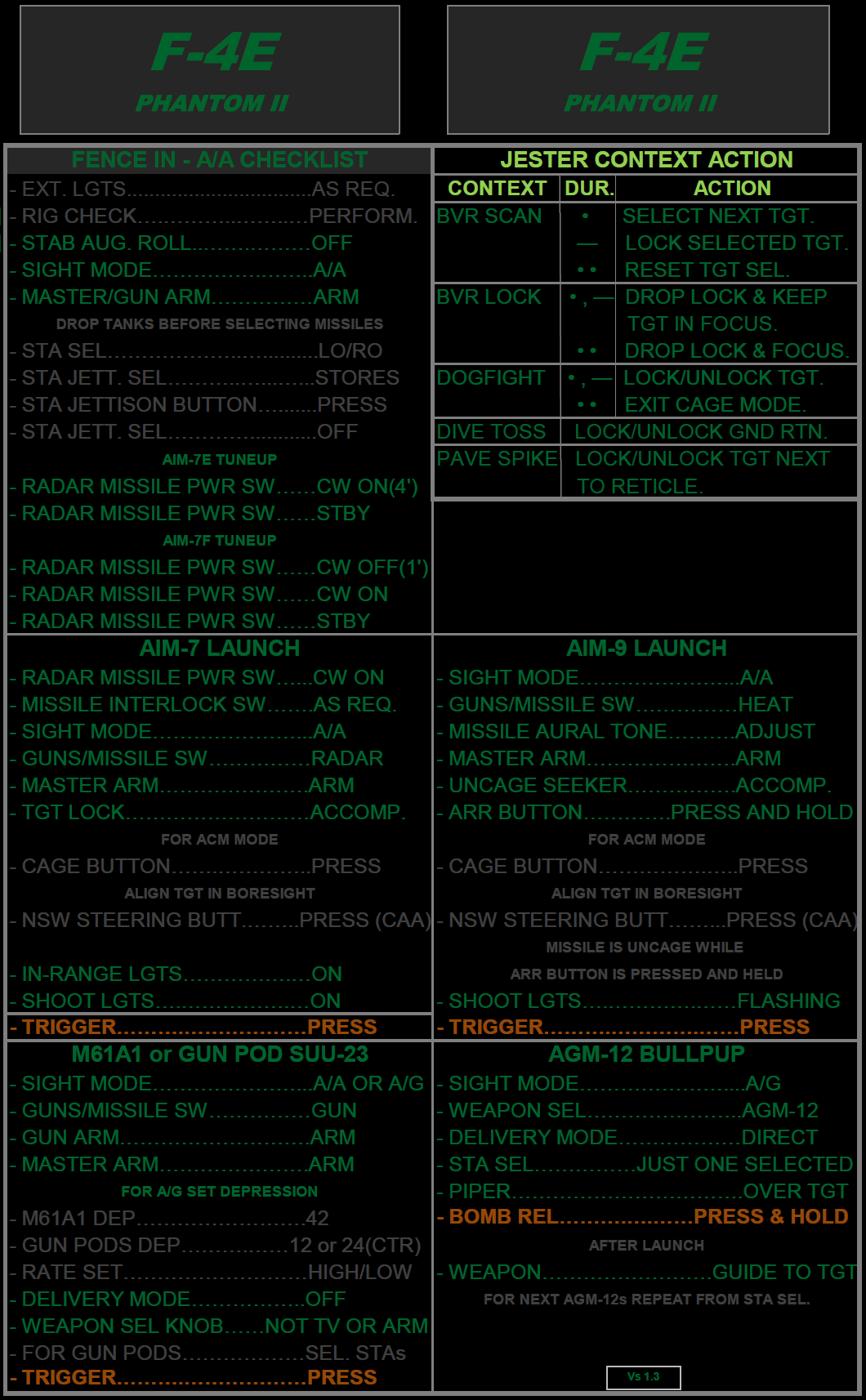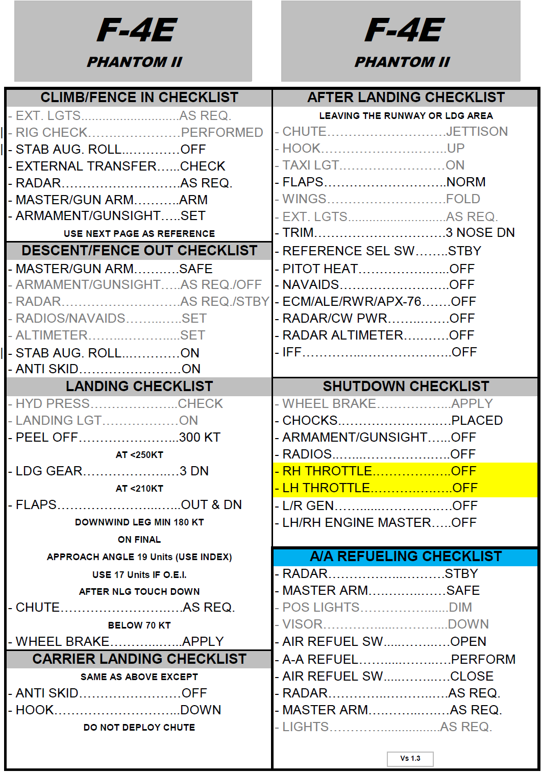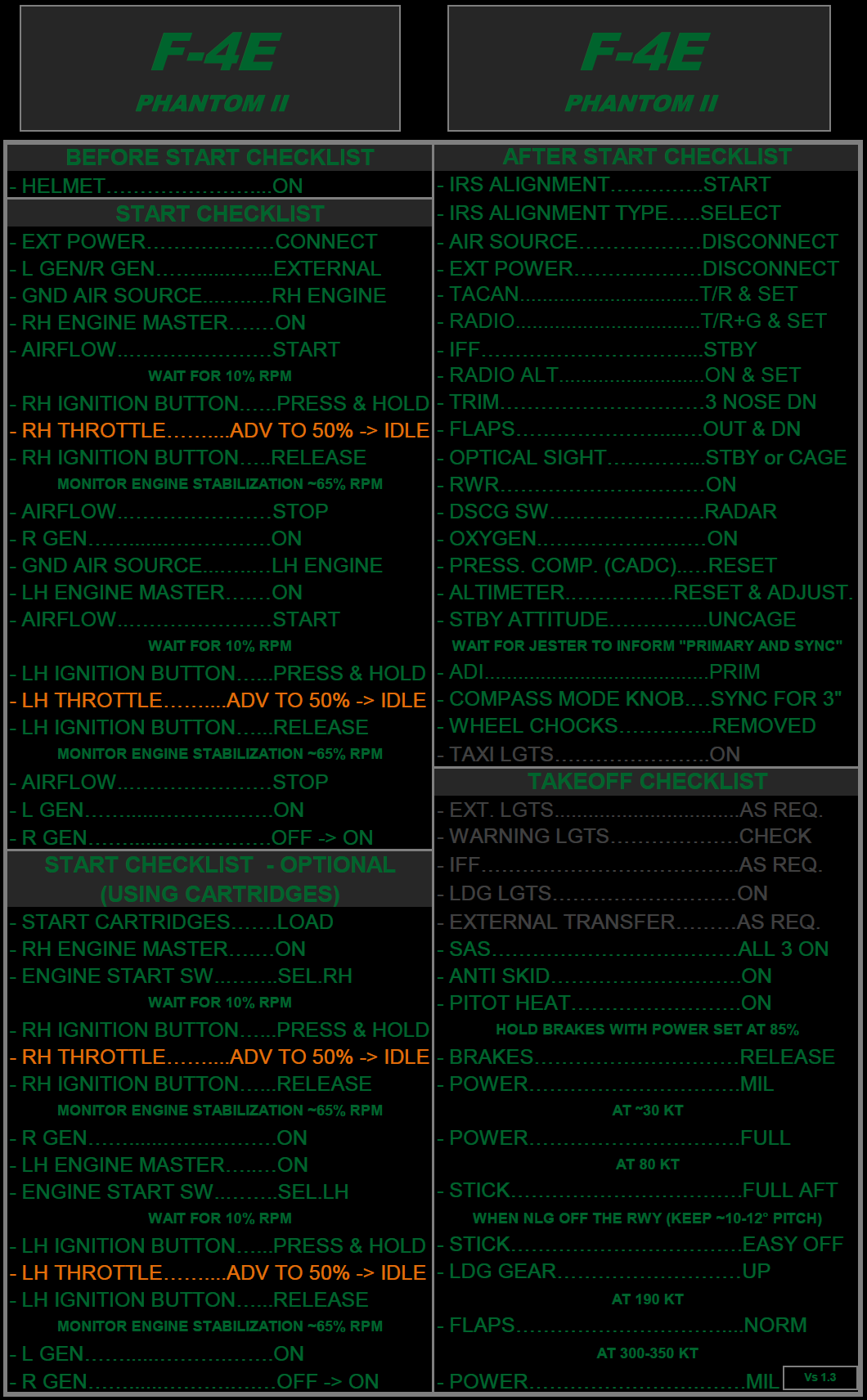 This is a checklist far from the real one, but that will get you flying quick and safely. This is the version of the F-4E Phantom II Checklist (Day and Night Ops).