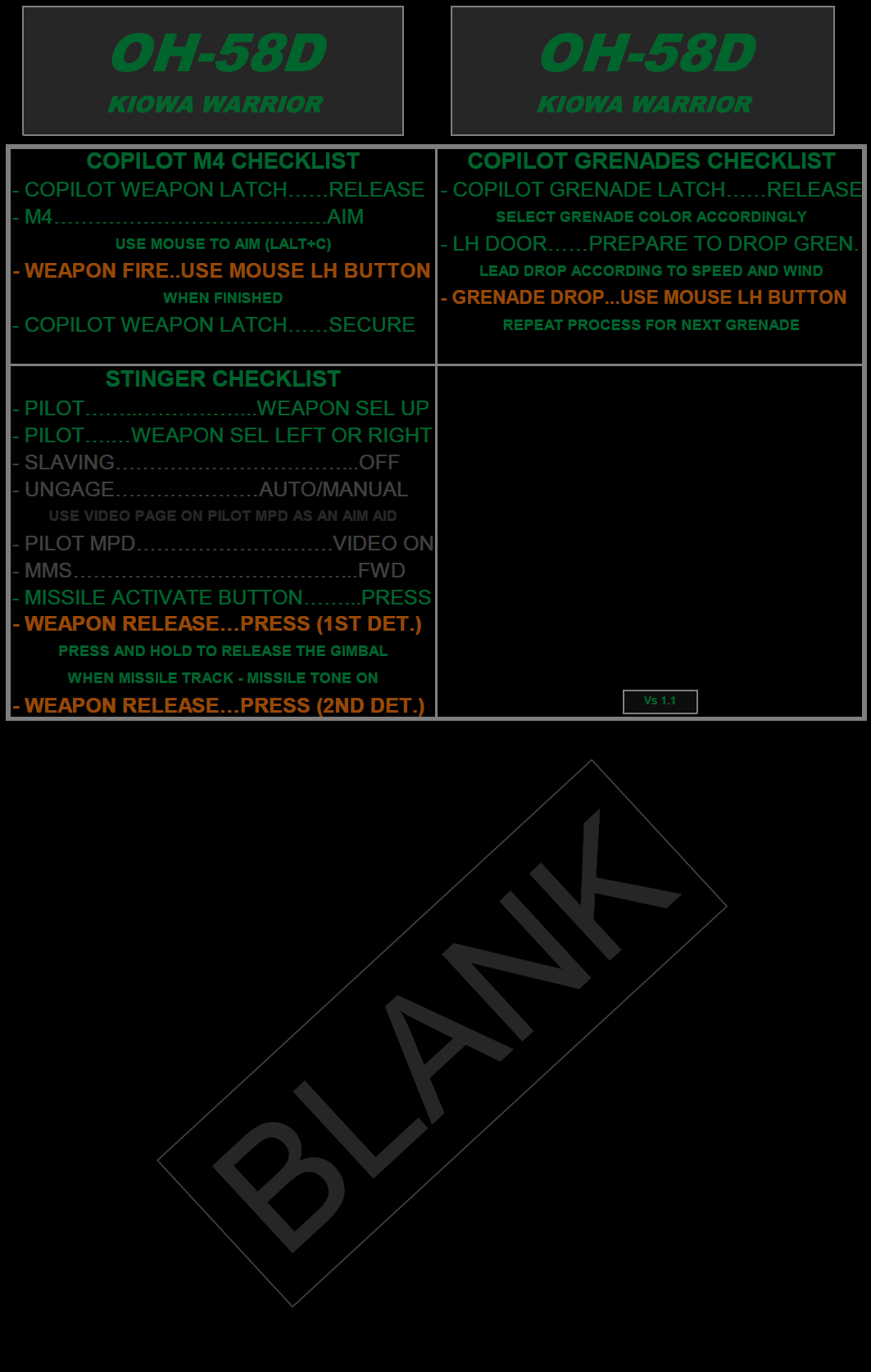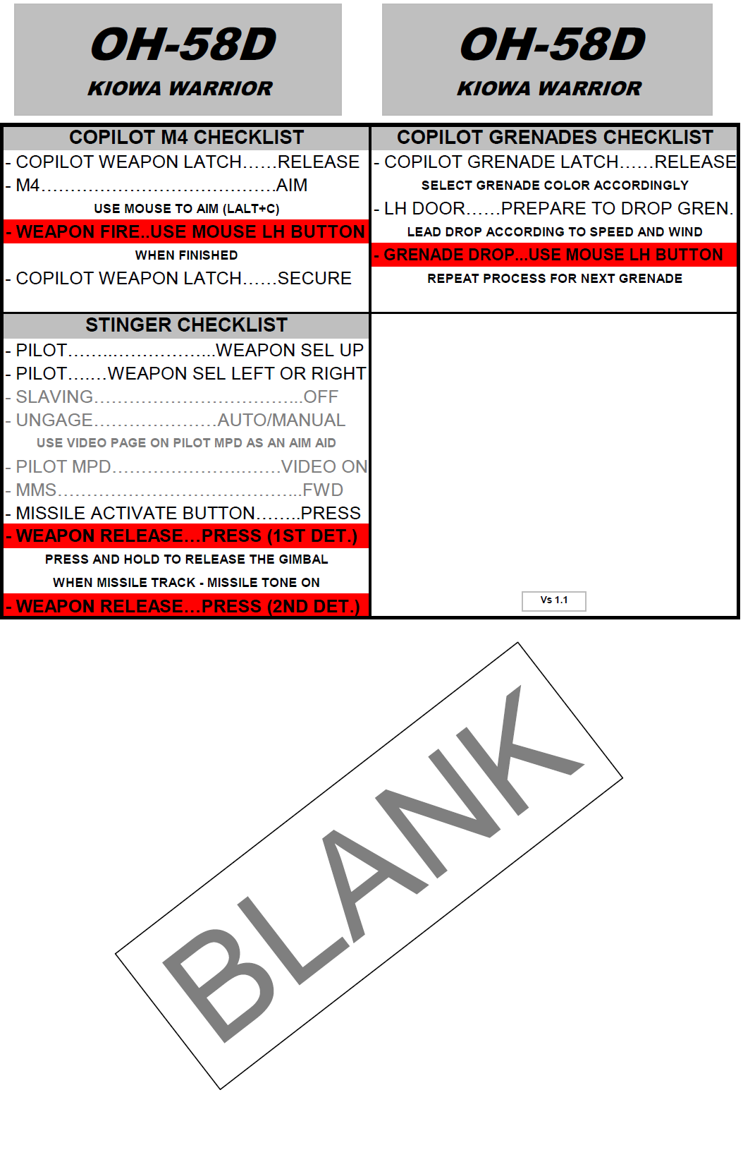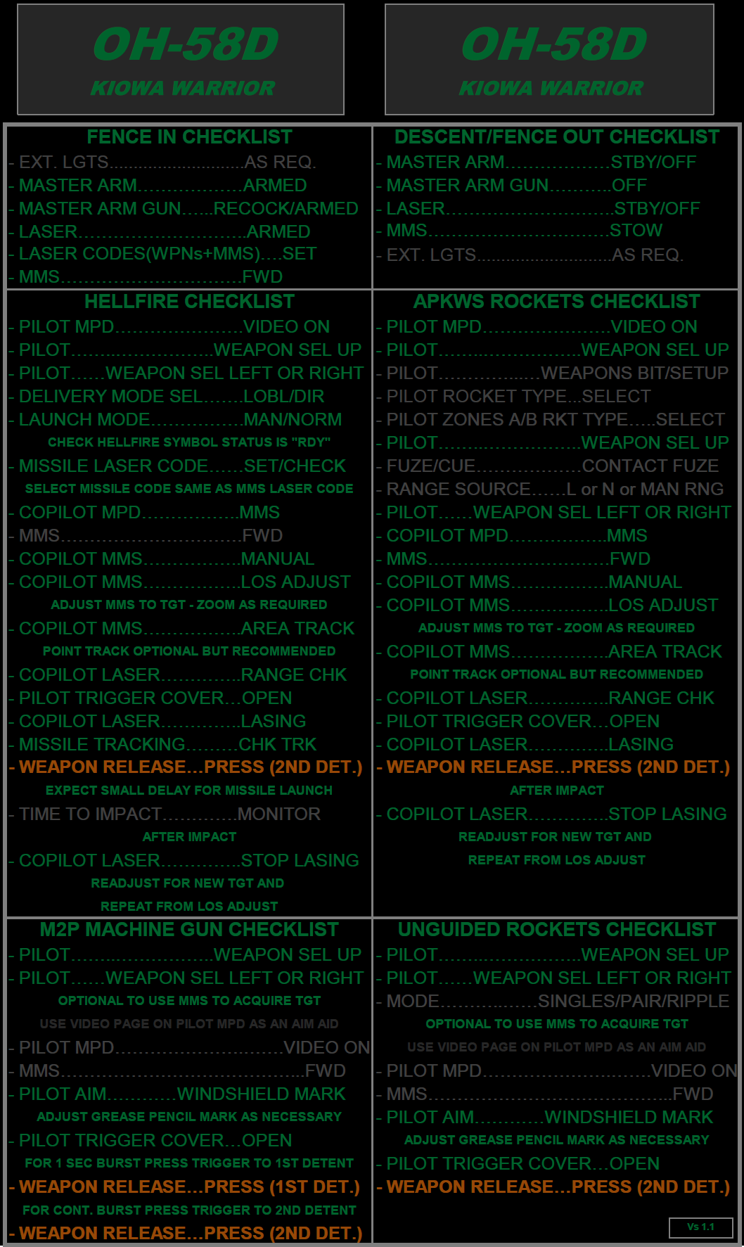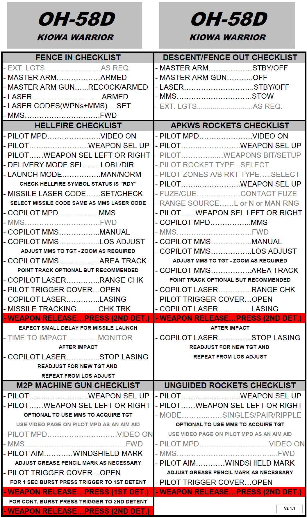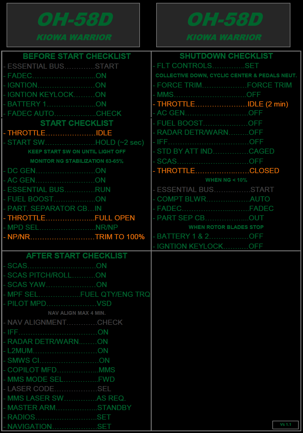 This is a checklist far from the real one, but that will get you flying quick and safely. This is the version of the OH-58D Kiowa Warrior Checklist (Day and Night Ops).