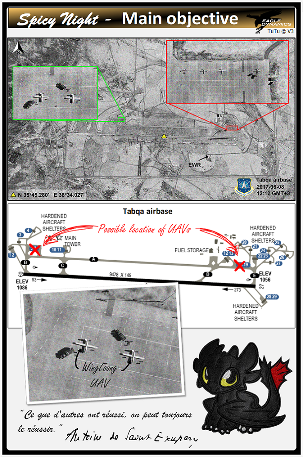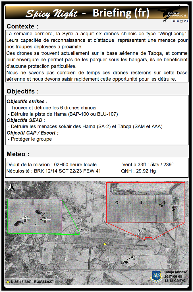 Cette opération a pour but d’affaiblir la logistique ennemie tout en réduisant sa capacité aérienne. Notre premier objectif sera de détruire la piste et les dépôts de carburant de la base aérienne Al Qusayr.