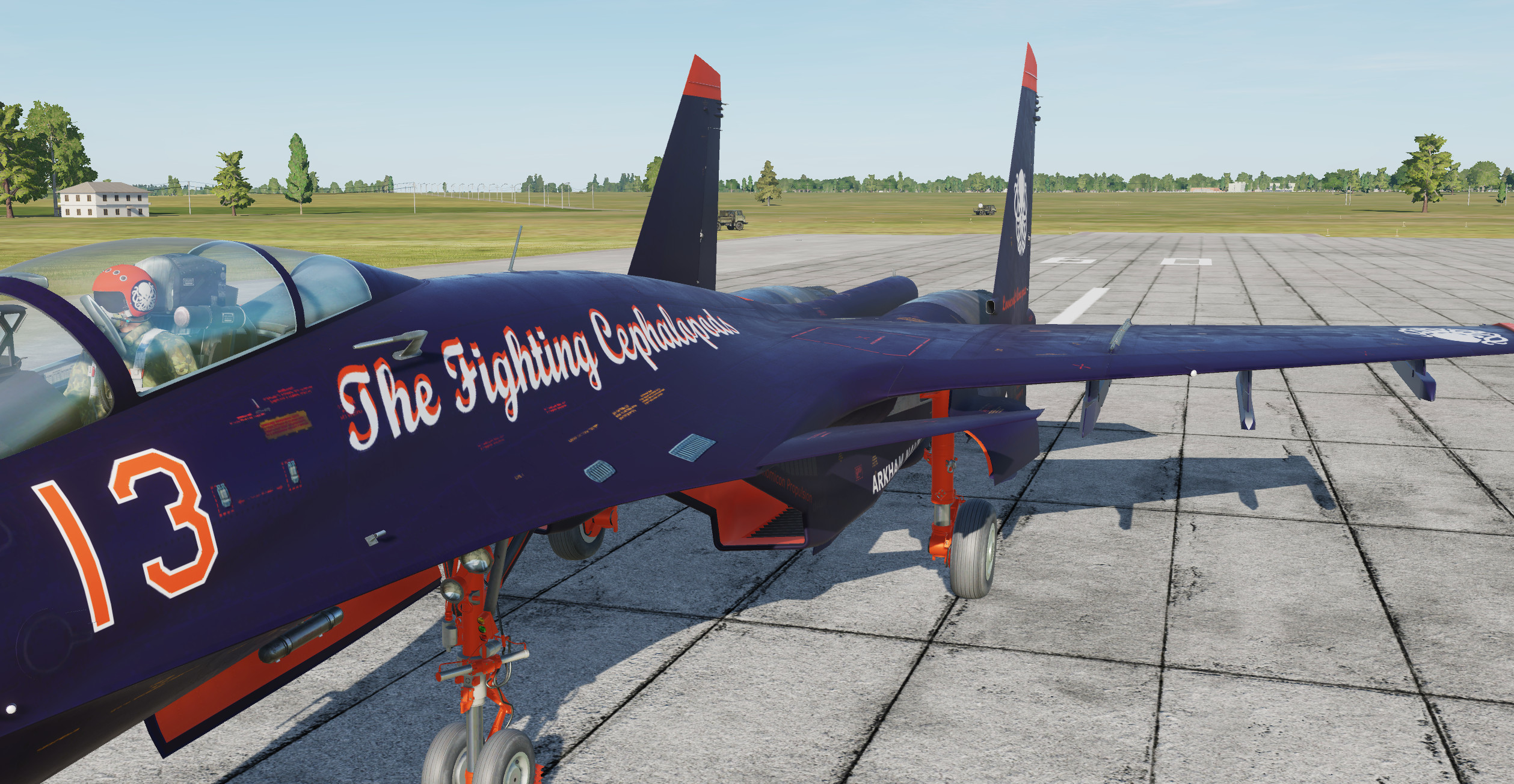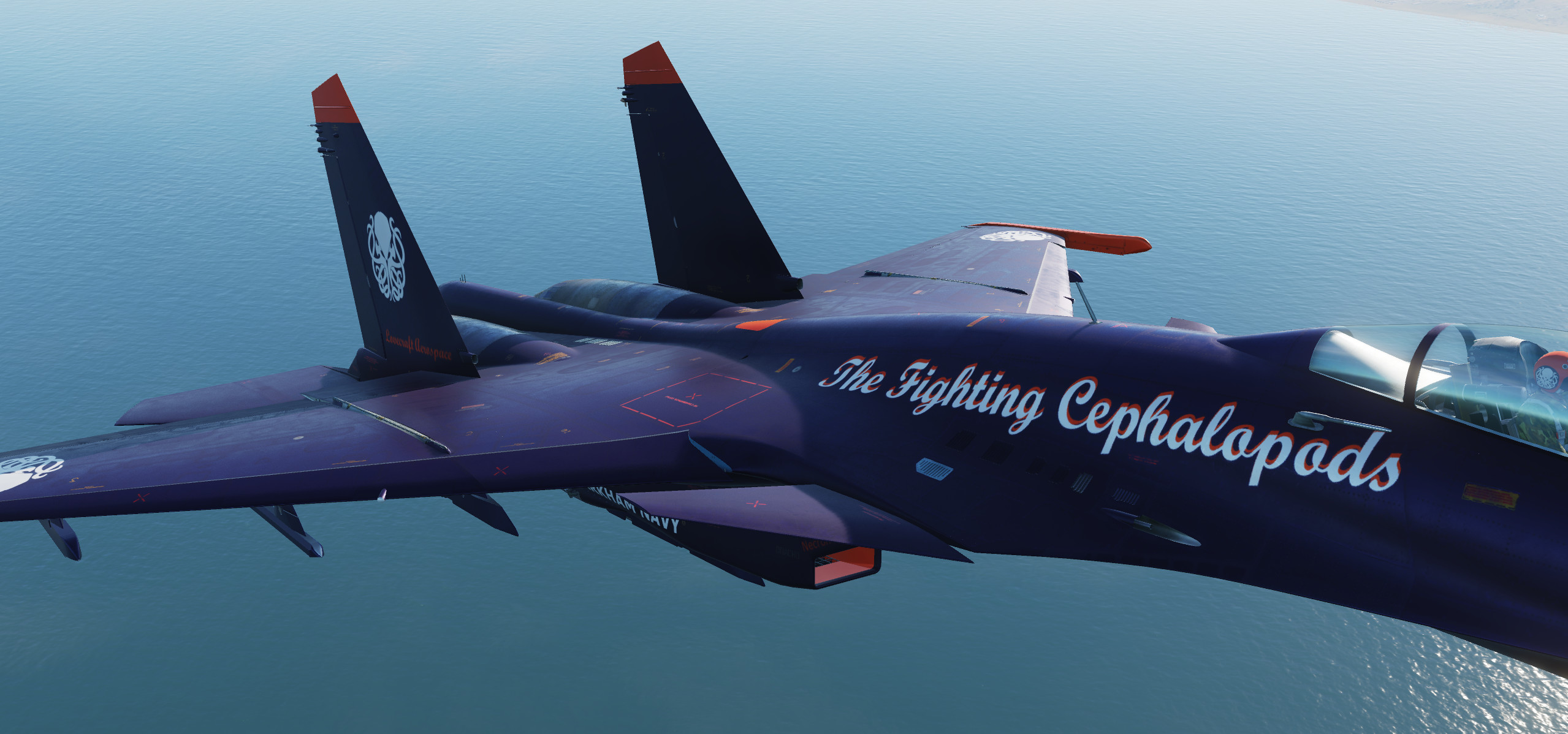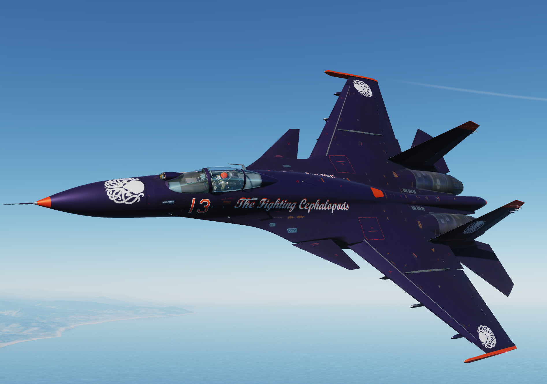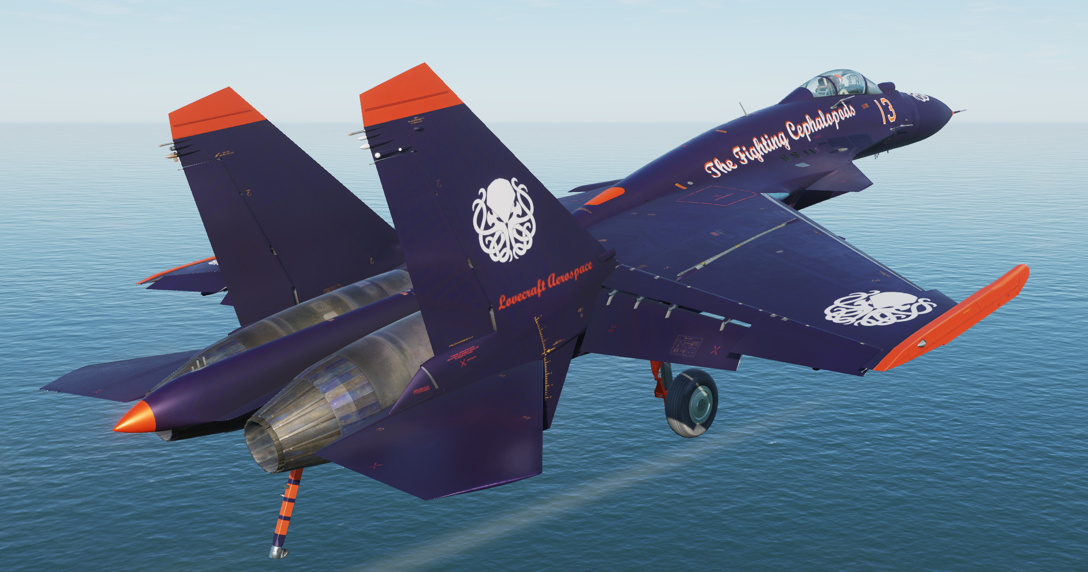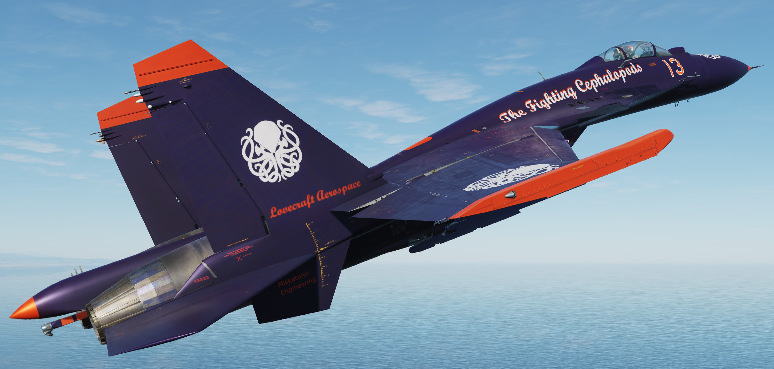 From the Cthulhu logo on the tail, nose, wings and pilot helmet to the Arkham Navy registration, "The Fighting Cephalopods" squadron is ready to take on all threats.  Fly the Su-33 specially built by Lovecraft Aerospace, Miskatonic Engineering and Necronomicon Propulsion and lead the way to victory in this dimension or any other!