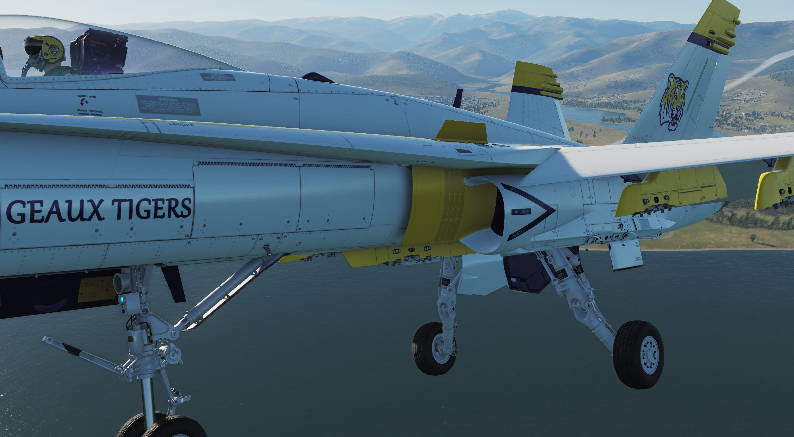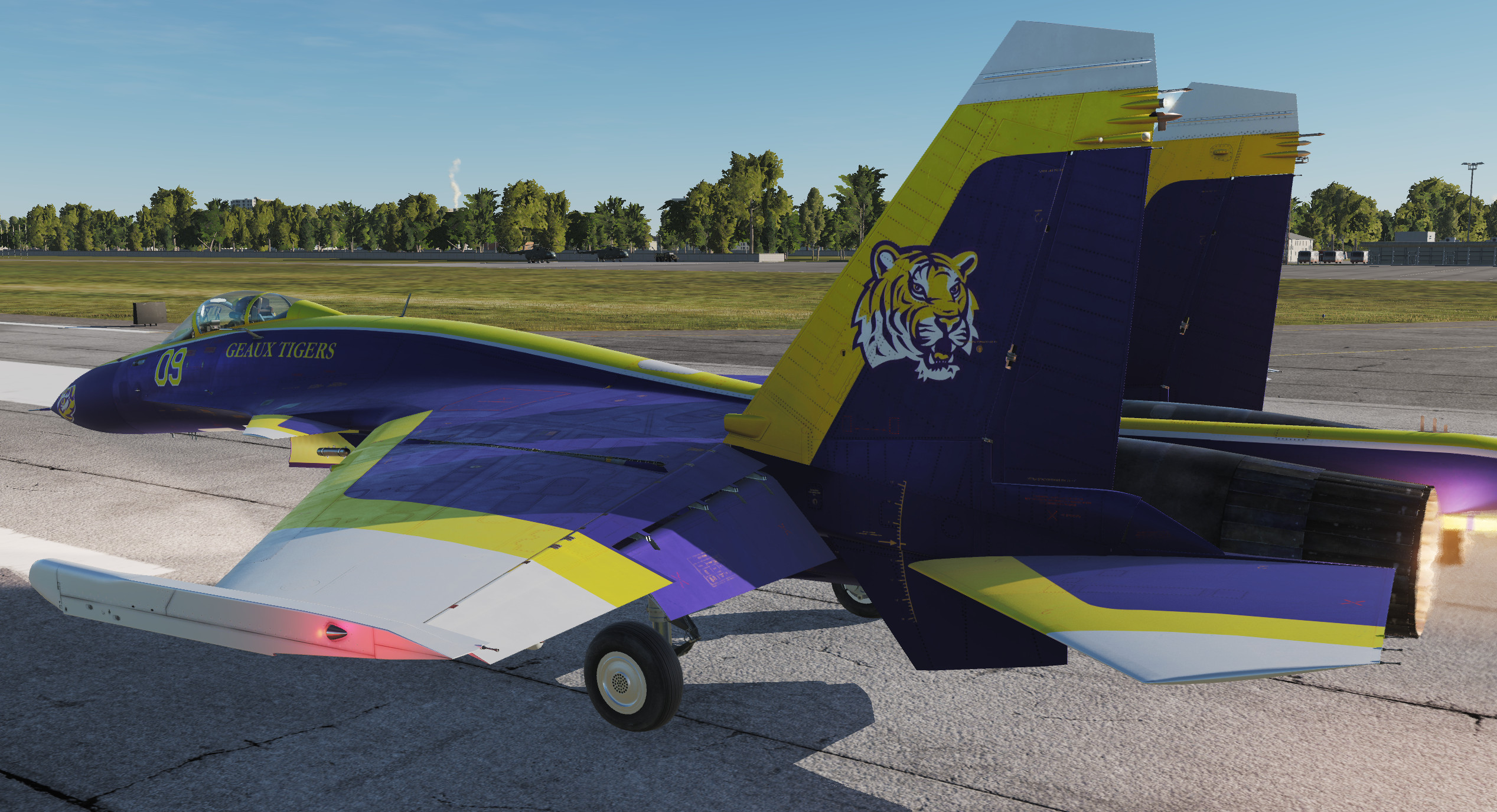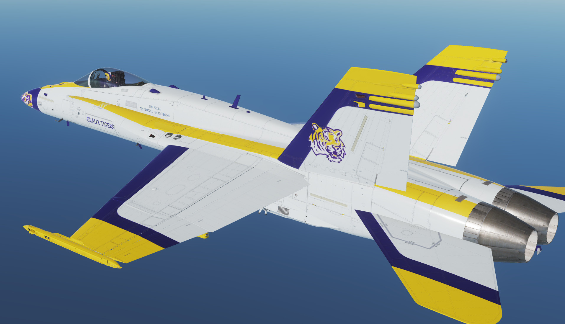 This Hornet skin is based on the uniform, logo and field of the LSU (Louisiana State University) 2019 National Champion college football team.  Included are both a clean airshow and dirty combat version of the paint scheme.   I've also created a new and improved version for the Hornet you can find by searching for "LSU Tiger Hornet Championship Edition" (it has a different paint scheme name in mission editor so both versions can coexist) and an Su33 version based on their alternate purple jerseys, you can find that one by searching for "LSU Tiger Su33".