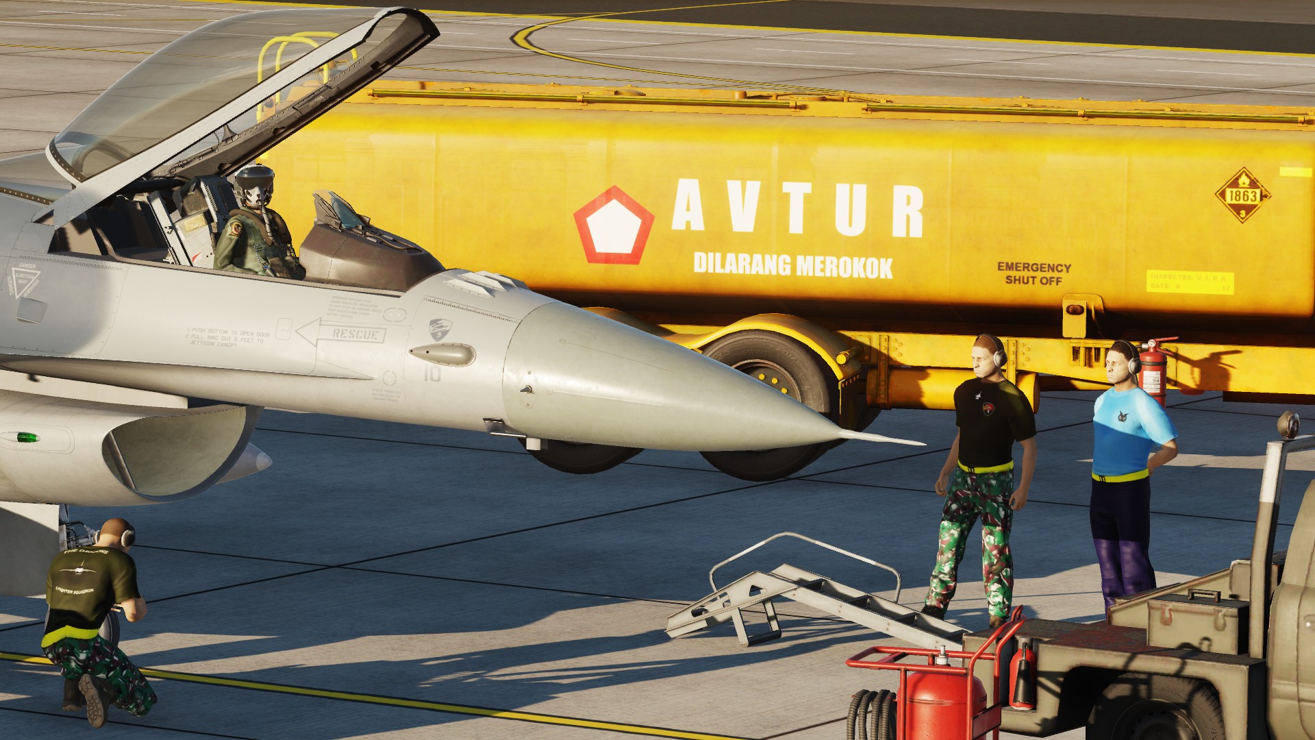 A F-16AM (simulated using F-16C) with the ground crew in operation.