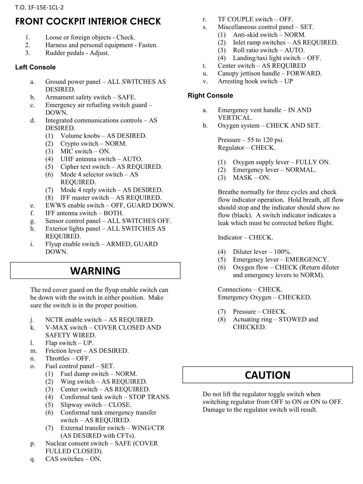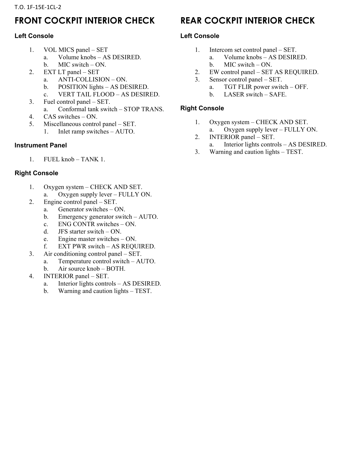 Checklist for the F/A-18C, based on the NATOPS, with some non-functional and not applicable items removed for brevity. Six PNGs that can be loaded in your Saved Games (C:\Users\USERNAME\Saved Games\DCS.openbeta\Kneeboard\FA-18C_hornet) and one collected PDF with all six pages.