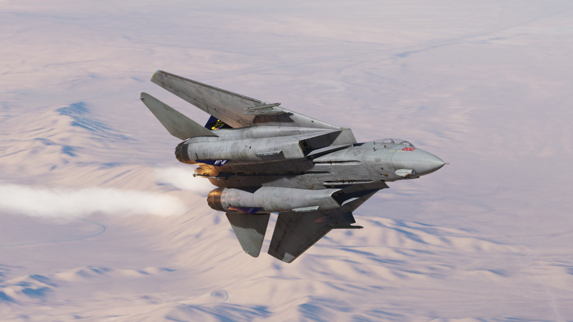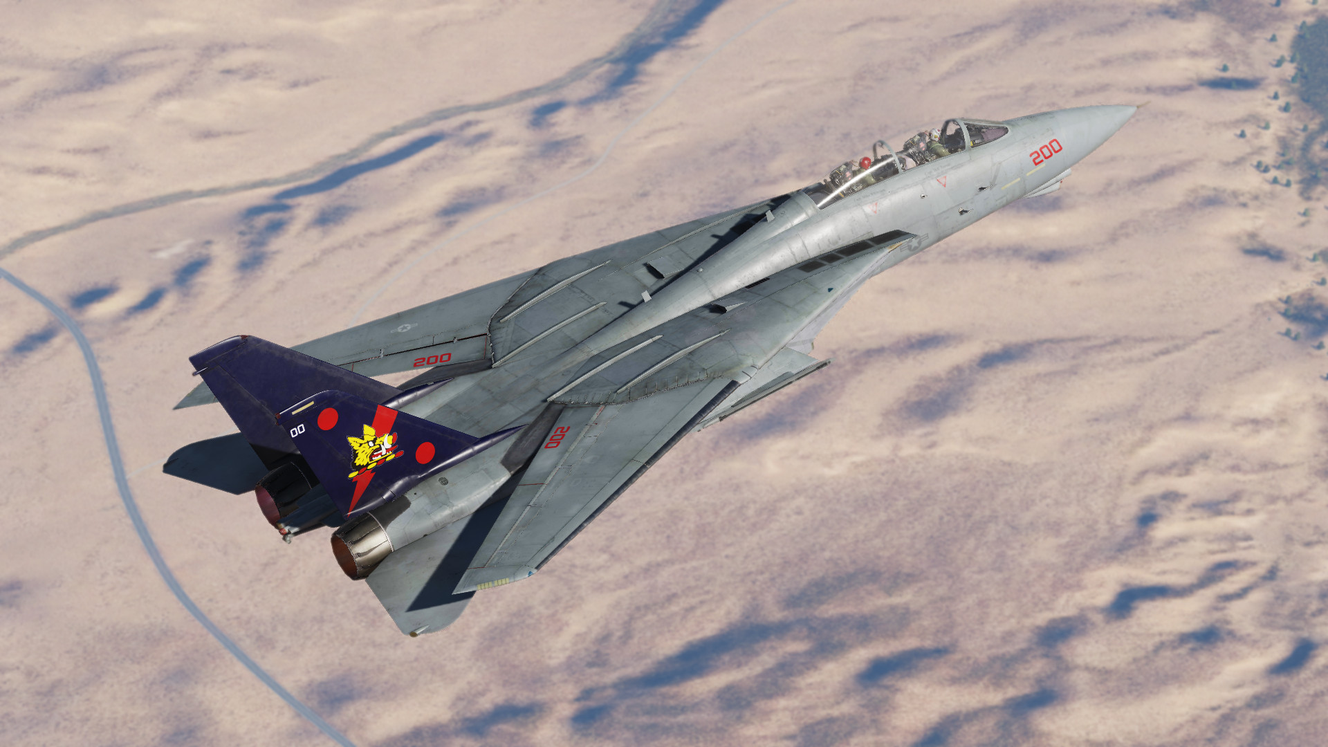 Another livery from CVW-7 circa 1998; this time it's modex 200 of the VF-11 Red Rippers. The jet in question was a B model tomcat, so you should put the zip file directly into DCS World OpenBeta\CoreMods\aircraft\F14\Liveries\f-14b, but I'm not a cop, you can put it in the A model's livery folder if you want.