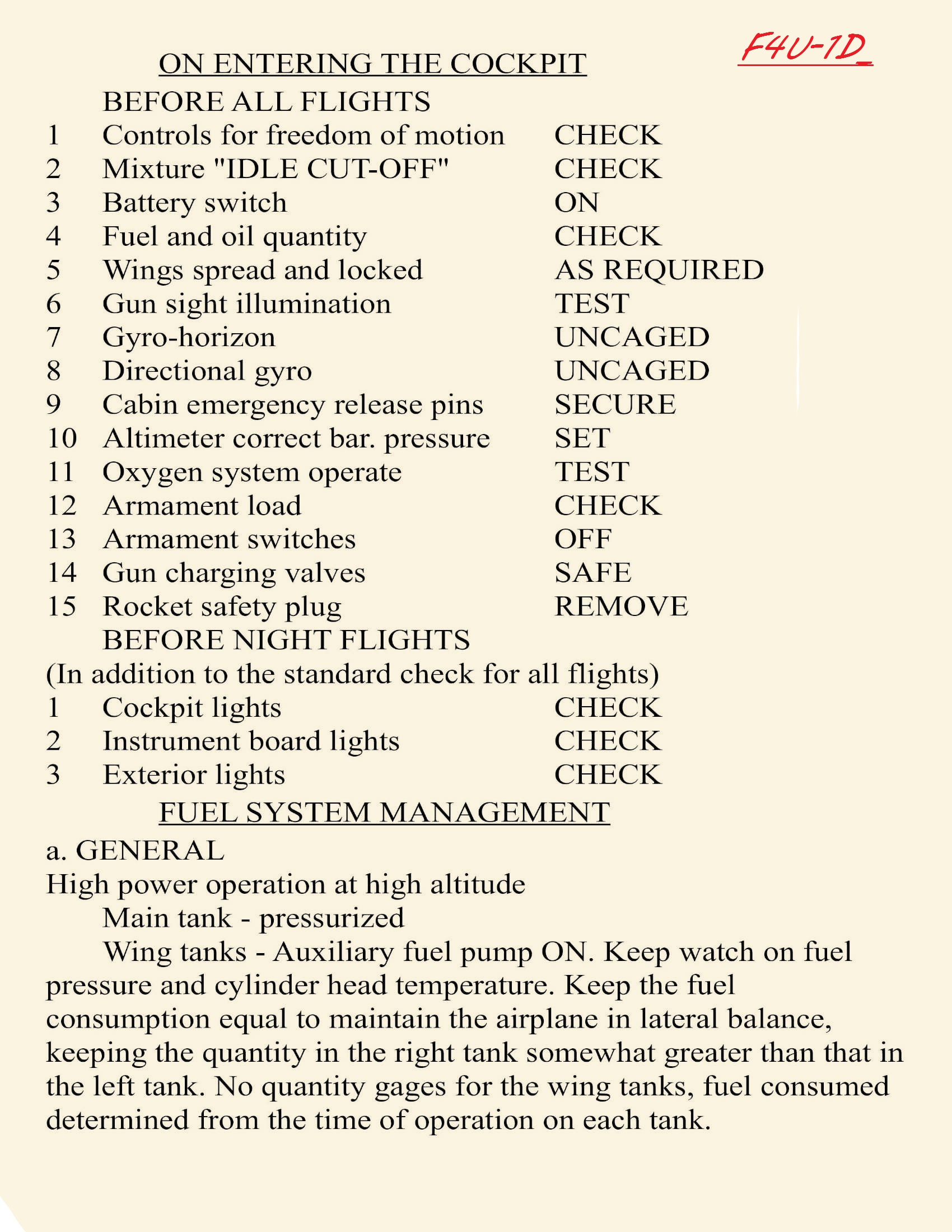 Real checklist from F4U1 Pilots Handbook of Flight Operating Instructions - AN 01-45HA-1.