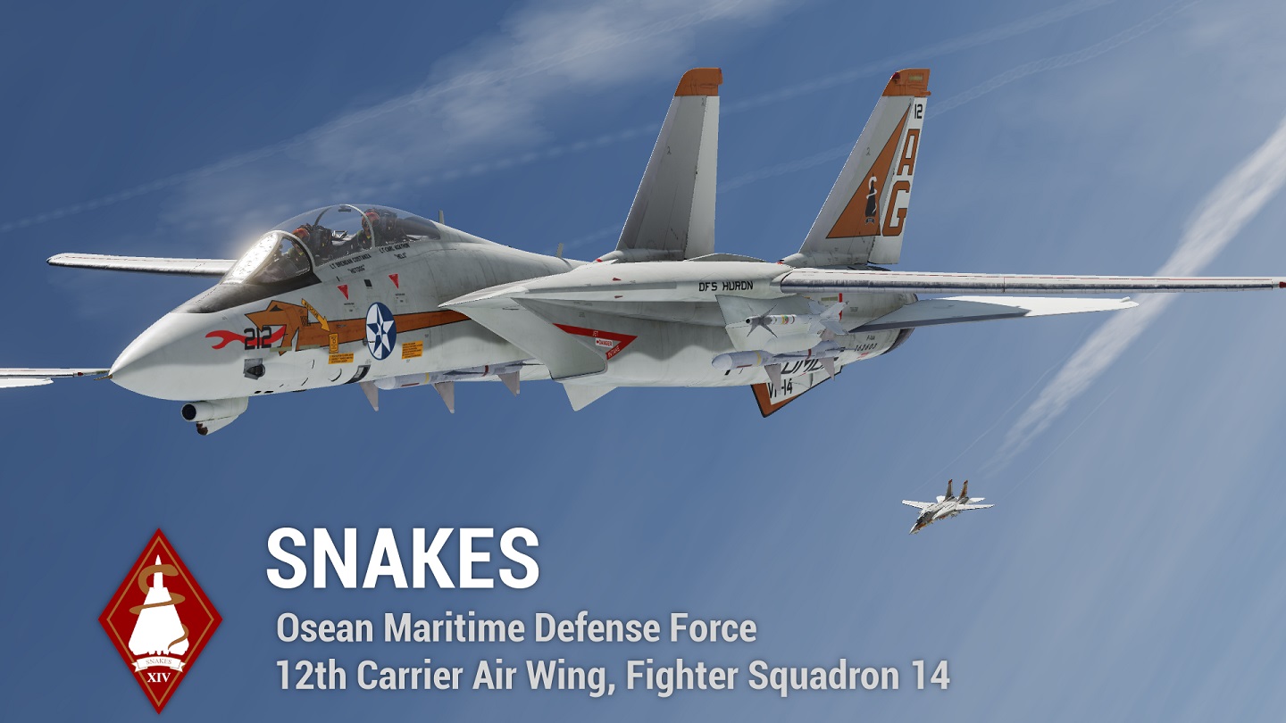 VF-14 "Snakes", was established in 1955 flying the F4U Corsair within Air Wing 34, a notably ground based formation of aircraft. In 1958, the squadron would fly the F3A before receiving the F-4B Phantom in 1965. In 1972, VF-14 Would join VF-616 "Gargoyles" in flying the F-14A Tomcat with Carrier Air Wing 14 aboard the OFS Heron deploying the first time to WESTPAC 1976 Along with the Gargoyles.