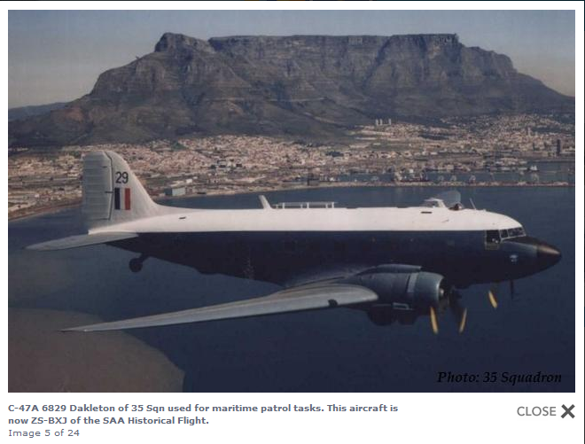 35 Squadron based at Ysterplaat airfield, Cape Town still operate an up-engine turboprop variant of the C-47 for maritime reconnaissance. Over 80 years of service!