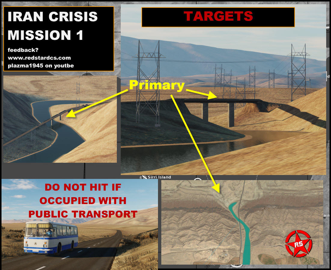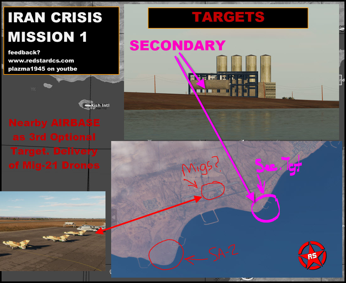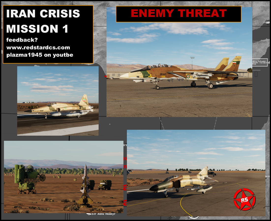 First mission of the Qeshm campaign, in this mission your job is to take off from Al Minhad (for Fast Jets) or Ras Al Khaimah (for Harriers/A10s/Su-25 jets) and find/destroy a build up of new facility on the South West corner of Qeshm Island. There are four ships unloading cargo, a new sam site being built and a communications center. AI assistance can be triggered.