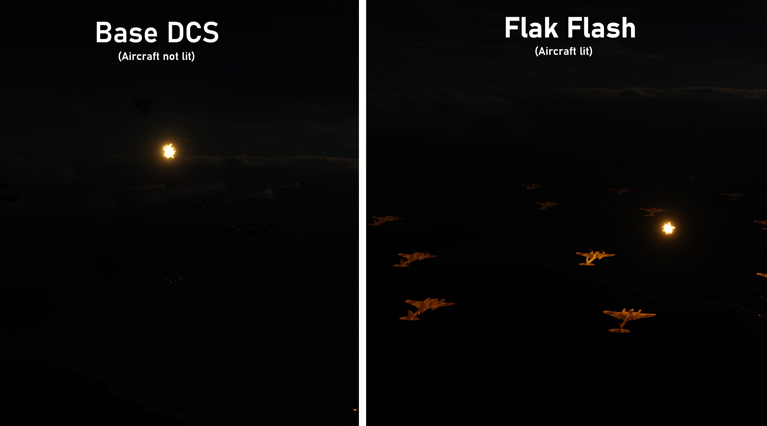 The Flak Flash script enhances nighttime flak fire in DCS by adding explosion light effects. Unlike default DCS, where flak explosions lack additional lighting, this script overlays a configurable explosion at the detonation point, simulating flashes that reflect off nearby aircraft.  It will also reflect in the cockpit, leading to a more immersive (and more petrifying) experience.