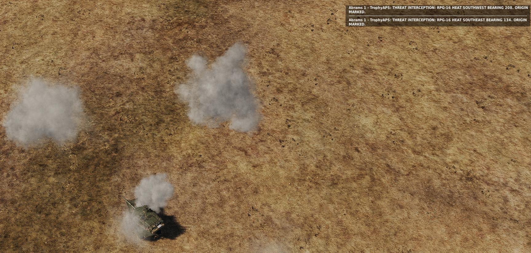 The script tracks weapons heading towards a TrophyAPS vehicle, triggers a small explosion by the unit to mimic the Trophy system and triggers a larger explosion at the co-ords of the incoming weapon.   The script mimics there being a Trophy system on the front right and back left of the vehicle, with each launcher having 4 rounds. This was tested using the Abrams.