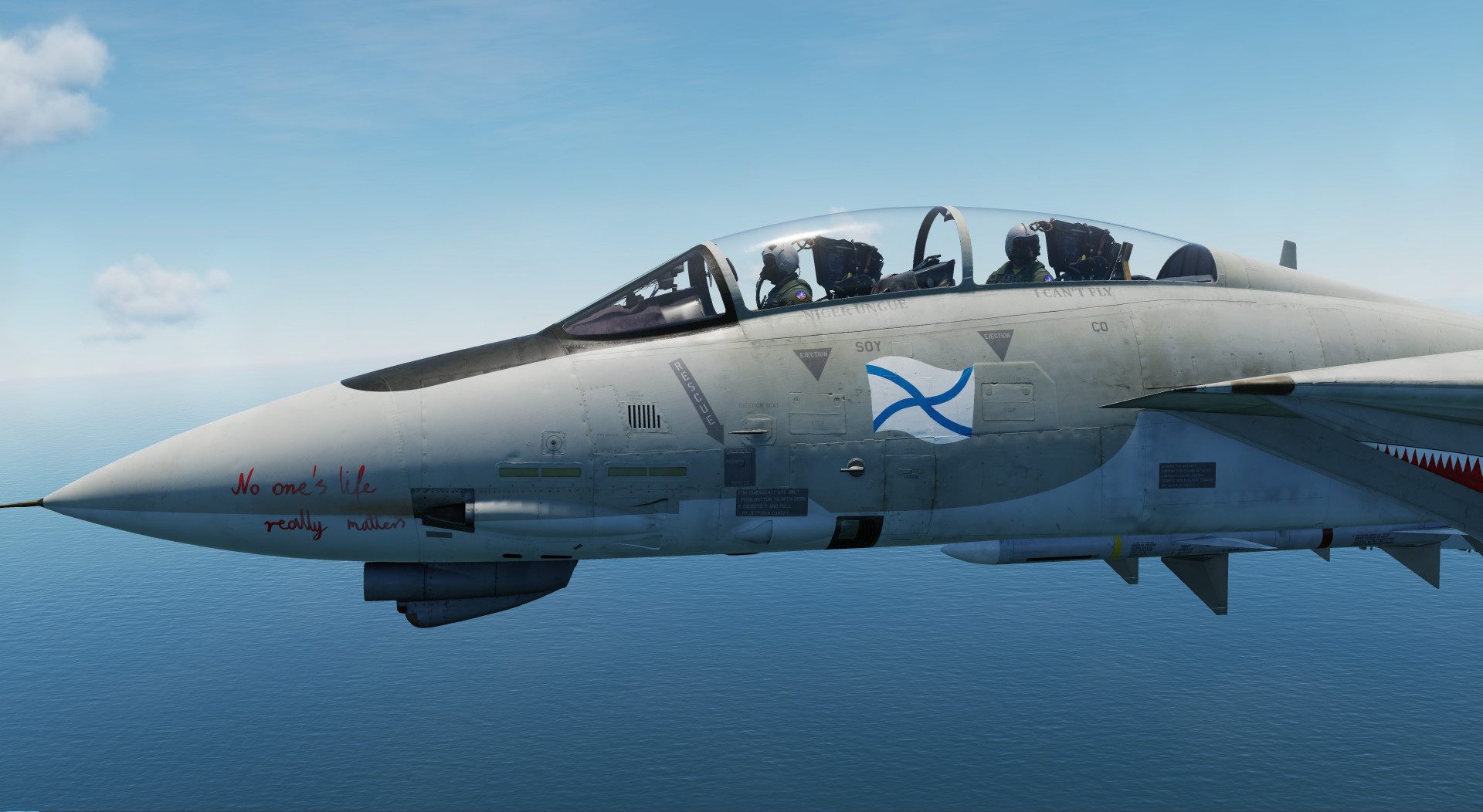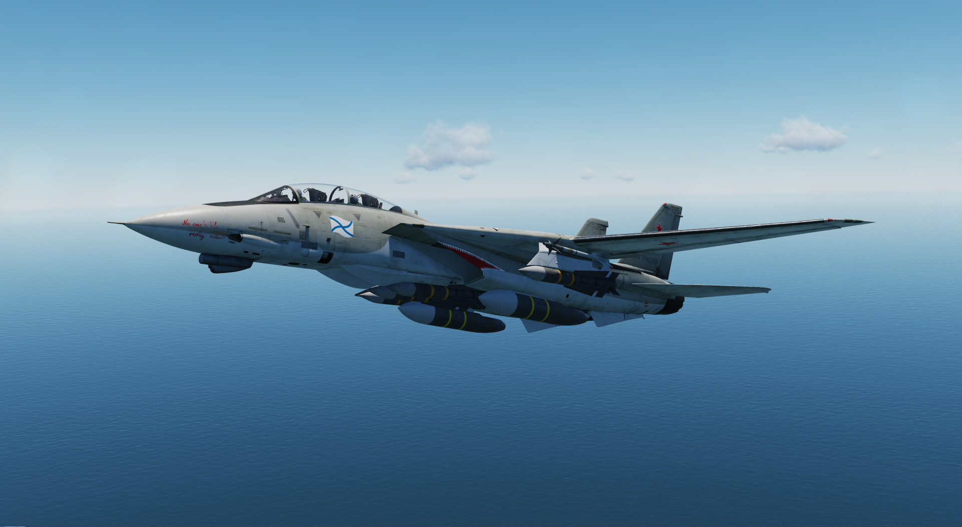 A skin based to some extend on one of Russian Navy TU-22M3 which have shark jaw painted on its air intakes, comes with fake AIM-54C (external tanks). Comes with two versions , jaw version with some additional text and black paint on top of the nose to prevent sun glare, as well as version without those features for your wingmans. I could put text in Russian but I didn't wanted to butcher anything.