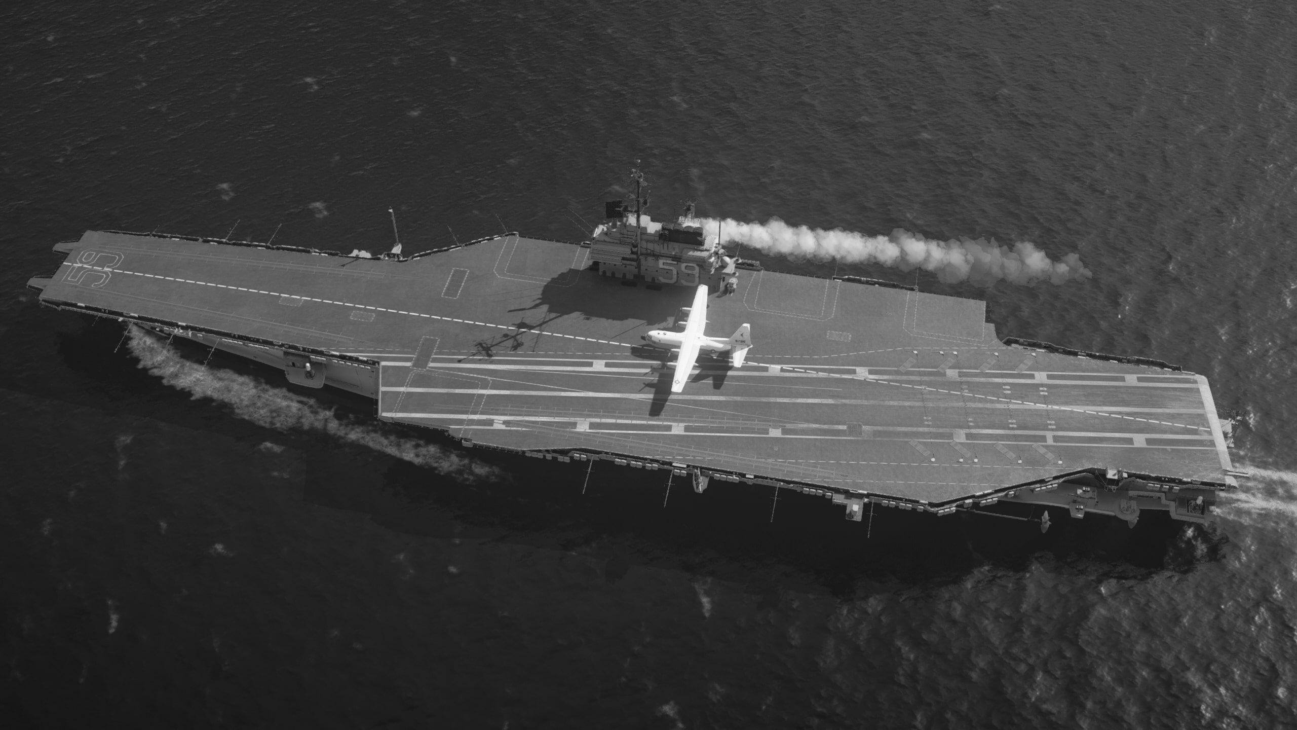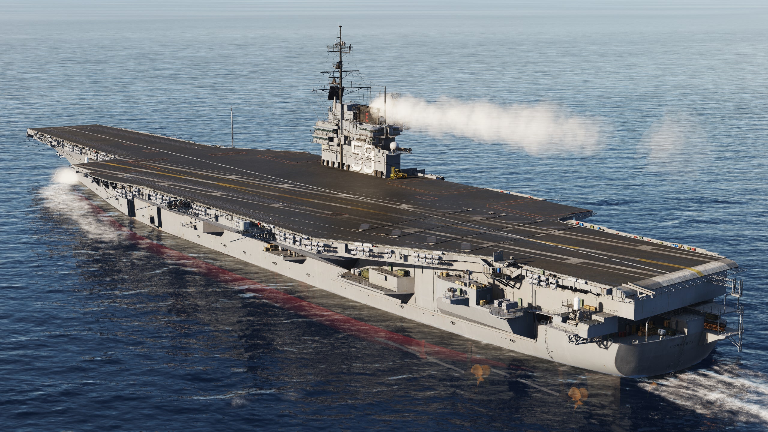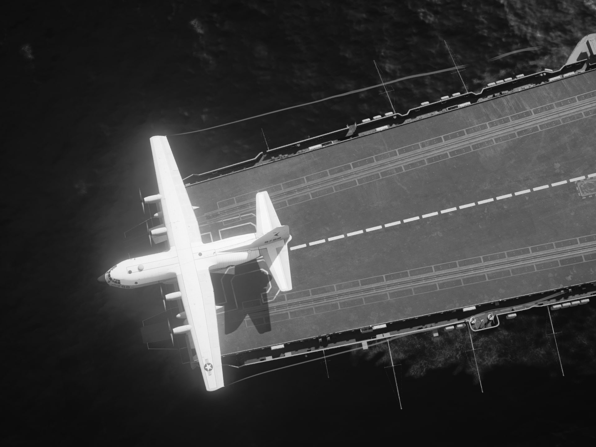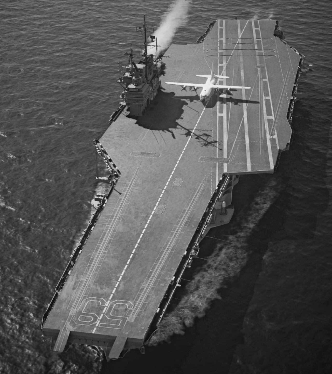 A representation of CV-59 USS Forrestal in late 1963, for the tests of landing a C-130 Hercules for the purpose of Carrier On-Board Delivery.