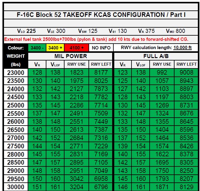 This is the chart with Viper total weight (lbs), rotation speed (KCAS), lift-off speed (KCAS), runway used (ft), runway left (ft) and some other speeds limits for the jet based on all available real life data, conversions, manuals, etc. Real F-16 pilot took a look at these and his comment was: "this is the closest you'll ever get" - that's good enough for me boys (and girls). Every line has been tested at Incirlik AB, TUR, runway 05 with DCS 2.7 yesterday. It helps me when I plan a missions, no wind, airport elevation at 163 MSL. Hope it will help you with smooth 10° nose up. PDF is A5 size, MS Excell file also available with out any questions asked. ;-) My email jernejsk@gmail.com, respond time 24h or less, depending on my work load.