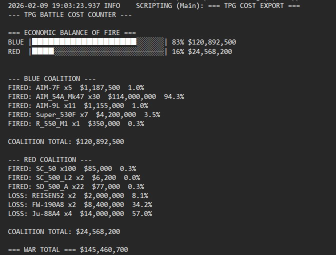 There are many like it but this one is mine, a live on screen (or hidden) unit/model specific mission cost calculator with log export function, display options, and user customizable on-board actual unit/sub model and cost database.