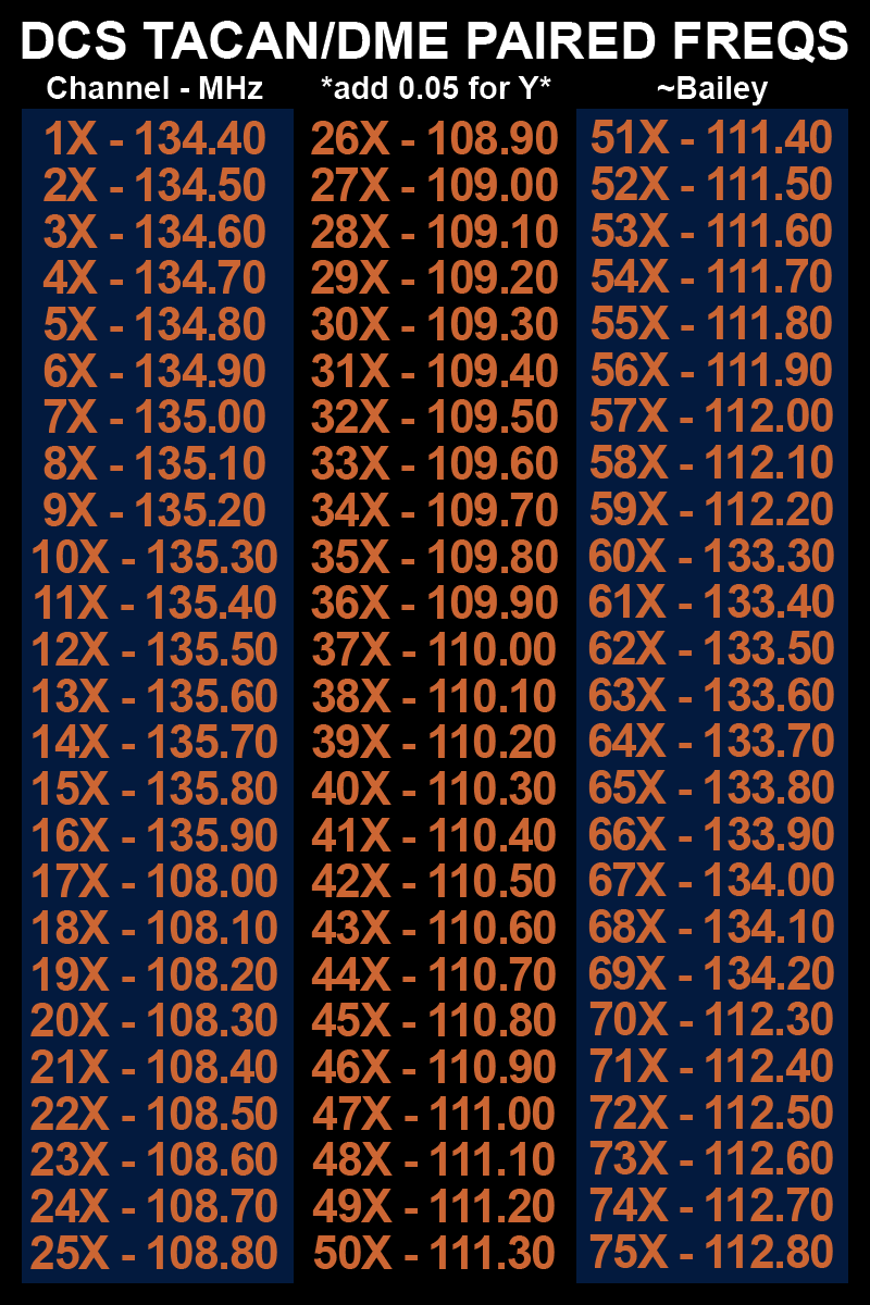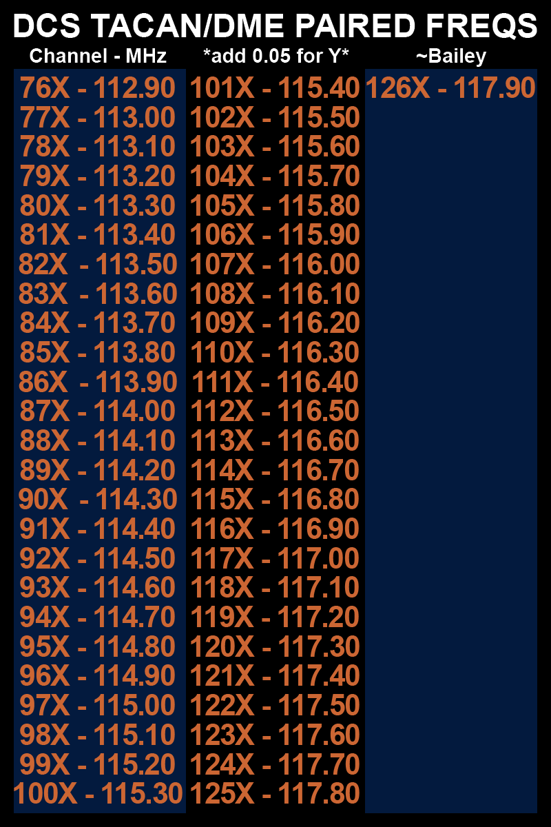 Need that DME from the TACAN, but you don't have a TACAN receiver? Use these kneeboard pages to quickly find out what frequency you can dial to get the DME from the TACAN channel.
