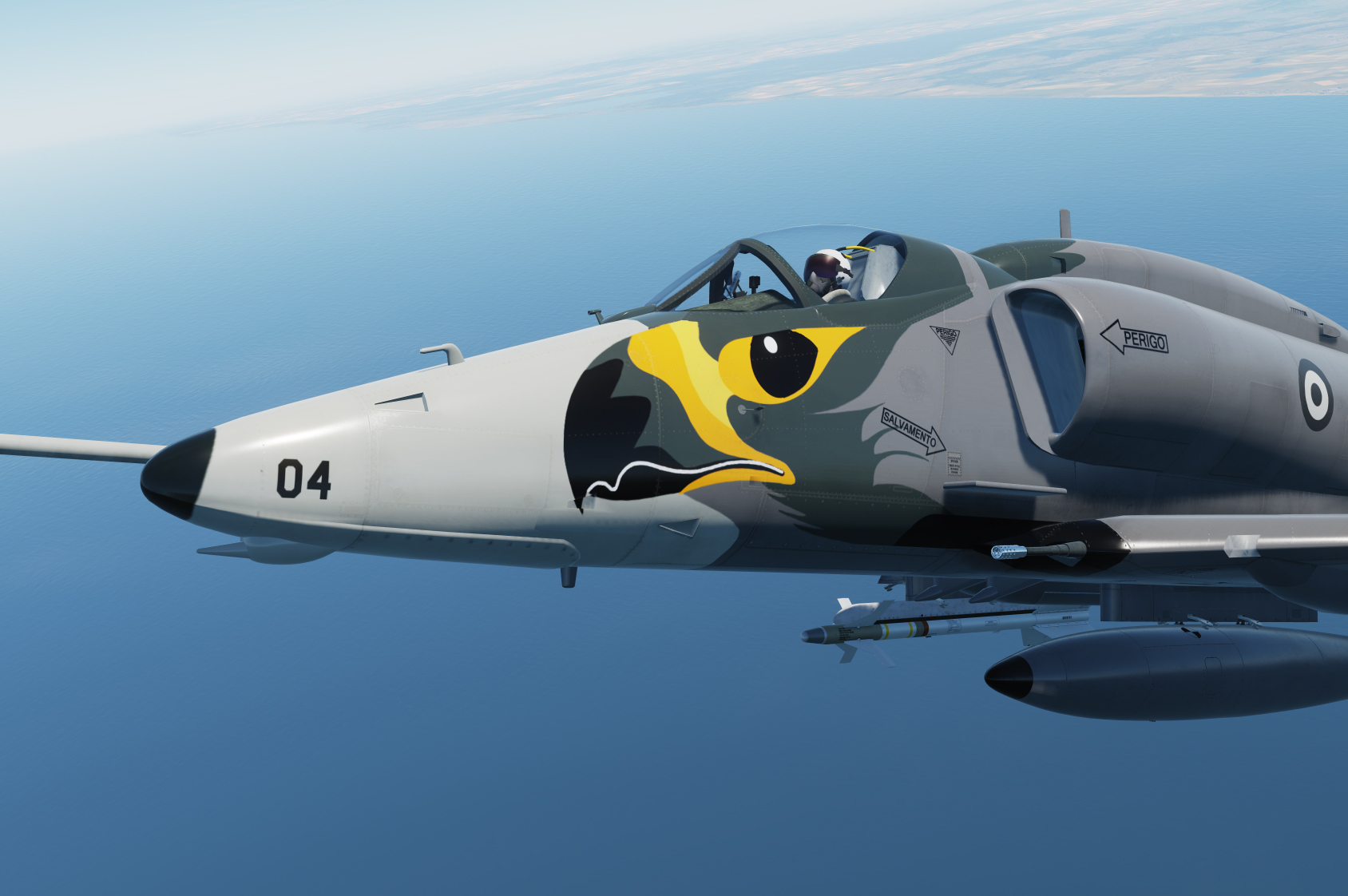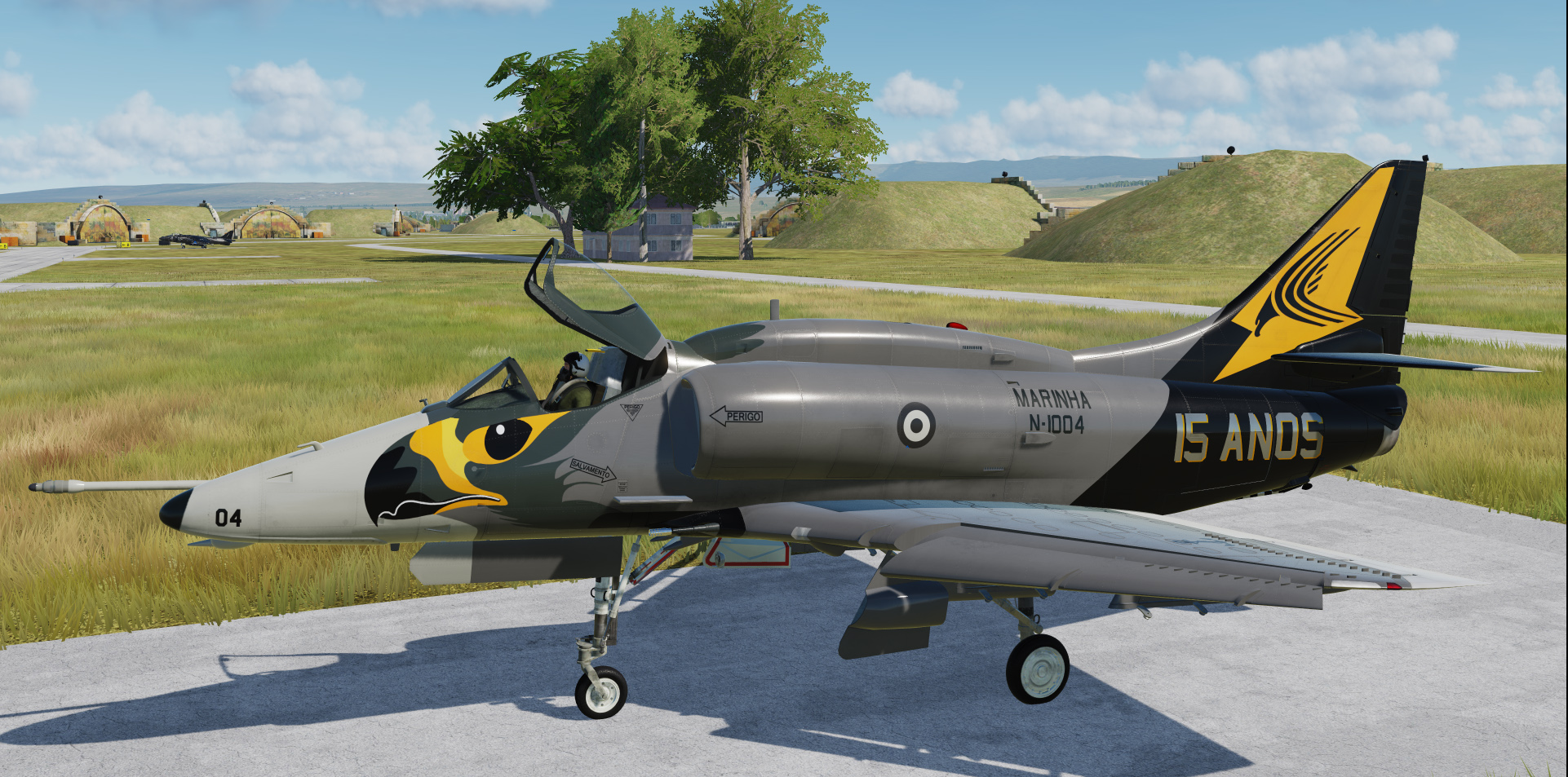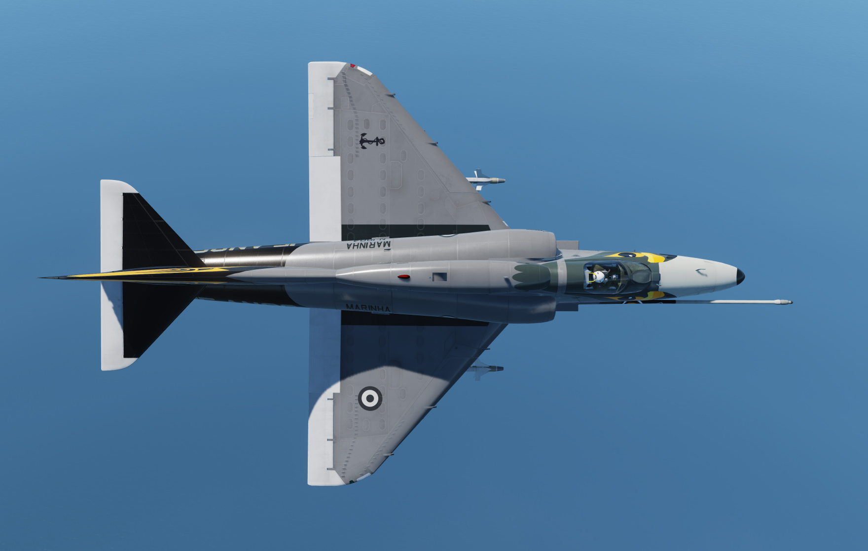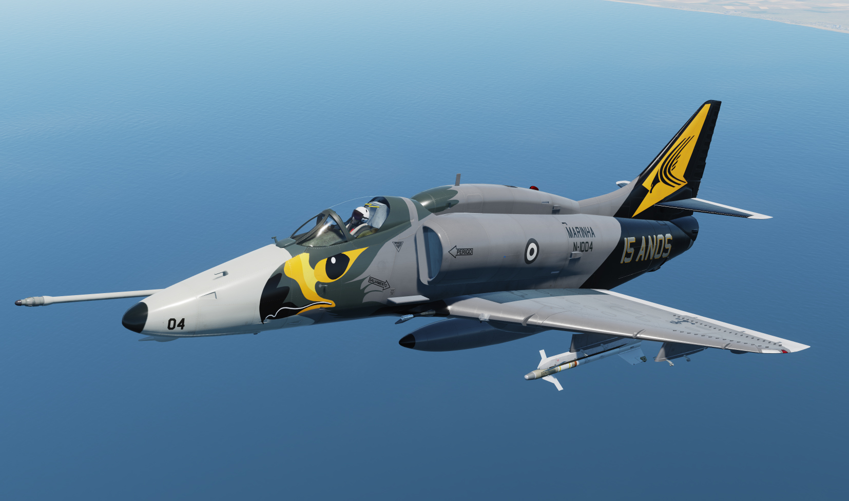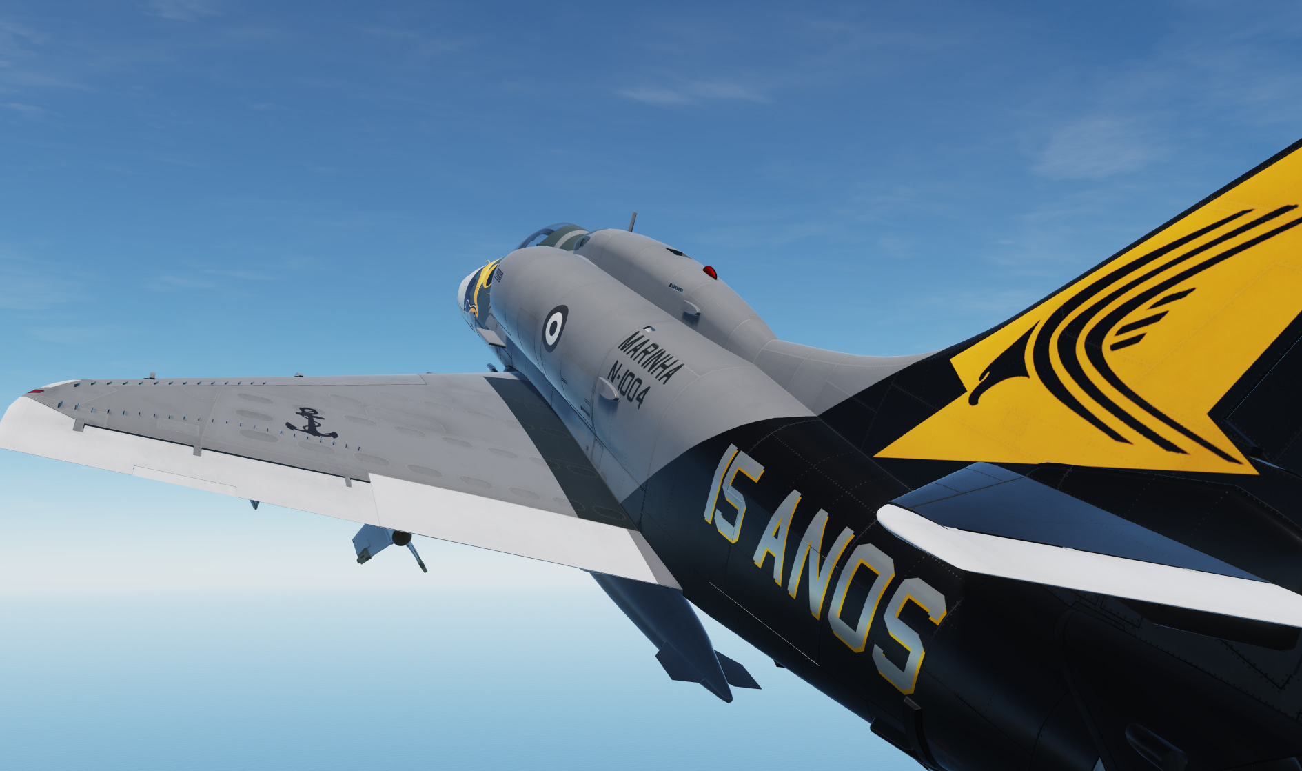 A fictional skin based on a blend of the Gull Grey/Insignia White hi-vis of the Royal Australian Navy VC-724 Squadron, and the US Navy of the 1970s, but with the hawk's head from the Brazilian Navy's AF-1 (A-4KU Skyhawk) and darker grey of the aircraft depicted here: